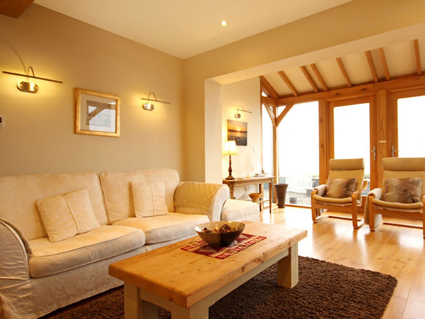 The cosy sitting room has the most incredible views out across the ever changing seascape. Comfy sofas are set around a wood burner. There are chairs which you can turn to face looking out of the windows, too. There’s a flat screen TV, DVD player and hi-fi.