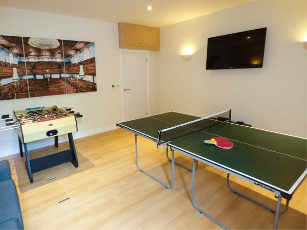 Accomodation Details Over three floors. Eight bedrooms: 1 x super king-size double (zip/link, can be twin on request) with en-suite shower, basin and WC, 1 x ground floor super king-size double (zip/link, can be twin on request) with en-suite whirlpool bath, shower over, basin and WC, 1 x ground floor super king-size double (zip/link, can be twin on request) with en-suite shower, basin and WC, 1 x ground floor double with en-suite shower, basin and WC, 2 x ground floor twin with en-suite shower, basin and WC, 2 x mezzanine twin. Mezzanine shower room with shower, basin and WC. First floor basin and WC. Ground floor basin and WC. First floor open plan living area with kitchen, dining area and sitting area with woodburner. Utility. Ground floor sauna room with changing facility, shower, basin and WC. Games room with table football and table tennis.