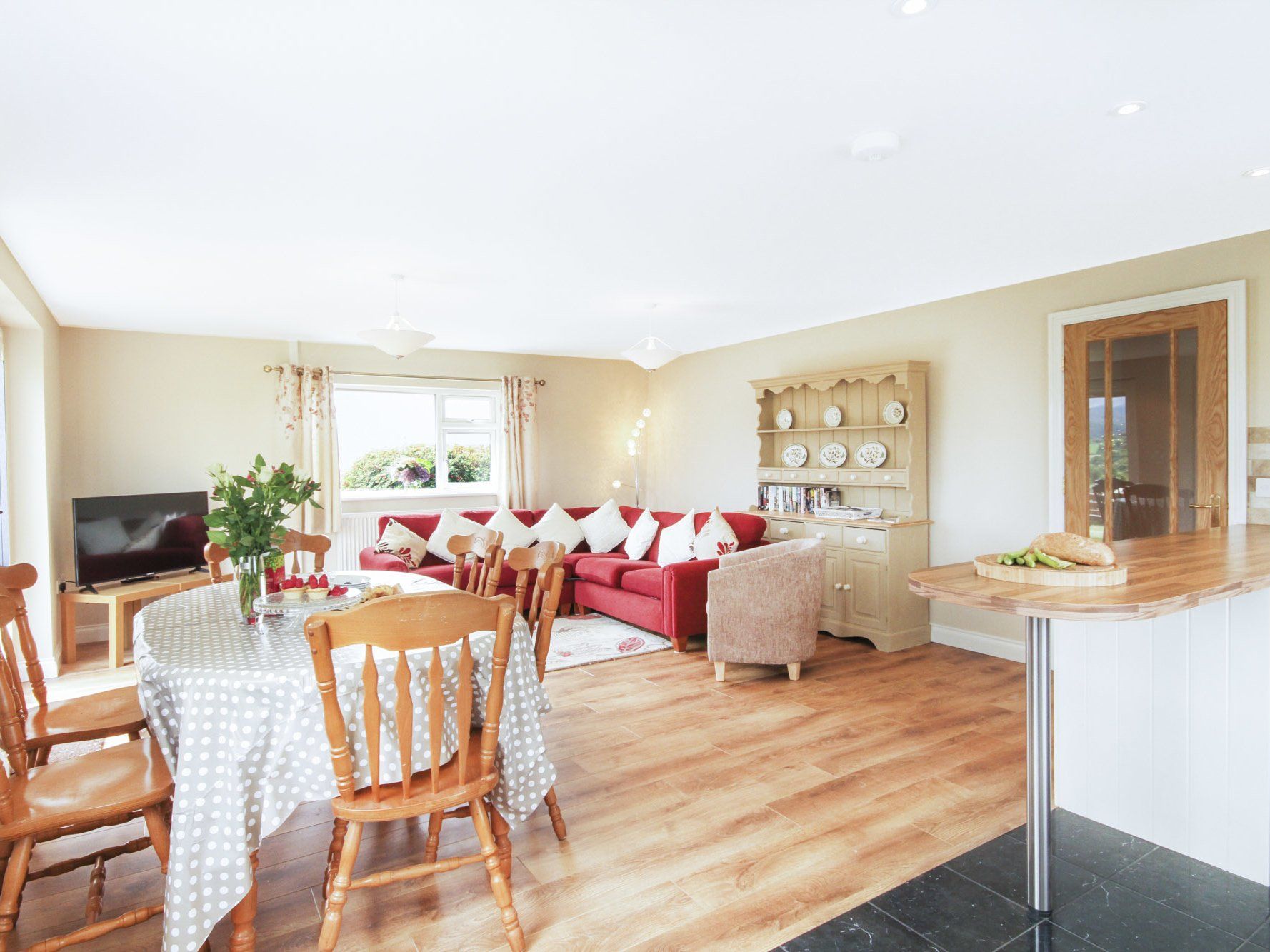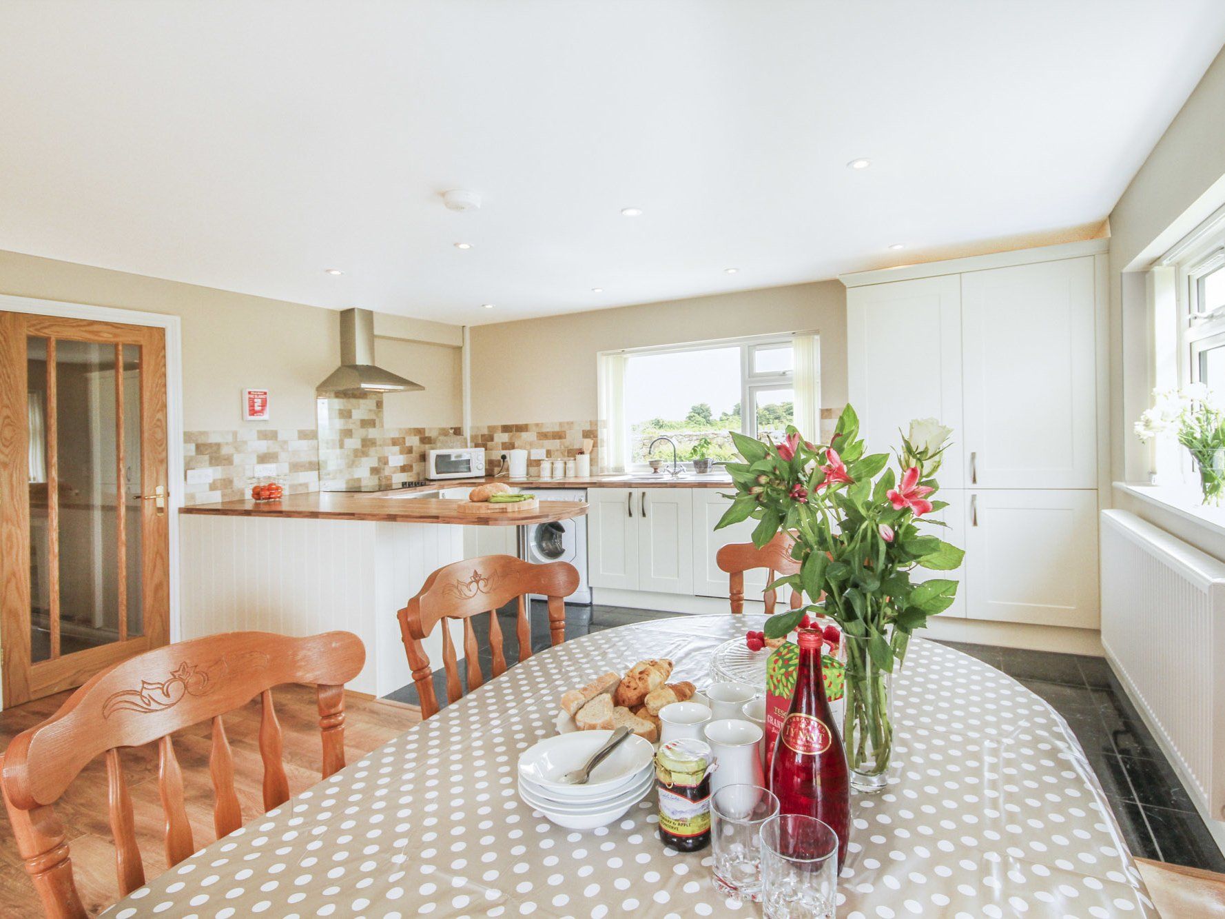 The open plan living space makes for a super sociable holiday cottage! The kitchen is modern and well equipped with all you need for knocking up family meals. There’s a breakfast bar, electric oven and hob, fridge freezer, dishwasher, washing machine, microwave and toaster. There is also a dining table and chairs for six people.