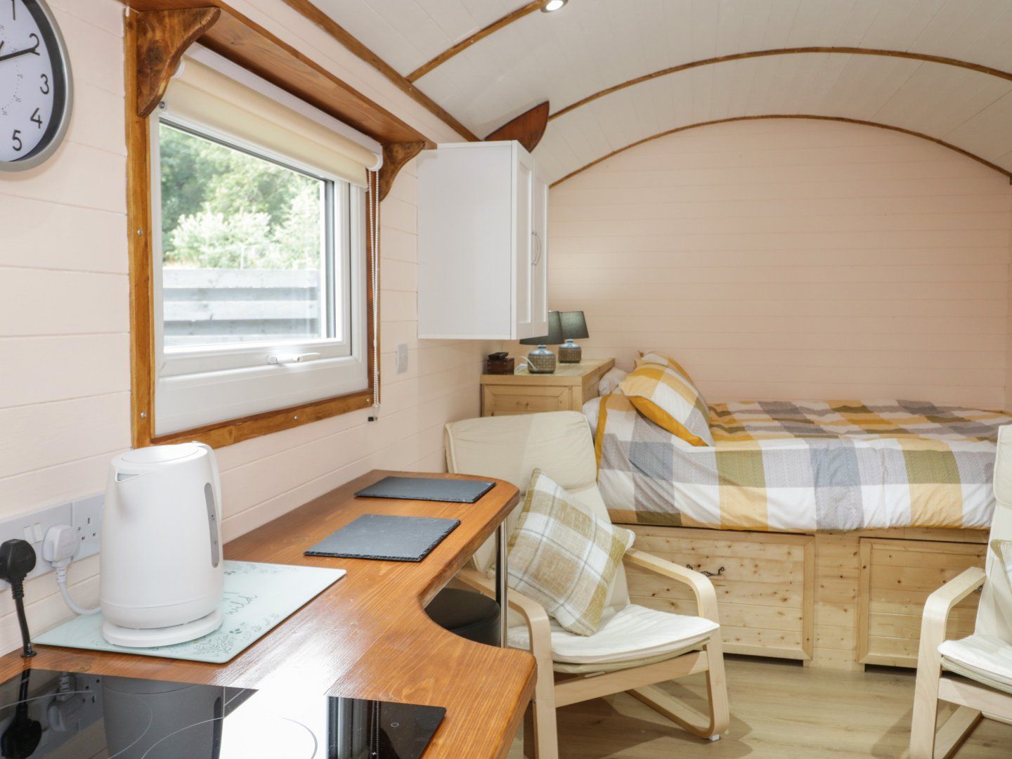 Holiday home Glyder Fach is a charming single-storey shepherd's hut resting on Glasinfryn, Gwynedd. Hosting one double bed in an open-plan layout, along with a kitchen, dining area and sitting area with an electric stove, this property can sleep up to two guests. There is also a shower room and a garden with a lawned area, decking and furniture. Glyder Fach makes a fabulous escape for a couple or solo traveller to explore North Wales. Note :The WiFI can be temperamental due to the location and the metal hut. Note: Though the property is on one level, there are 4 steps between the entrance and the lawned area of the garden. Note paddle boards and inflatable kayaks available for free, wetsuits not included. Please note: This property may not be suitable for those using public transport.