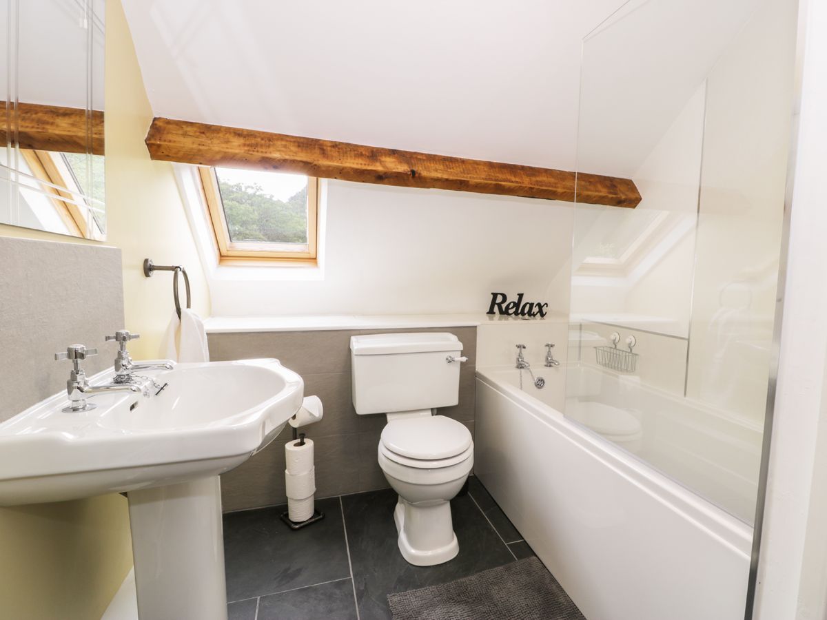Oil central heating with woodburning stove. Electric oven and halogen hob, microwave, fridge, fridge/freezer, drinks fridge, dishwasher, washing machine and tumble dryer in external utility room, TV with Sky, DVD, Bluetooth speaker, WiFi, selection of books, games and DVDs. Fuel, power and starter pack for stove inc. in rent. Bed linen and towels inc. in rent. Ample off road parking. Secure bike storage inc. outside bike cleaning area. Front patio with picnic table, rear courtyard with furniture and a lawned garden with a separate mini outdoor football pitch (shared with owner). Sorry, no smoking and no pets. Shops 5 miles. Pub with restaurant 2 miles. Note: Upstairs bedrooms and bathroom have low exposed beams, sloping ceilings and restricted head height. Note: Regulations required that the twin room was fitted with a top hung Velux window and so does not have a window restrictor, therefore the property is not suitable for children aged 5 and under. Note:The River Mawddech passes the bottom of the garden, please can we ask that children as supervised at all times and care taken near the riverbank.