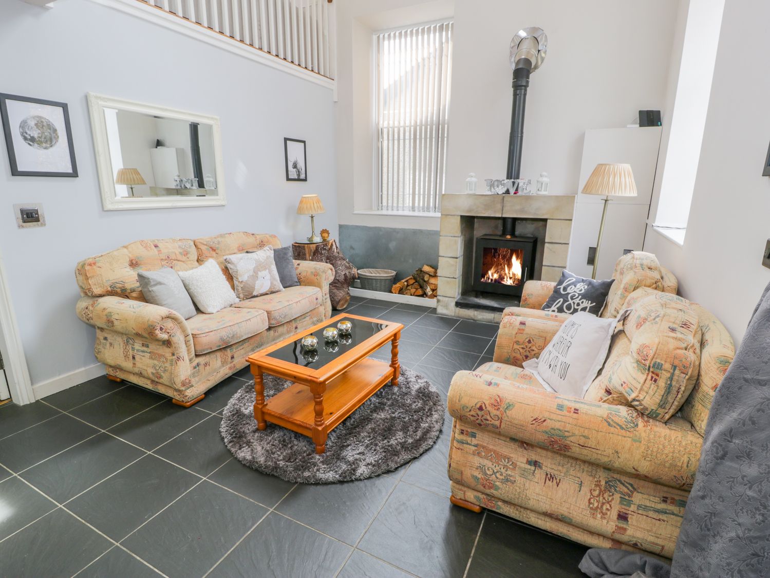 Amenities LPG central heating and woodburning stove. Please note the woodburning stove can only accept logs and will not be in operation until after 24/11/23. Cooker, microwave, fridge/freezer, dishwasher, washing machine, tumble dryer. Smart TV, 2 x TVs with NOW TV, Alexa and WiFi. Pokemon Go Spot. Bed linen and towels inc. in rent. Fuel and power inc. in rent. Please note that a woodburner starter pack can no longer be provided after 14/1/24, although logs can be purchased from a local shop, please only use logs in the woodburner. Roadside parking and bike storage. Front garden area. Sorry, no smoking allowed. Three dogs welcome (not in bedrooms or on furniture). Pub within 0.2 miles and shop within 0.6 miles. Note: 12ft Christmas tree each year