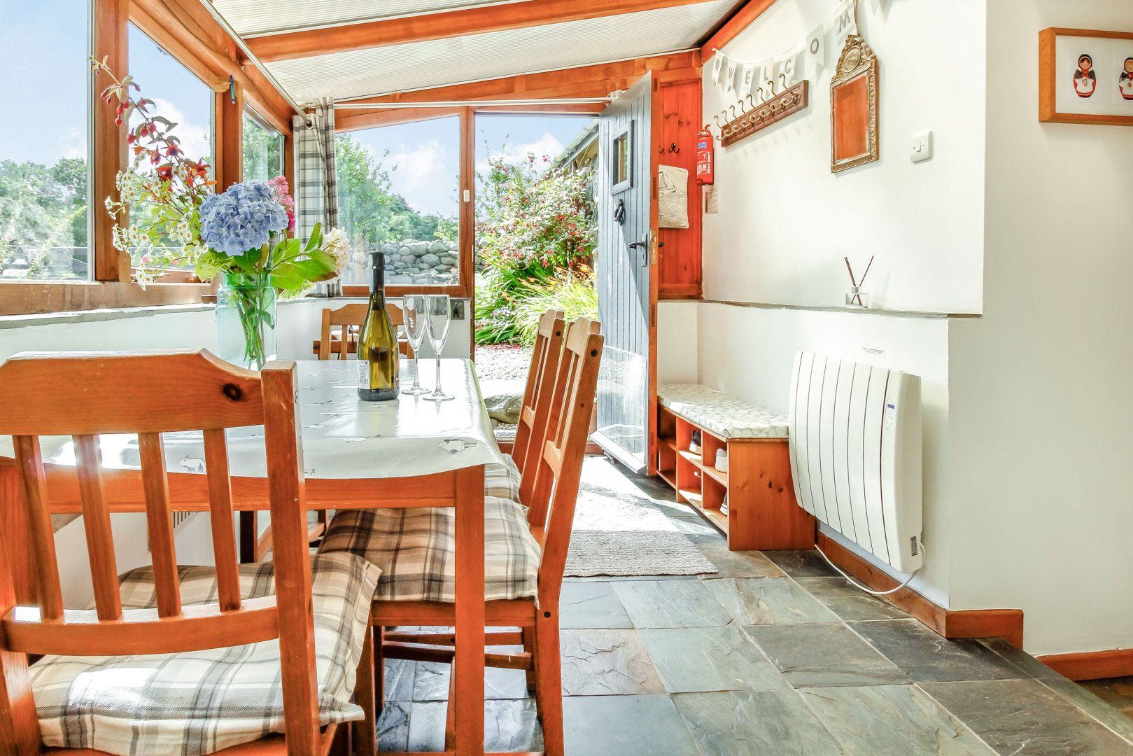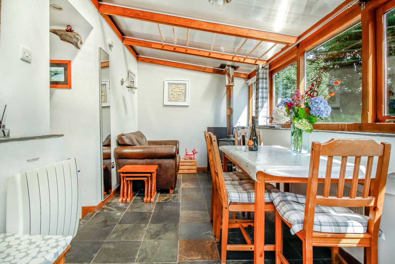 Accomodation Details All ground floor. Two bedrooms: 1 x double, 1 x adult bunks. Shower room with shower, basin and WC. Kitchen. Garden room with dining area with woodburner. Sitting room with woodburner.