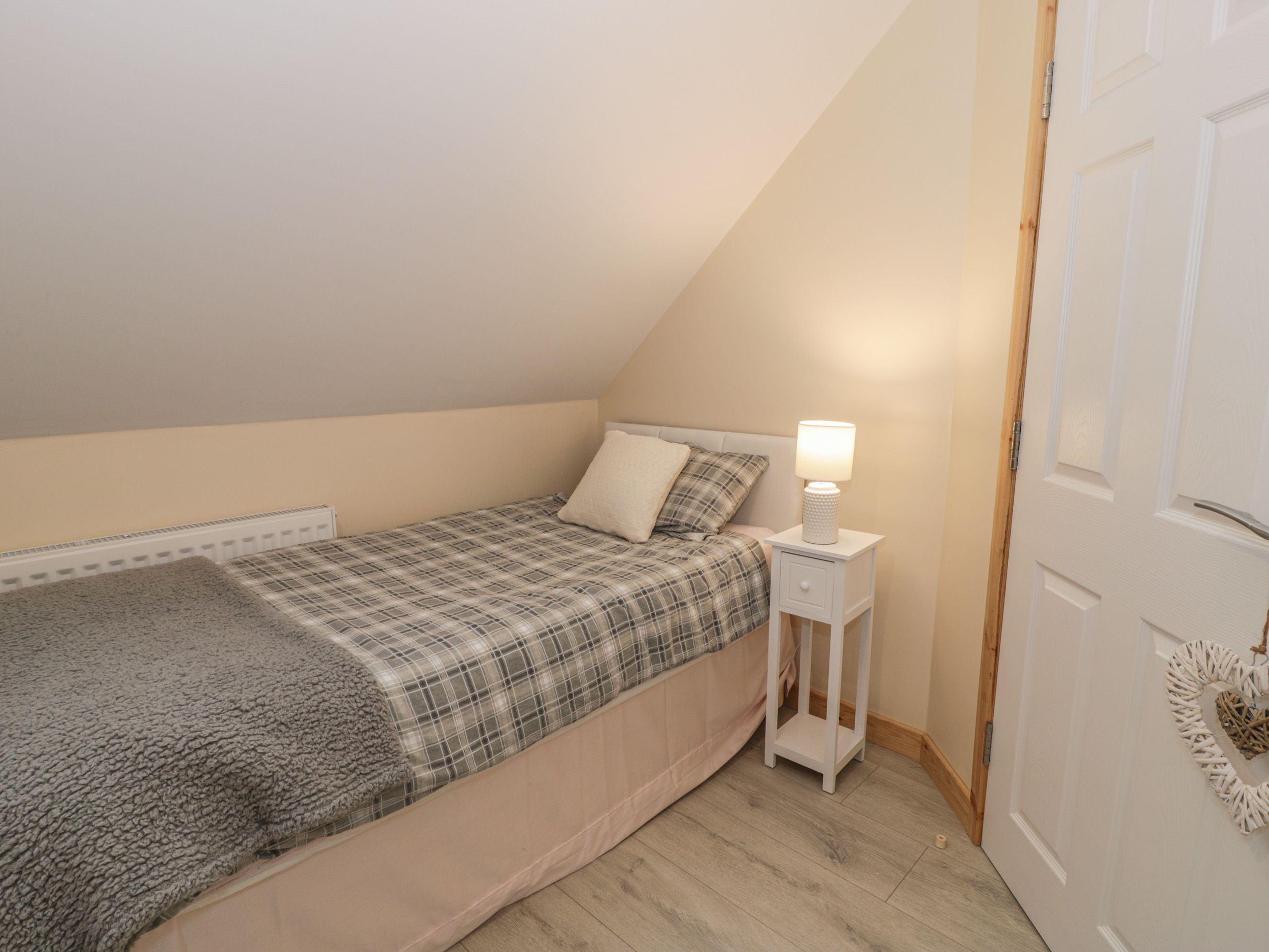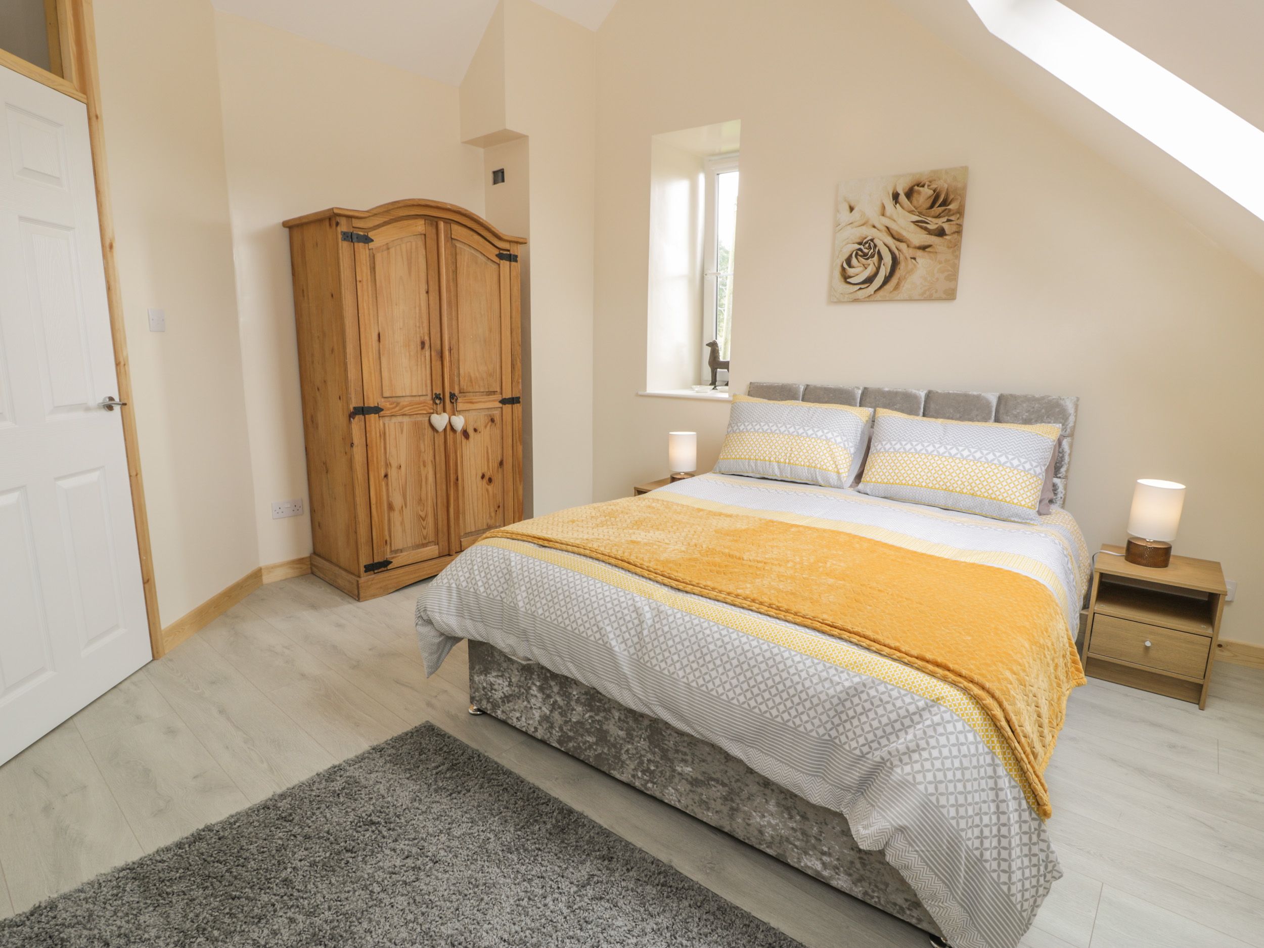 Two bedrooms: 1 x king-size and 1 x twin. Bathroom with bath, shower over, basin and WC. Open-plan living room with kitchen, dining area and sitting area with woodburning stove.