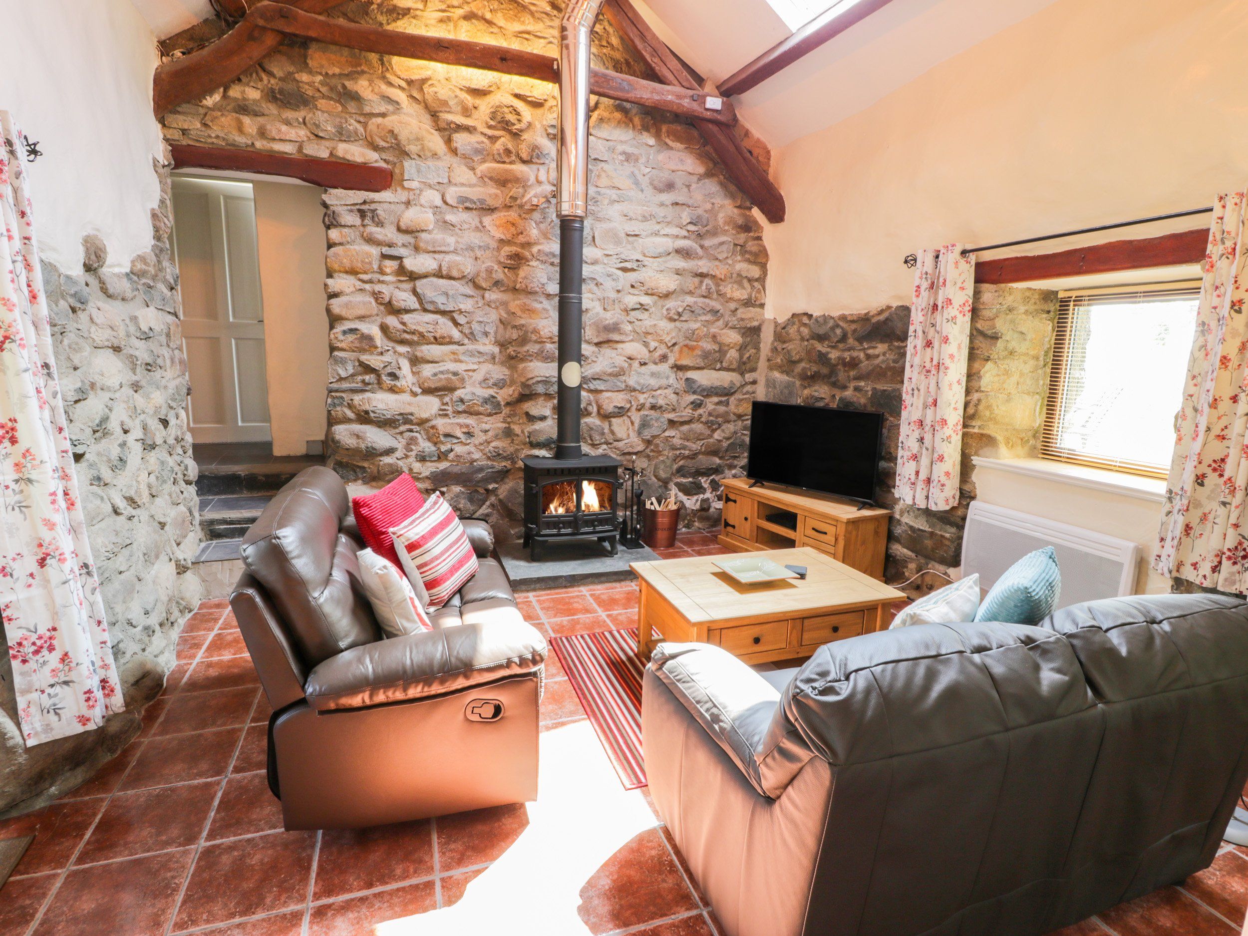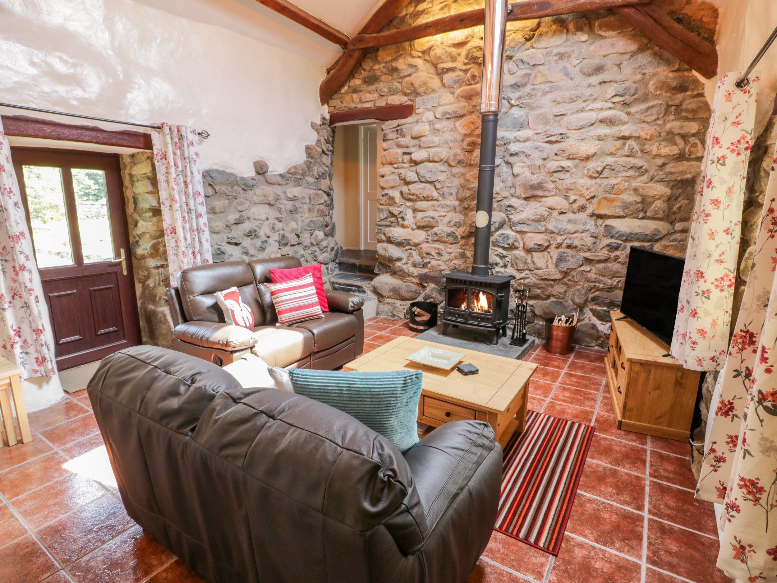 Gas central heating, radiators and woodburning stove. Electric oven and hob, microwave, fridge with ice-box, washing machine, Smart TV with FreeSat, a selection of books, games and WiFi. Fuel and power inc. in rent. Bed linen and towels inc. in rent. Travel cot and highchair available on request. Off-road parking for one car. Rear patio with furniture. One well-behaved dog welcome (downstairs only and not in bedrooms, please bring own dog beds, blankets and towels). Sorry, no smoking. Shop 6.8 miles, pub 5.5 miles. Note: Due to the location of the property, there is no mobile signal, however the internet network will support WiFi calling. Note: Home deliveries are available with Tesco. Note: Private water supply which is tested annually. Note: There is an internal step down to kitchen, shower room and 3 steps to bunk room. Note: Arrival is 4pm. Note: Property can be booked with Ref 1007875 and 1007868, together they can sleep 10 guests. Note:this property is not suitable for more than two adults. Note: the property only accepts a minimum breaks of 3 nights.