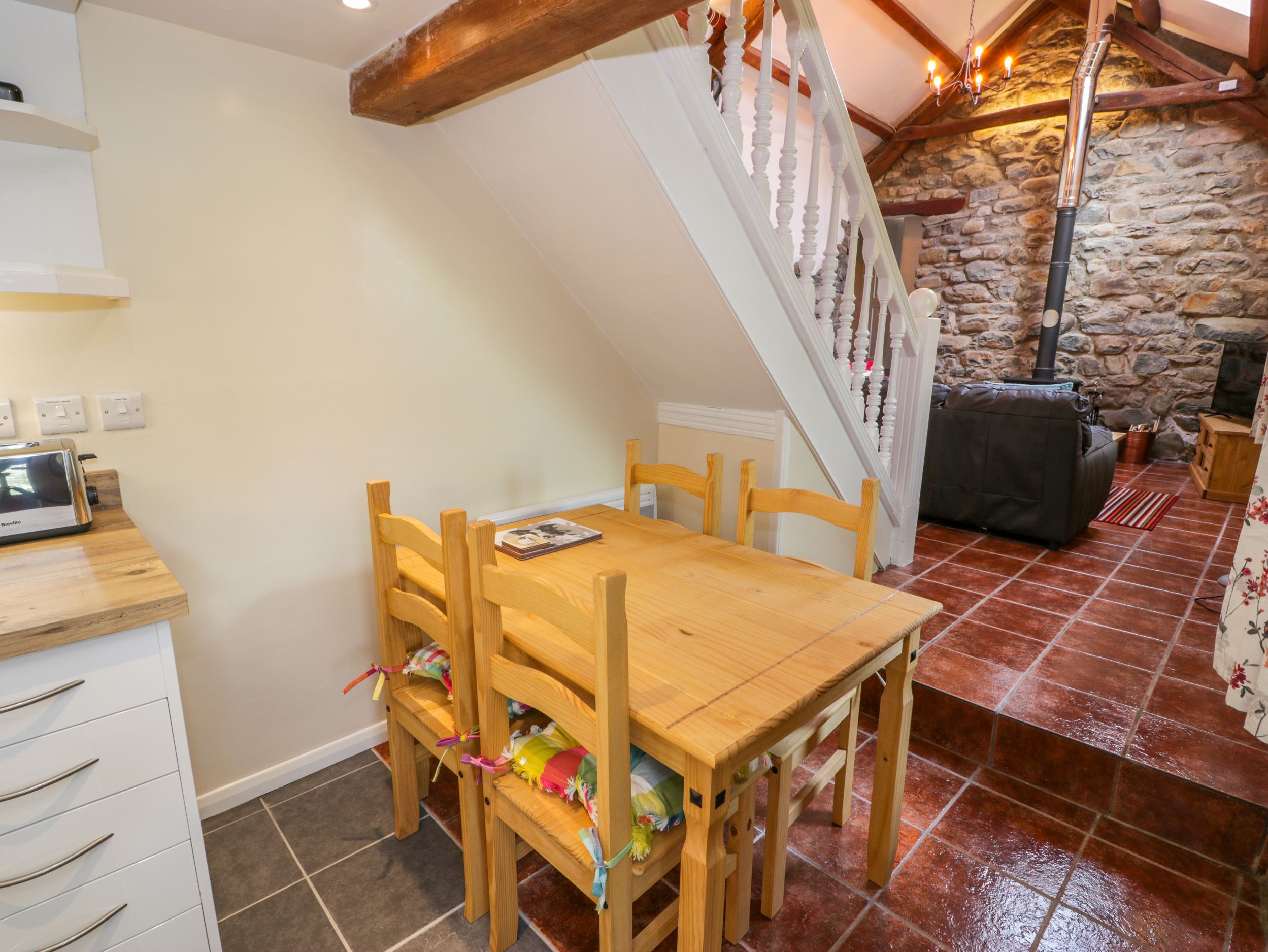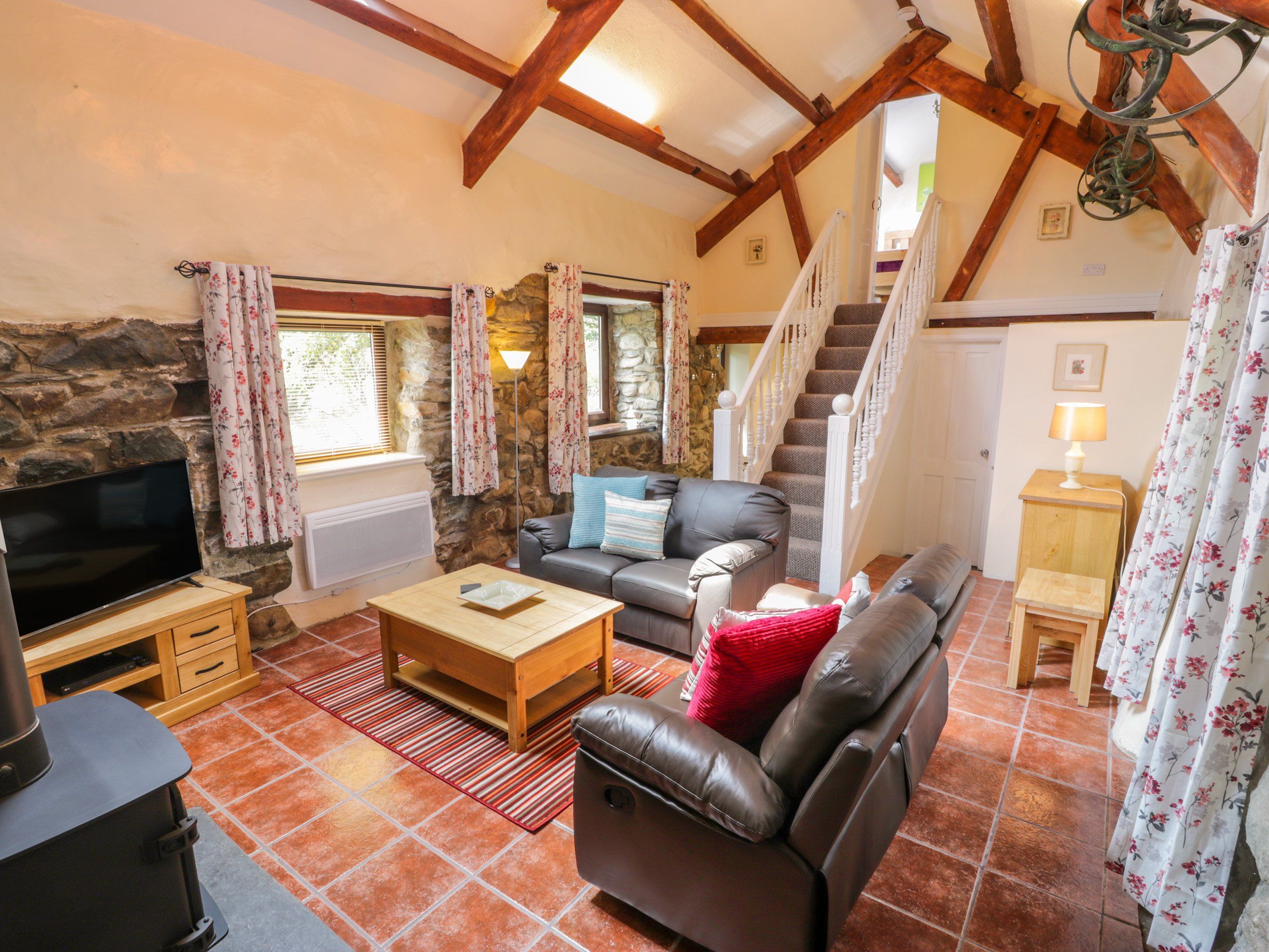 Two bedrooms: 1 x king-size with sloping ceilings, 1 x ground-floor bunk. Ground-floor shower room with shower, basin and WC. Kitchen with dining area. Sitting room with woodburning stove.