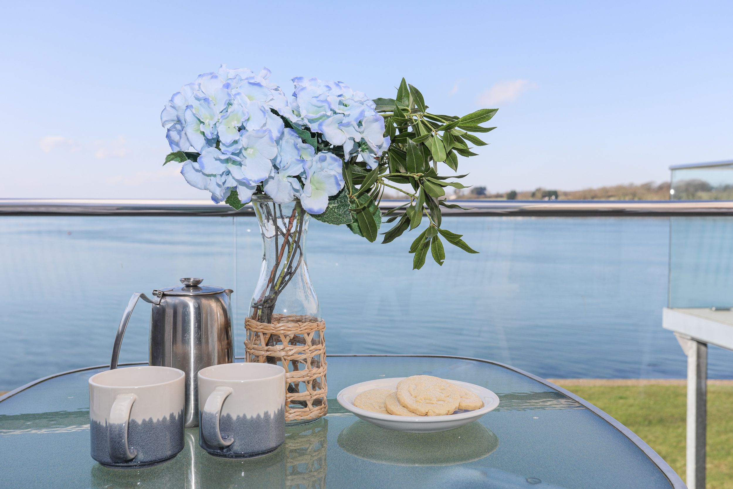 The open plan living area is on the first floor, with a balcony for you to soak up the breathtaking views across the Menai Strait to Anglesey and down to Caernarfon. Furnished with comfy leather sofas, a flame-effect electric fire, TV and DVD player. Sliding doors lead onto the balcony with table and chairs where you can sit and take in the magical views.