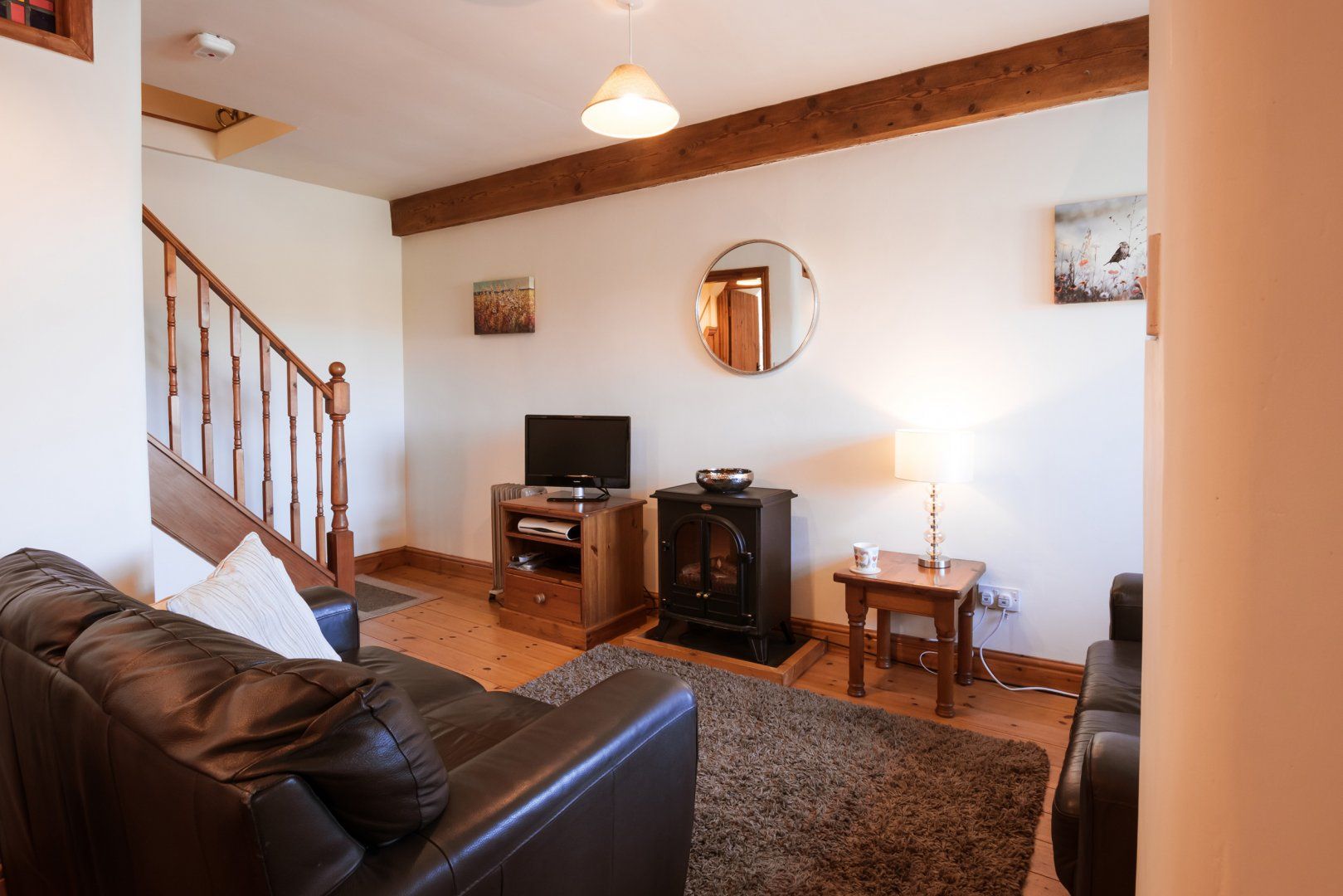 Two bedrooms: 1 x double, 1 x twin. Ground floor shower room with shower, basin and WC. Open plan living area with kitchen, dining area and sitting area with woodburner-effect electric stove.