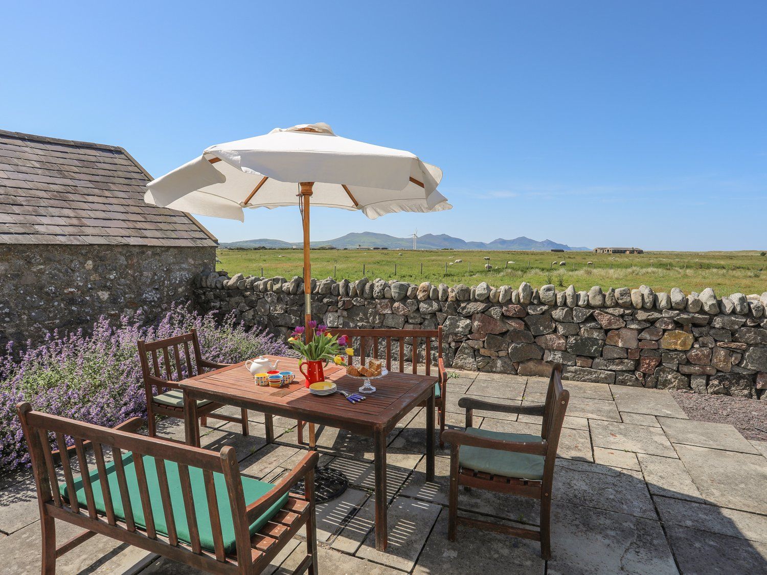 The farmhouse is surrounded by large spacious gardens in a tranquil setting with glorious views for miles and peace and quiet, ideal for dogs!