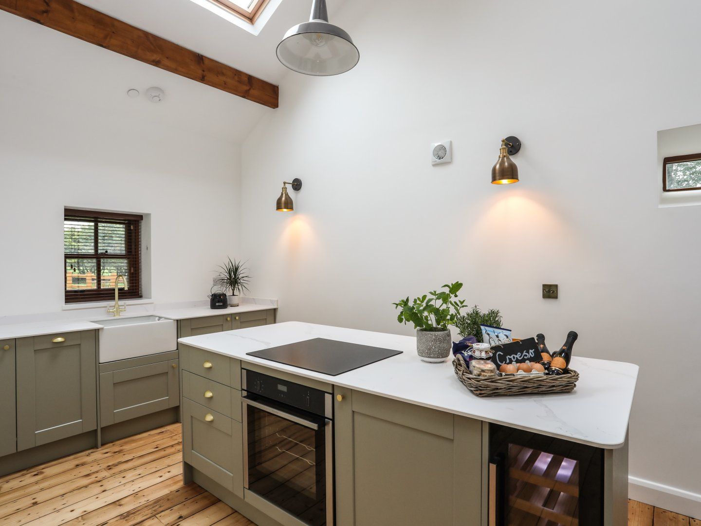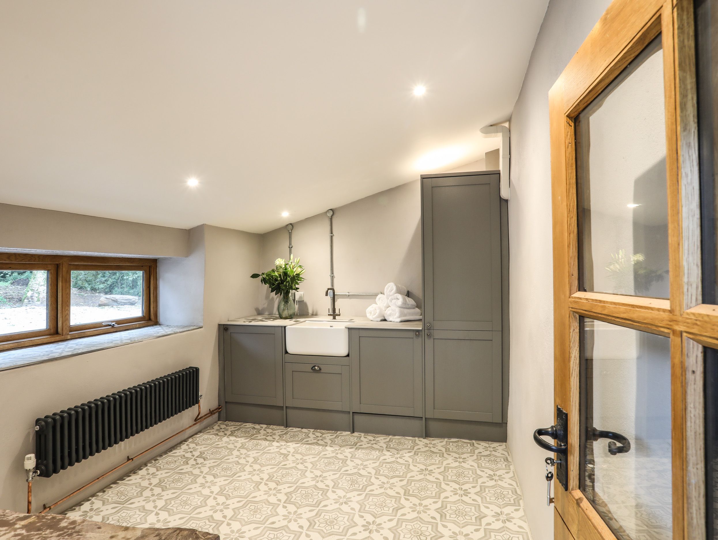 All-ground-floor. Two bedrooms: 1 x king-size open plan with en-suite freestanding bath, hand-held shower, basin and WC, 1 x twin with open plan en-suite walk-in shower, basin and WC. Open-plan living space with kitchen, dining and sitting area with woodburning stove. Utility with washing machine. Open plan en-suit for both rooms