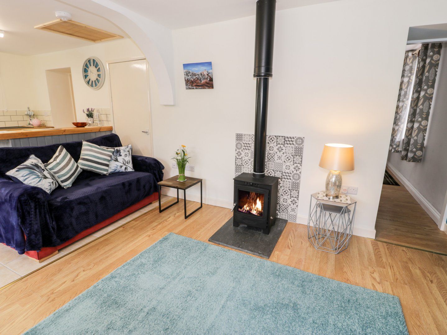 One double bedroom. Shower room with double walk-in shower, basin and WC. Open plan living area with kitchen area, dining area and sitting area with wood burning stove.