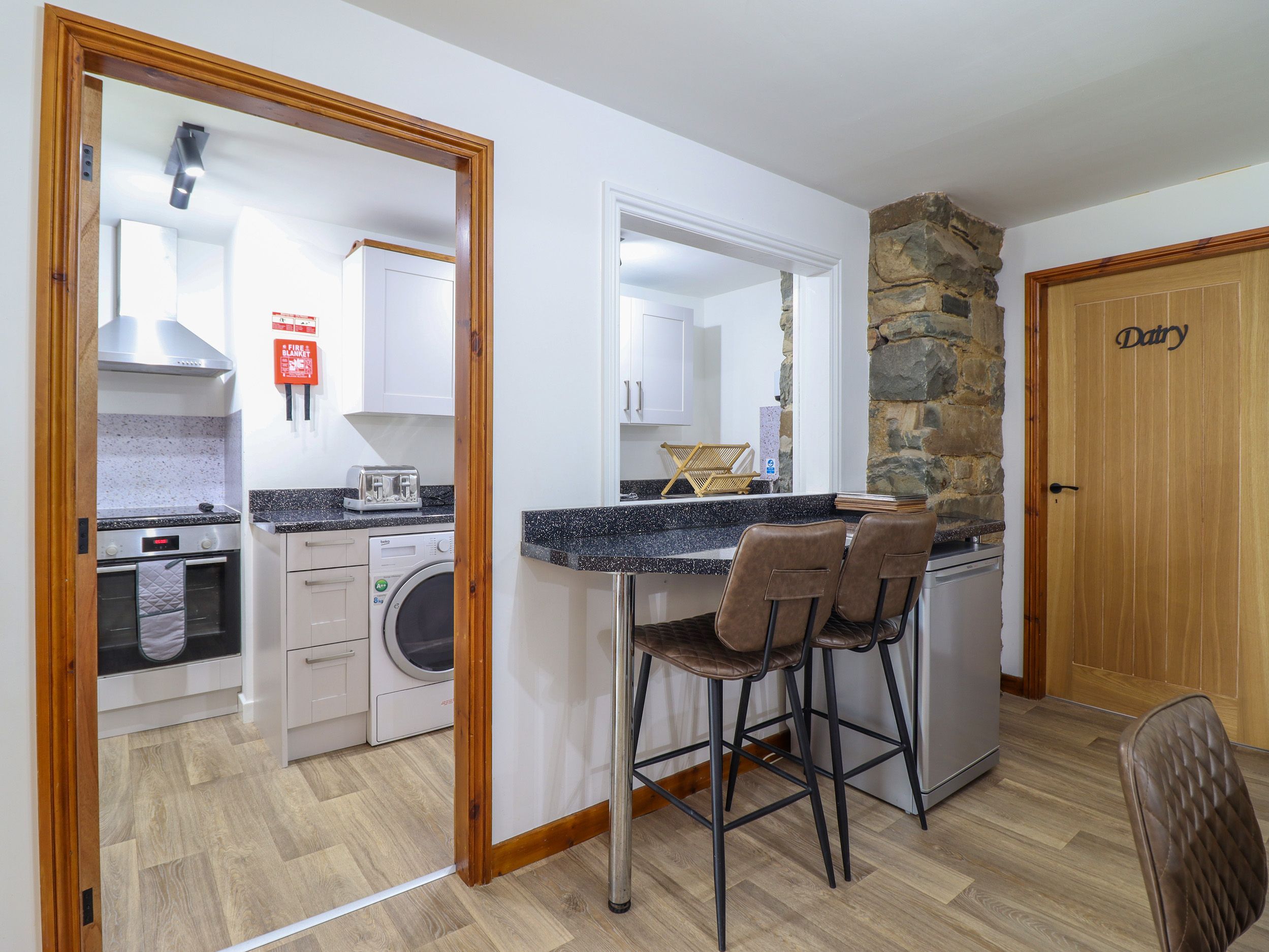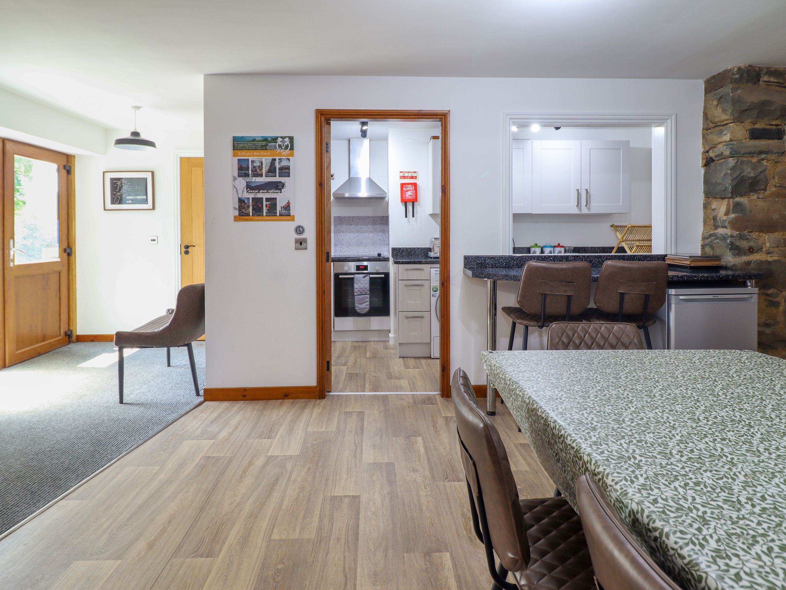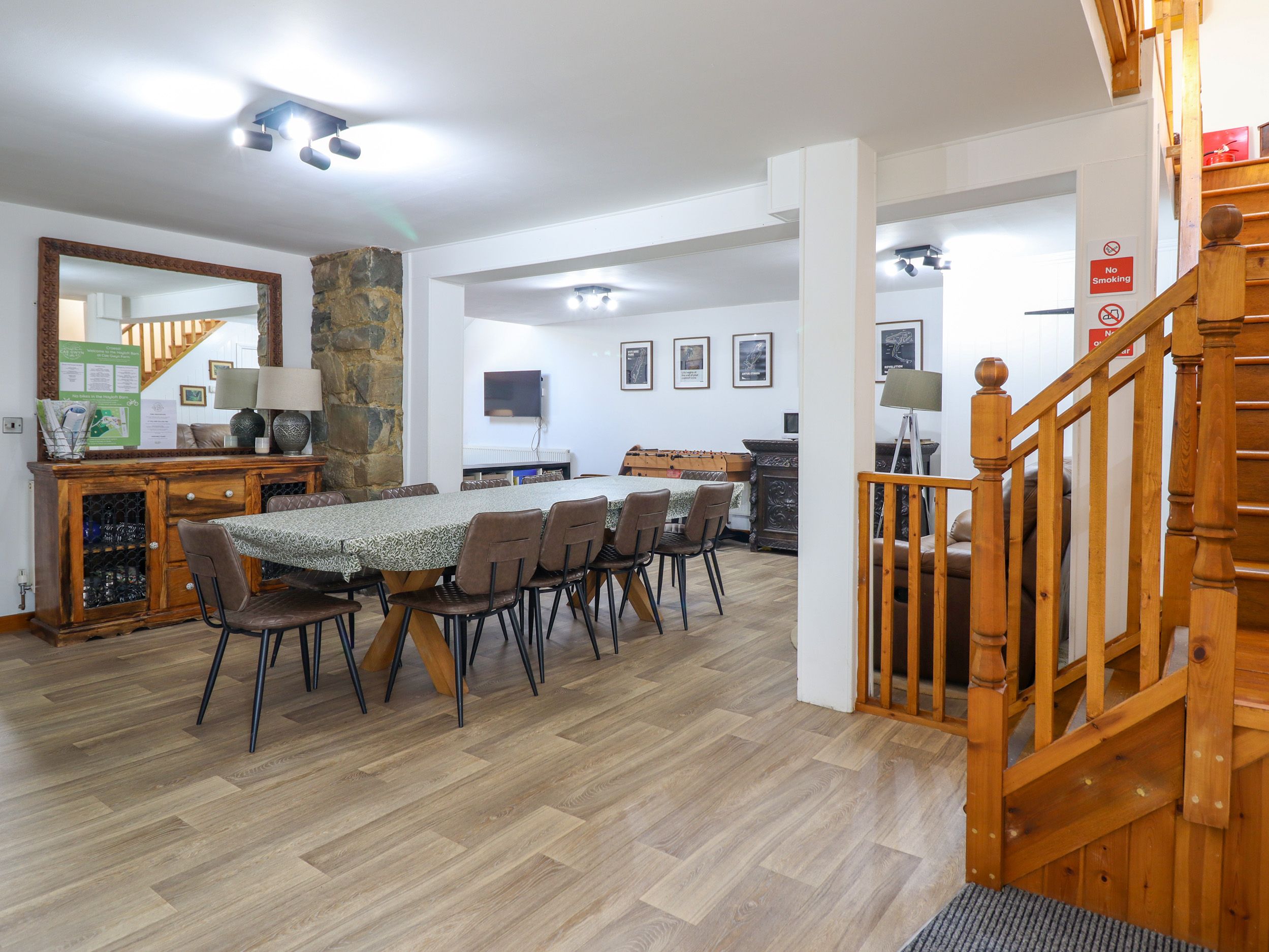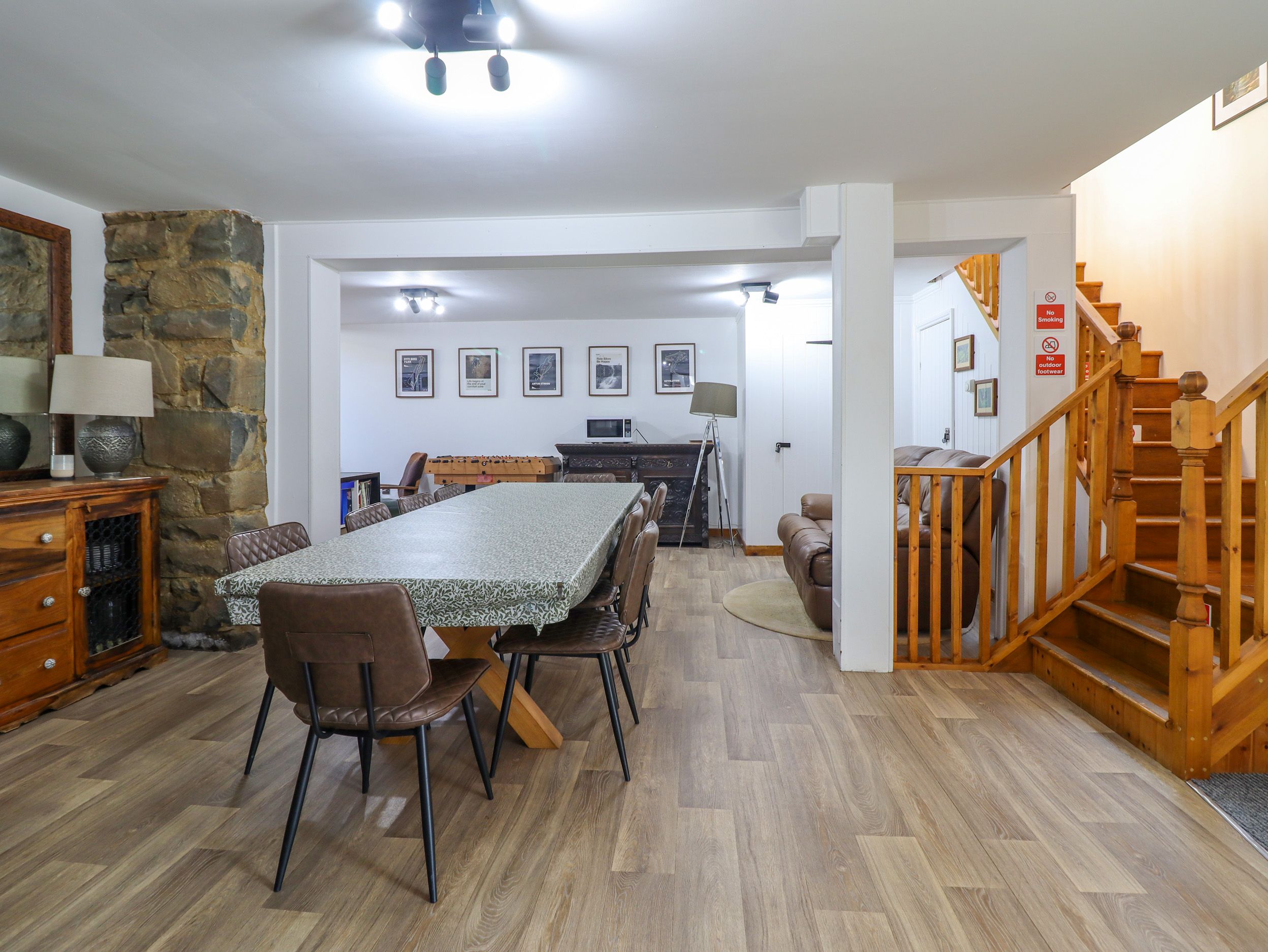 Holiday home Hayloft Barn, a stone-built barn, consists of a kitchen with breakfast bar seating two, two fridges, microwave, kettle, toaster, electric oven and hob, dishwasher, washing machine, and tumble dryer, and a utility with boot dryers, iron and ironing board, and walk-in shower and separate WC and basin. There is a dining room with seating for 10, books, board games, table football, maps, and a sitting room with Smart TV. The bedrooms consist of a ground-floor triple, two twins, and a family room, all equipped with TVs and en-suite shower rooms with a walk-in shower, basin and WC. Outside, there is a non-enclosed front patio with a picnic bench, and off-road parking for four cars. Two well-behaved dogs are welcome. Sorry, no smoking. WiFi, fuel power, bed linen and towels are all included. You'll find the closest shop in 3.6 miles, and a pub in 4 miles. Hayloft Barn is a guaranteed memorable getaway. Note: Check-in from 4pm, check-out 10am. Note: All MTB courses or guiding need to be booked prior to arrival. Note: This property has a Good Housekeeping bond of 400 GBP.Please Note: The Property only accepts a maximum occupancy of 8
