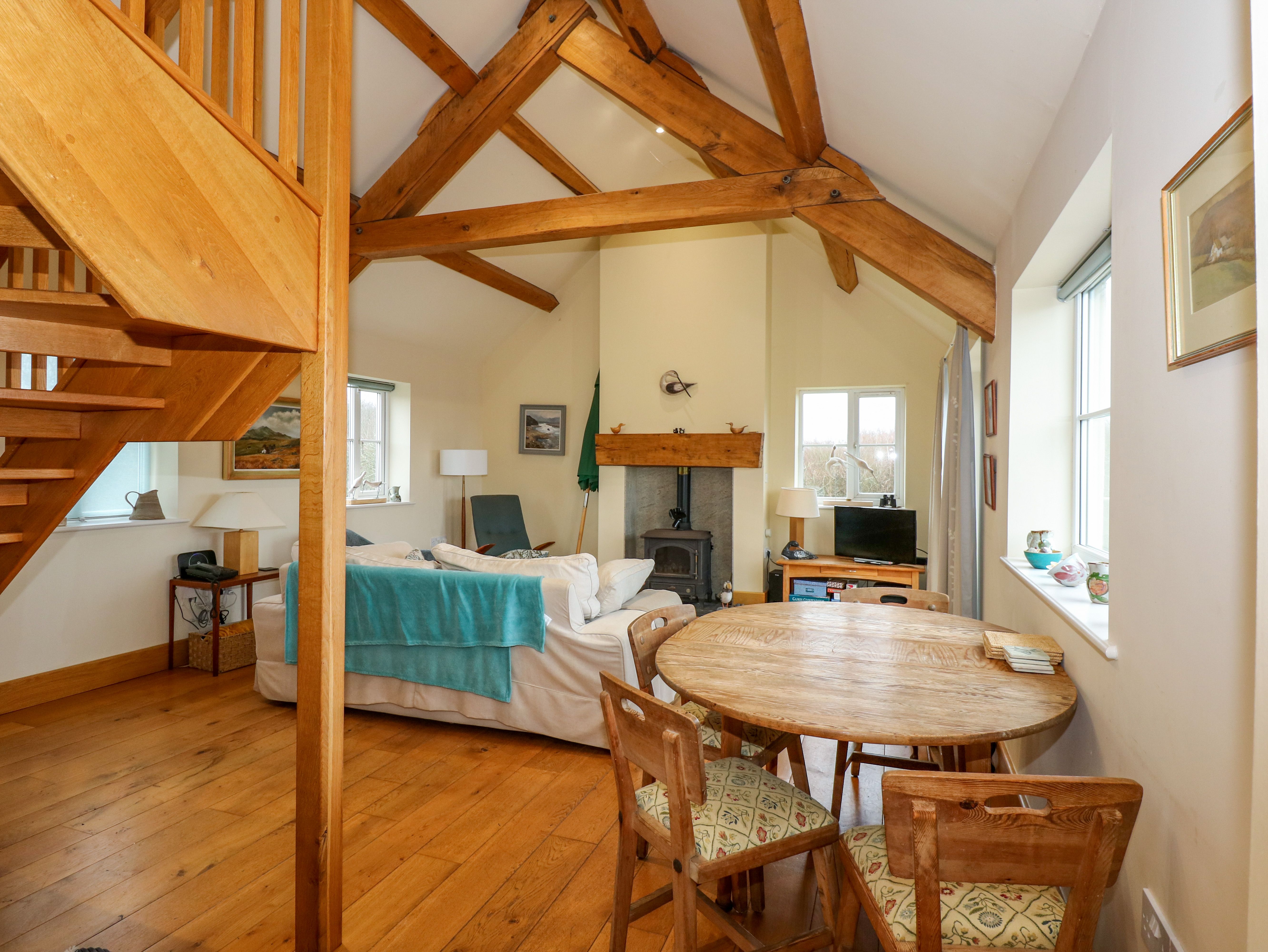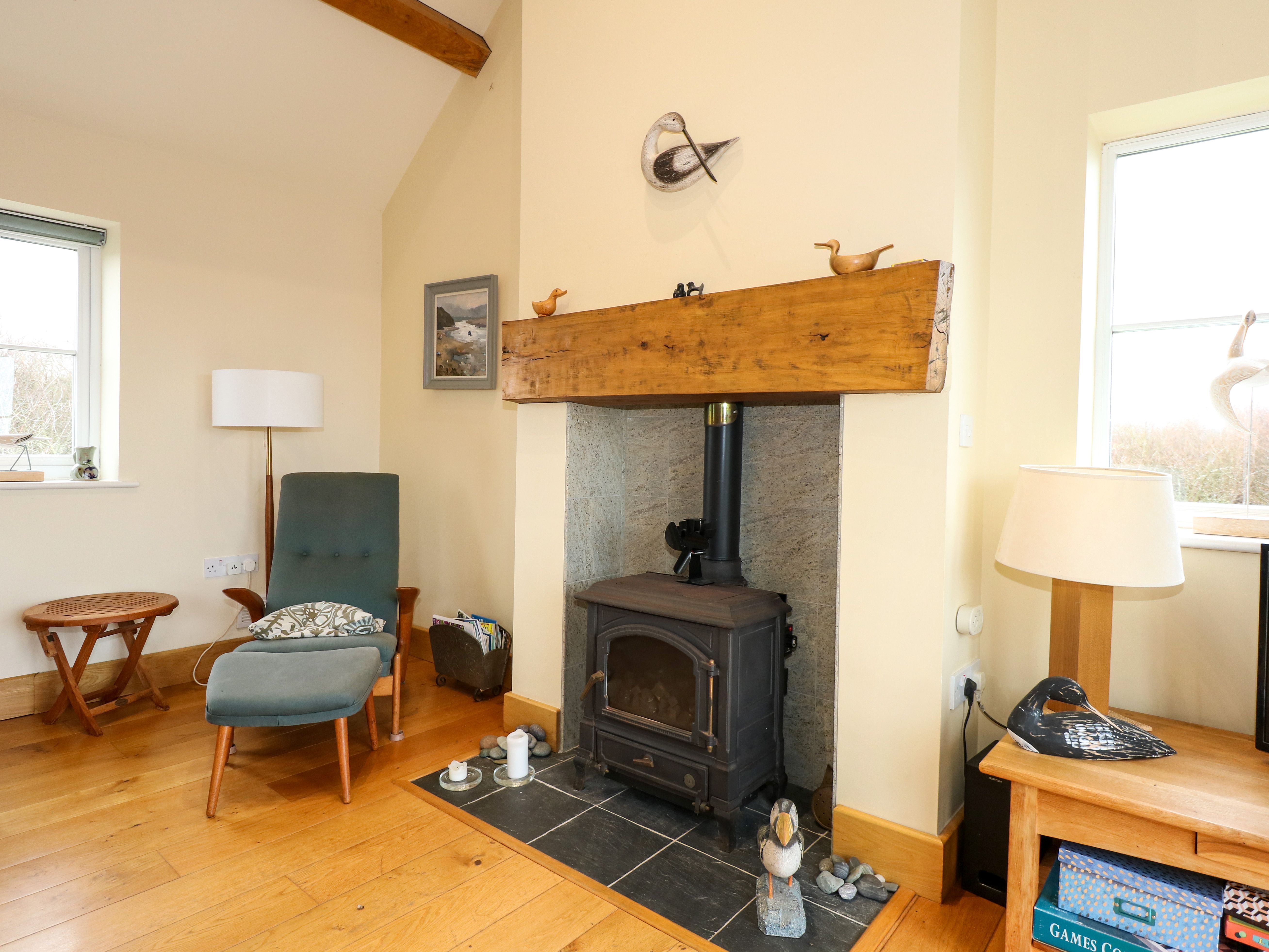 Amenities Solar panels, underfloor heating with gas stove. Electric oven, induction hob, microwave, fridge/freezer, washing machine, dishwasher. Smart TV, books, DVD player with a selection of DVDs, puzzles, games, yoga mat, beach toys available. WiFi 70mbps. Fuel and power inc. in rent. Bed linen and towels inc. in rent. Travel cot and Stairgate. Private, off-road parking for 2 cars. Enclosed, wraparound garden with decking, patio, lawn, and bench. Two well-behaved pets welcome. Sorry, no smoking. Shop 1.8 miles, pub 1.8 miles, beach 1.3 miles. Note: Step down from kitchen to living/dining room, please take care. Note: A few steps down on patio and decking area. Note: Steps down to stream at the bottom of garden. Note: Open tread stairs. Note: Restricted headroom when accessing twin bedroom