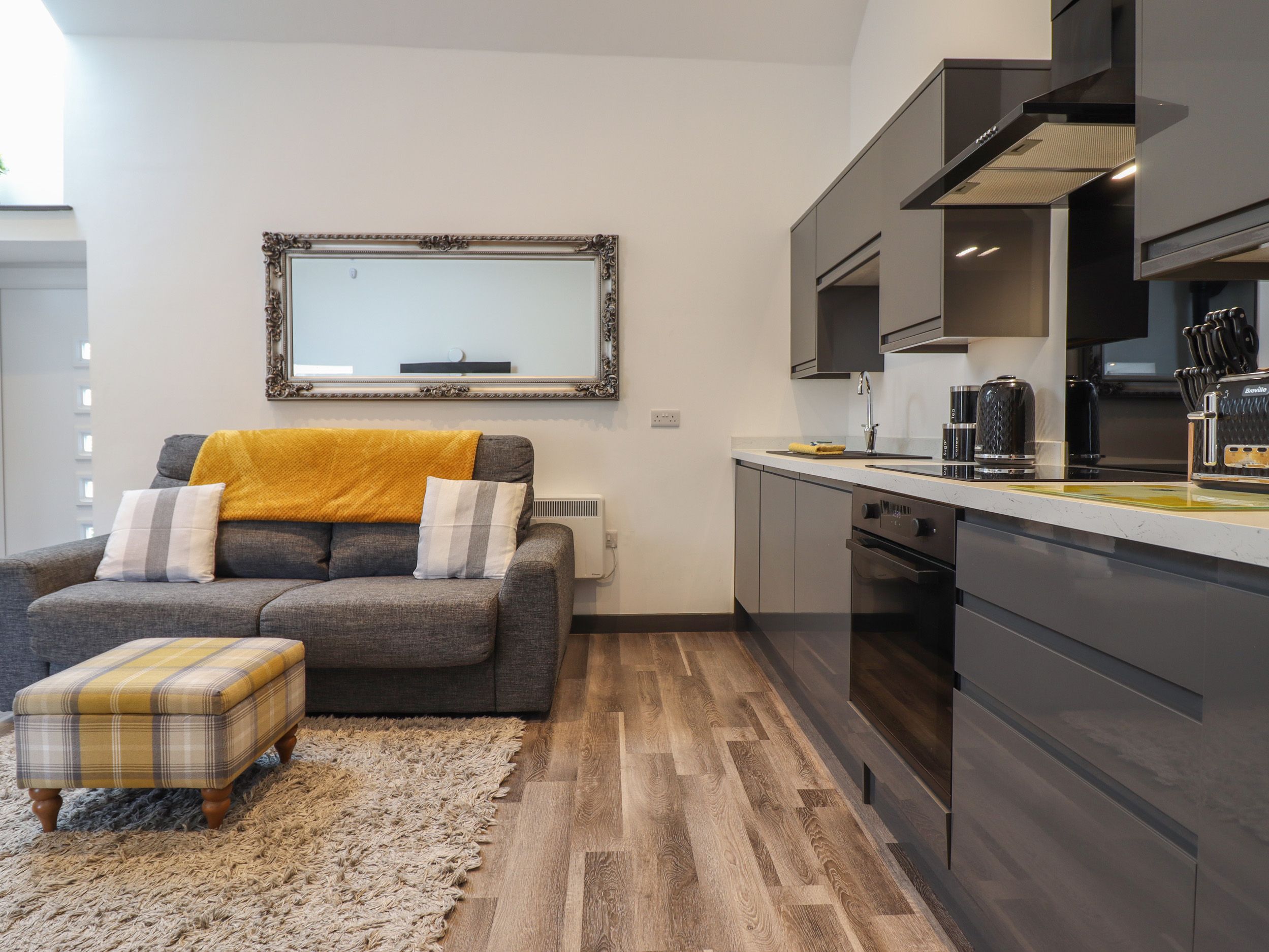 Accomodation Details Single-storey. One double bedroom. Shower room with walk-in shower, basin, heated towel rail, and WC. Open-plan living space with kitchen, dining area and sitting area with woodburning stove and sofa. External, communal utility
