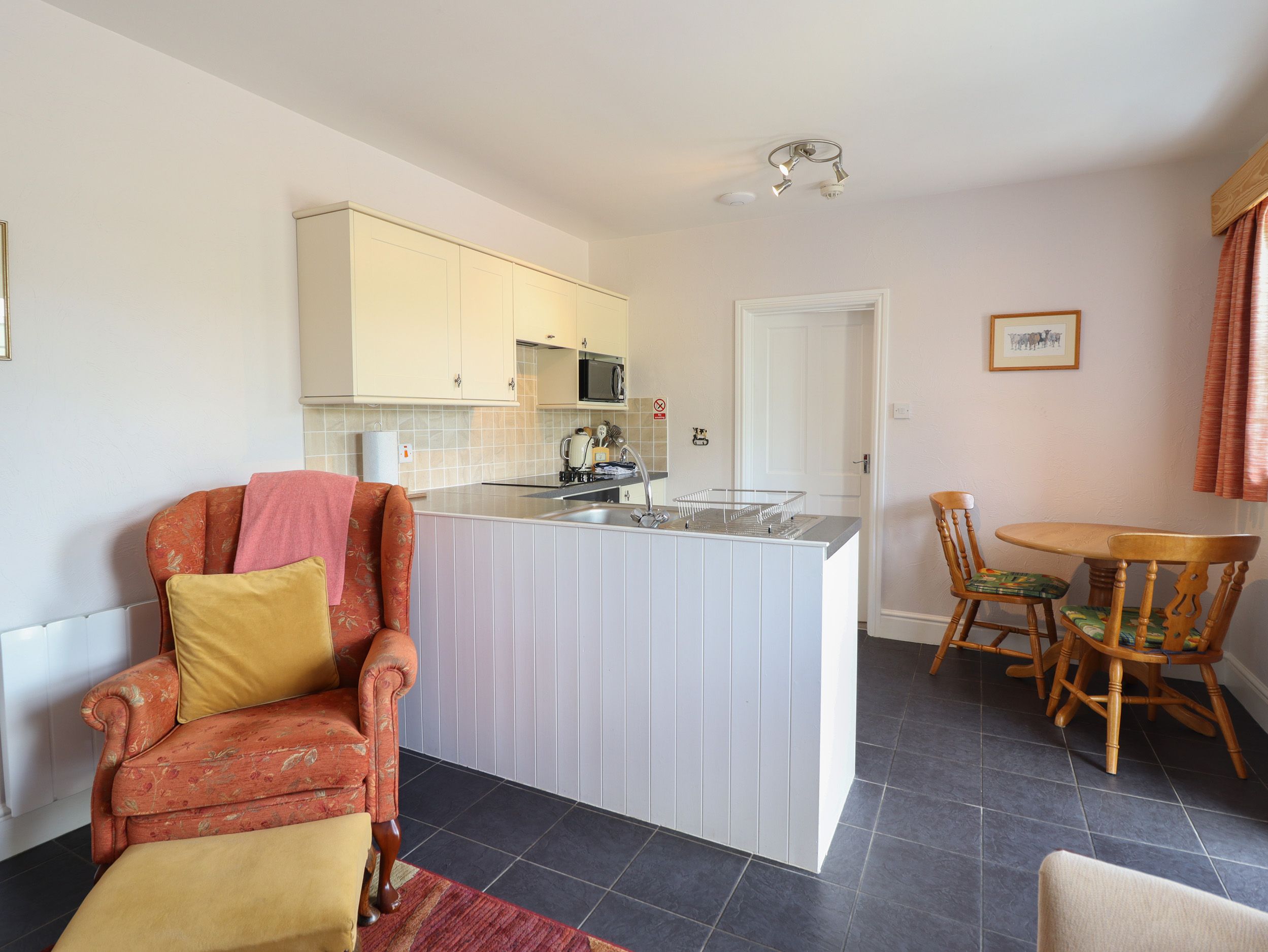 Accomodation Details Single-storey. One super-king-size bedroom (zip-link can be twin on request) with en-suite walk-in shower, basin, heated towel rail, and WC. Open-plan living space with kitchen, dining area, and sitting area with electric fire