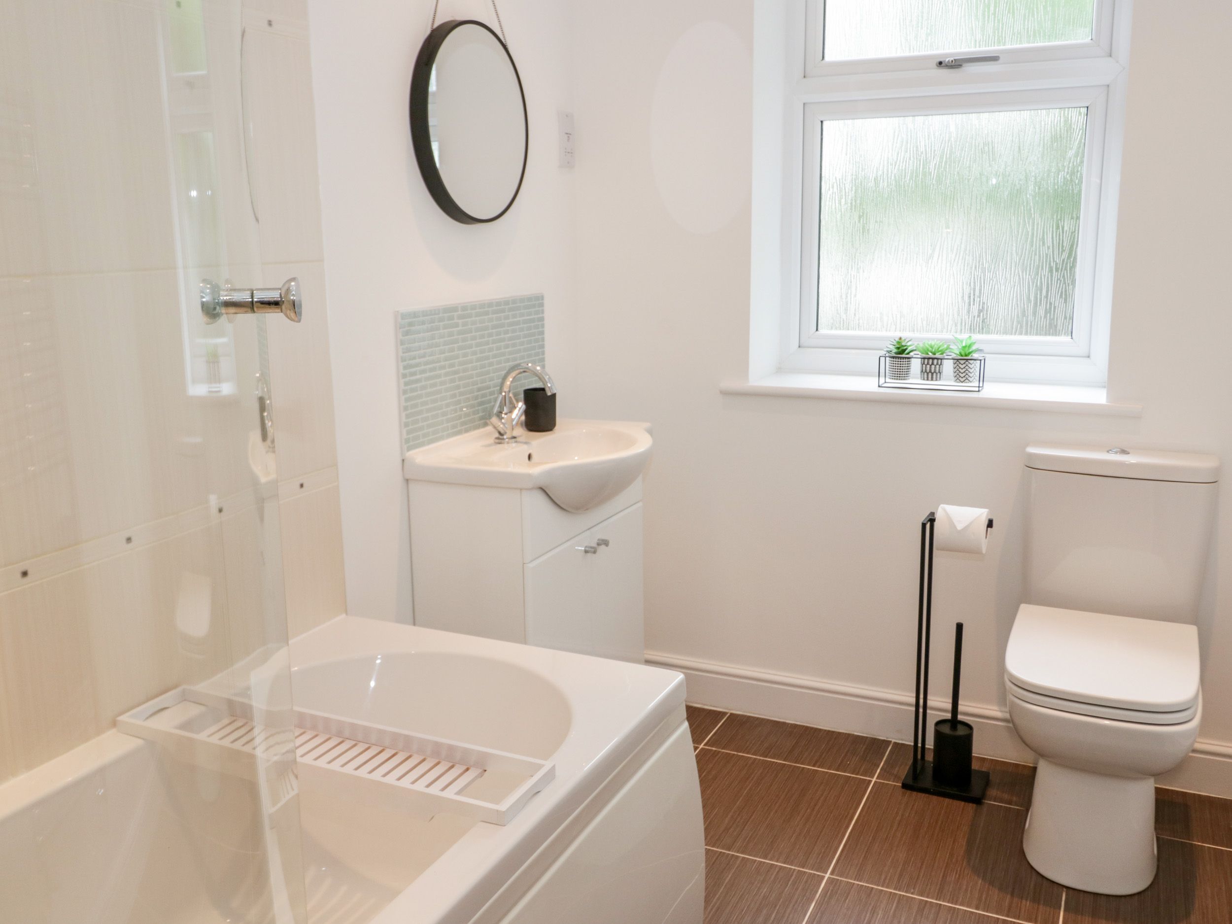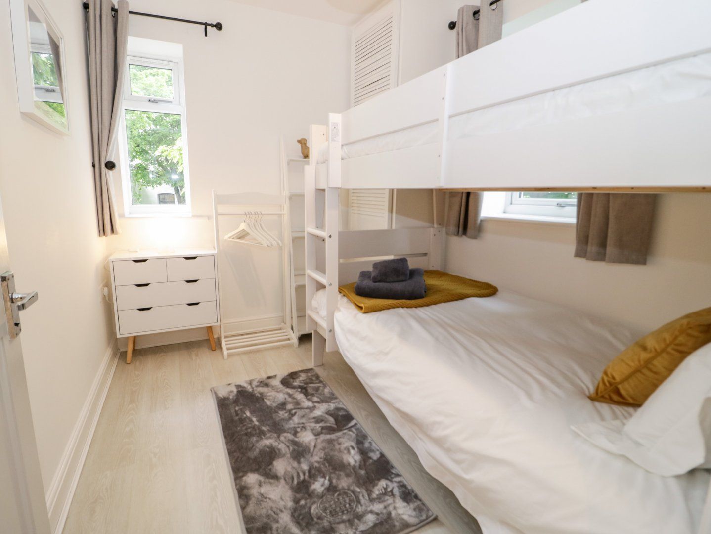 Accomodation Details Reverse-level. Two ground-floor bedrooms: 1 x double, 1 x adult bunk. Ground-floor bathroom with bath, shower over, basin, heated towel rail and WC. First-floor open-plan living space with kitchen, dining and sitting area