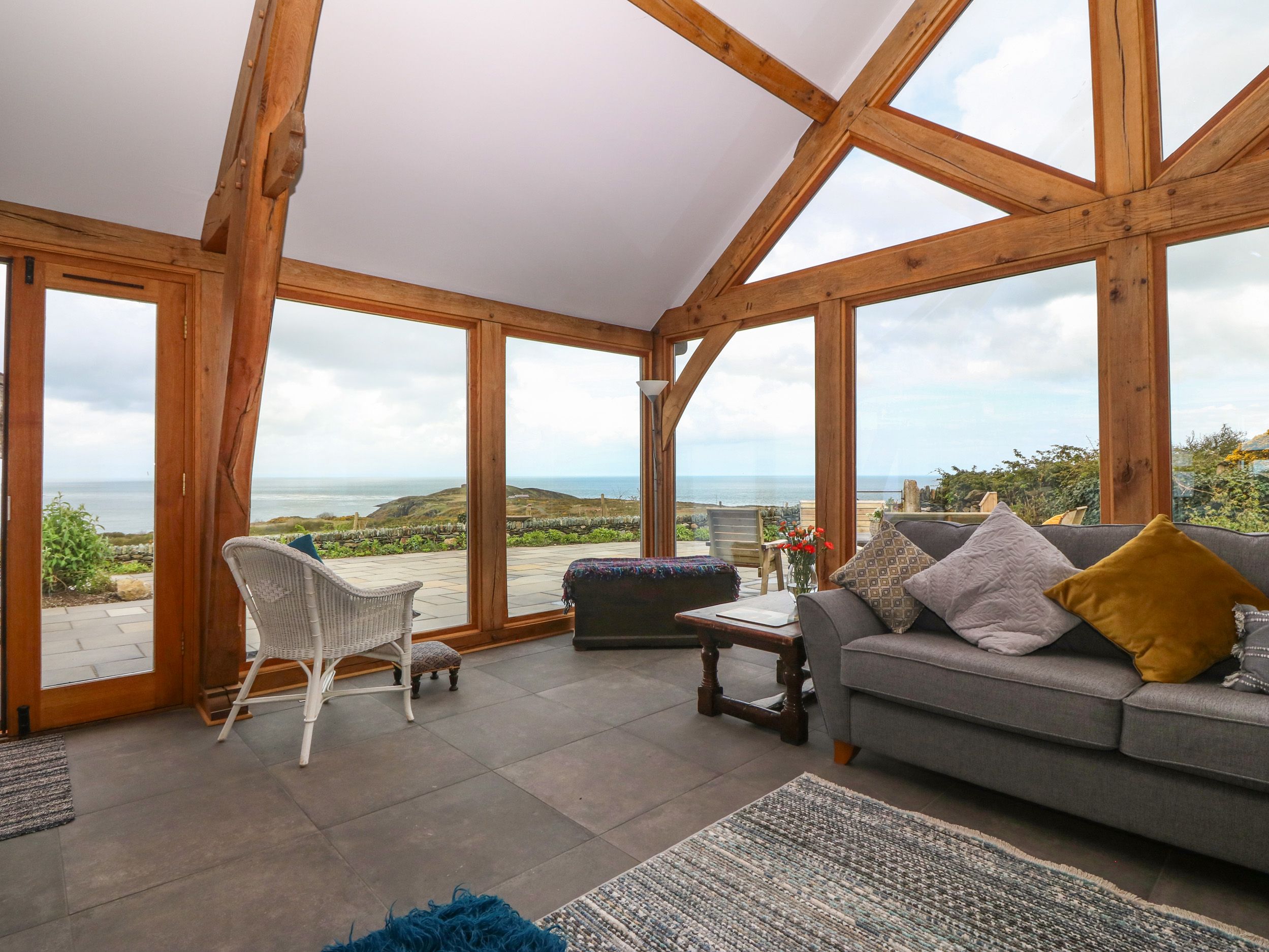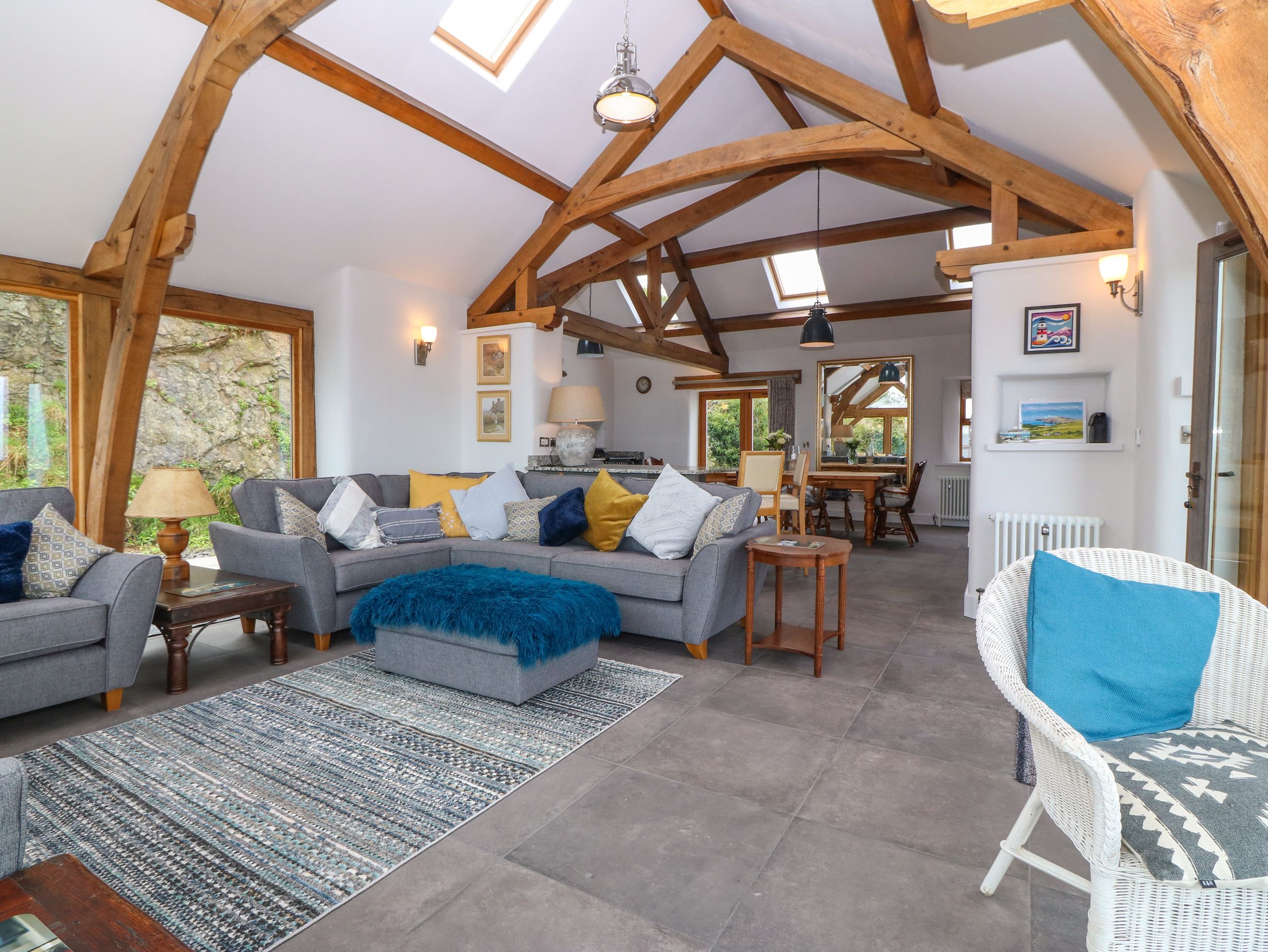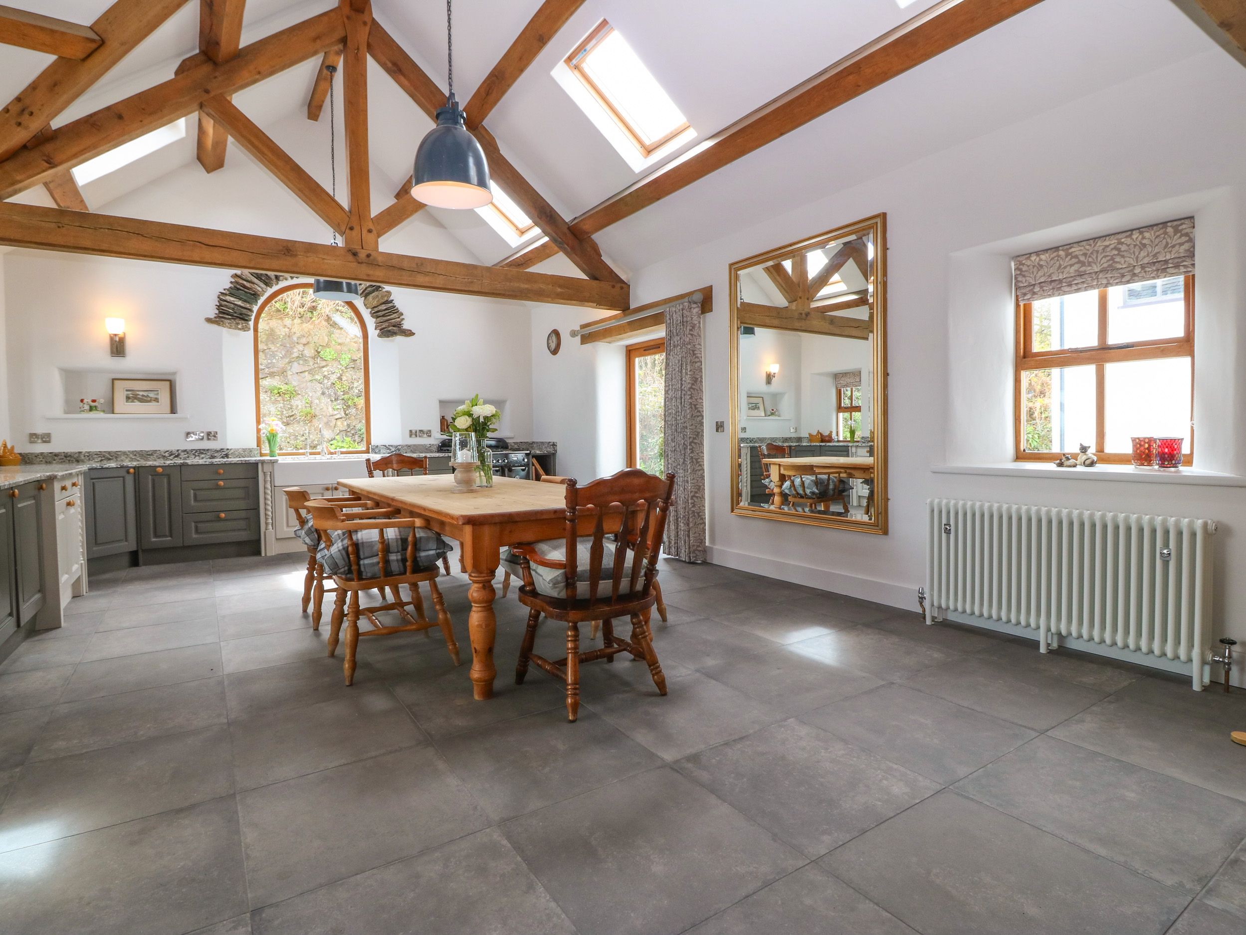 Accomodation Details Sykes Gem Awards 2025 Bronze winner for Best in North Wales. Three bedrooms: 1 x super-king-size (zip/link, can be twin on request) with access to Jack-and-Jill bathroom, 1 x king-size with access to Jack-and-Jill bathroom, 1 x ground-floor king-size bed with en-suite rolltop bath, handheld shower, basin, heated towel rail, and WC. Jack-and-Jill bathroom with rolltop bath, handheld shower, basin, heated towel rail, and WC. Ground-floor shower room with walk-in shower, basin, heated towel rail, and WC. Open-plan living space with kitchen, dining area, and sitting area/conservatory. Sitting room with woodburning stove. Snug with woodburning stove. Parlour. Note: Minimum 4 nights stay