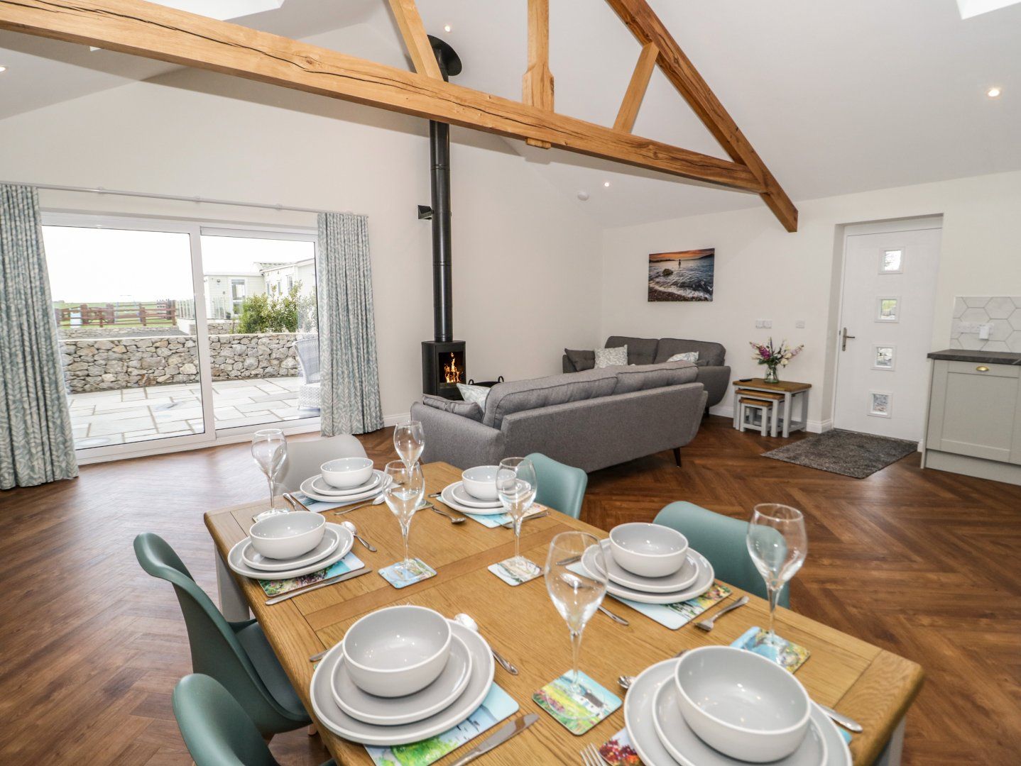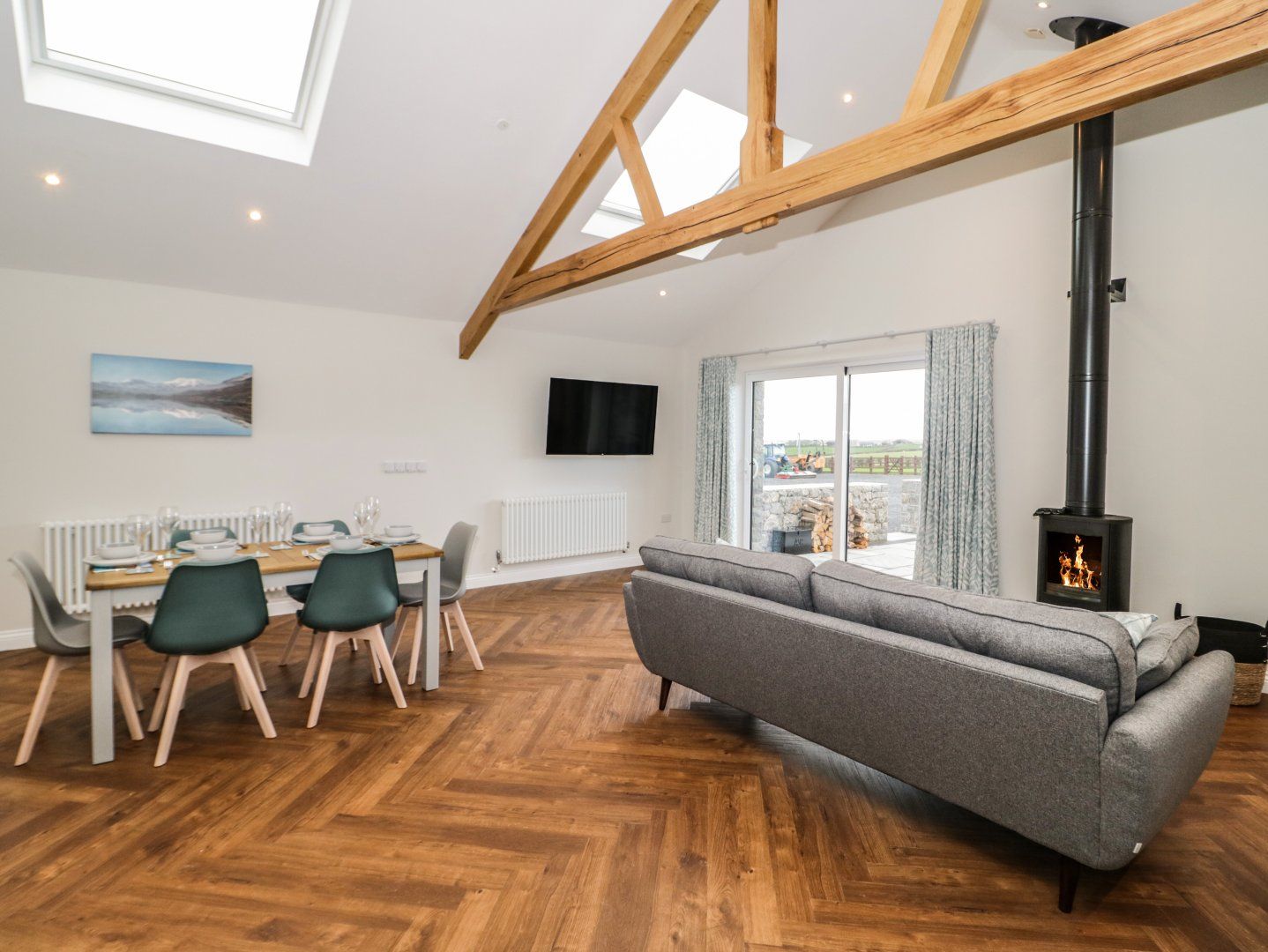 Accomodation Details Single-storey. Two bedrooms: 1 x king-size with double sofa bed, TV and en-suite walk-in shower, basin and WC, 1 x twin with TV (zip/link, can be super-king-size on request). Cloakroom with basin, heated towel rail and WC. Open-plan living space with kitchen, dining area and sitting area and woodburning stove