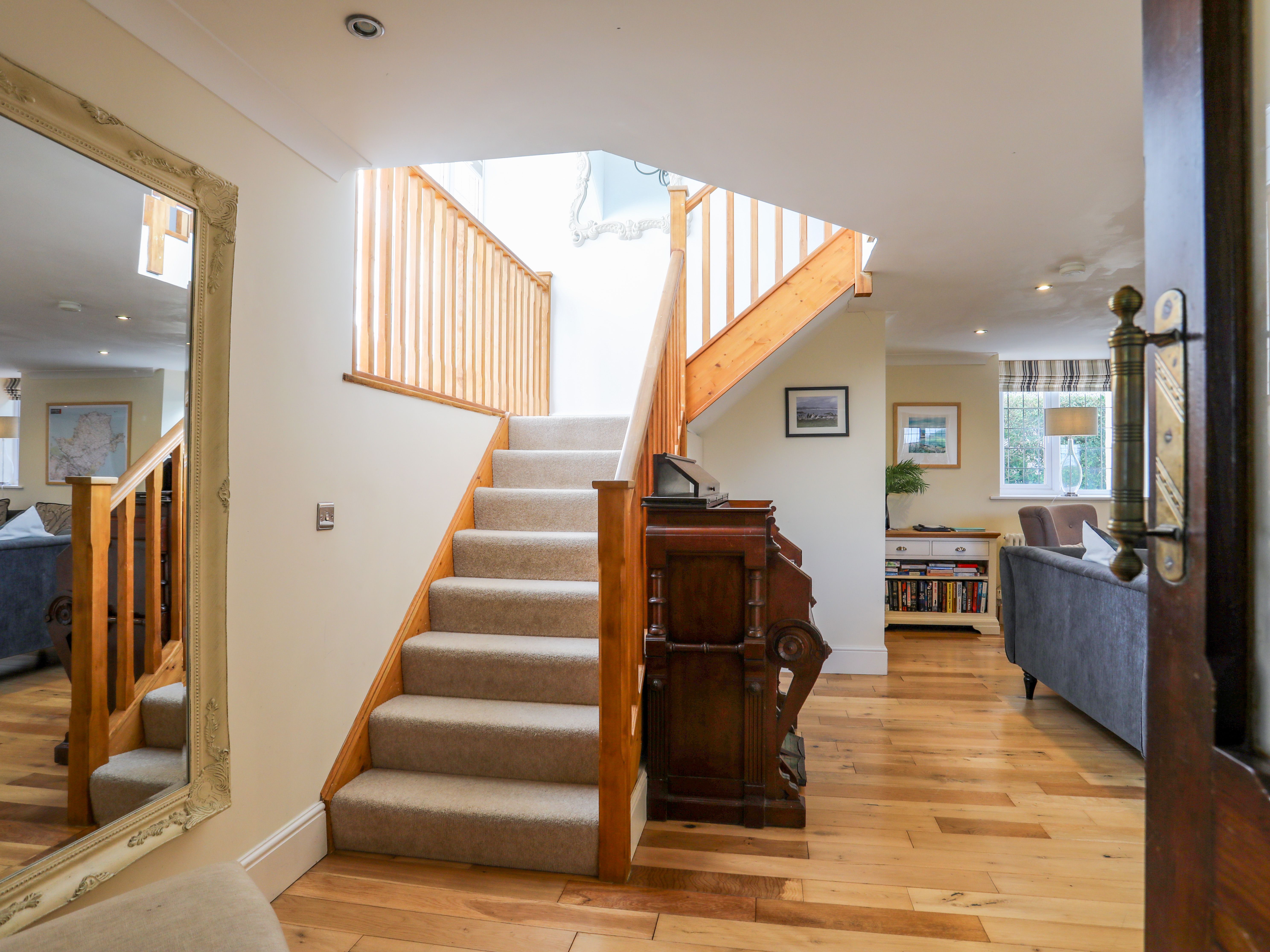 Three bedrooms: 1 x double with en-suite shower, basin and WC, 1 x double and 1 x twin. Ground-floor shower room with walk-in shower, basin and WC. Bathroom with roll-top bath, handheld shower, basin and WC. Open-plan living space with kitchen, dining area and sitting area