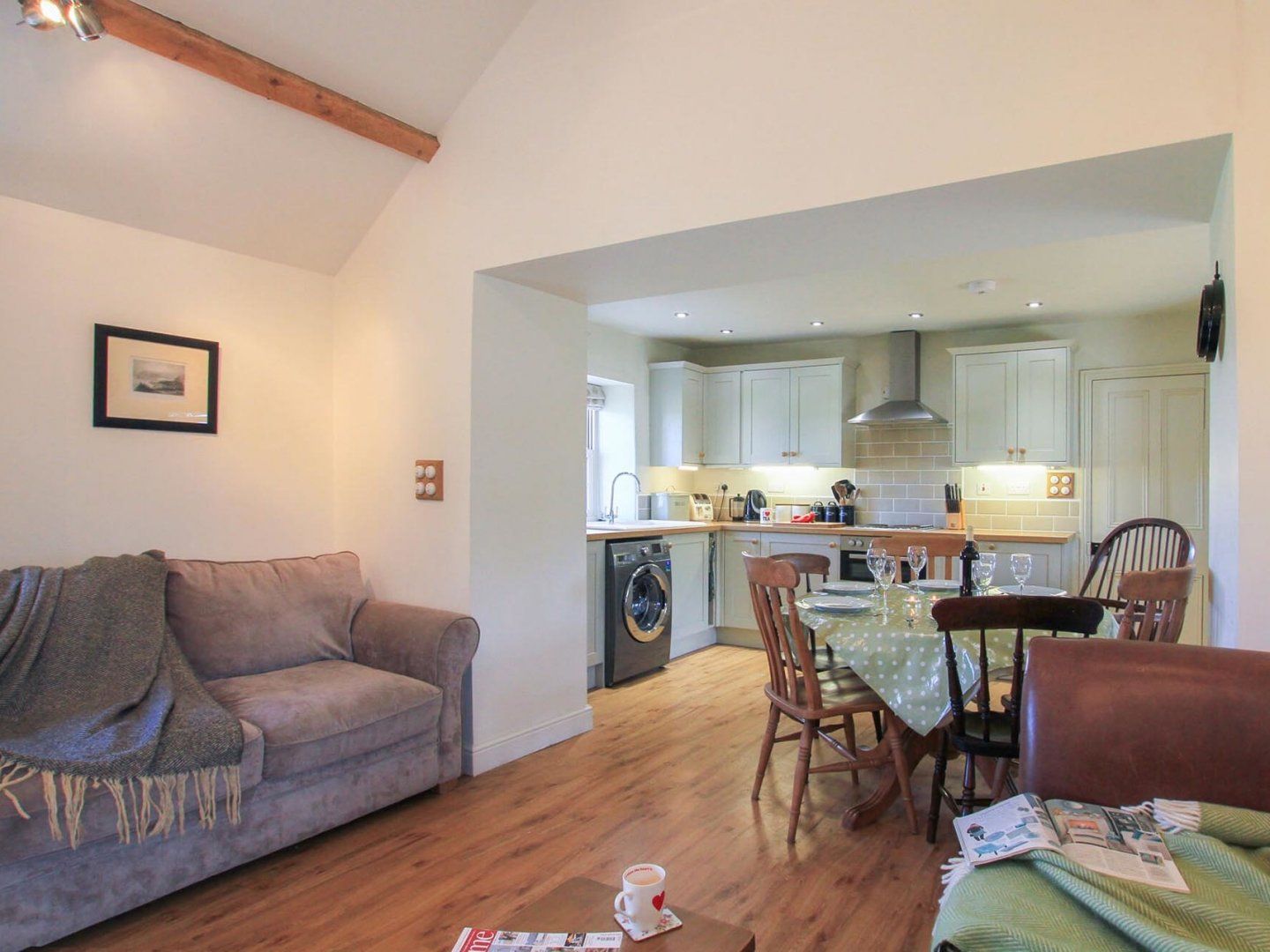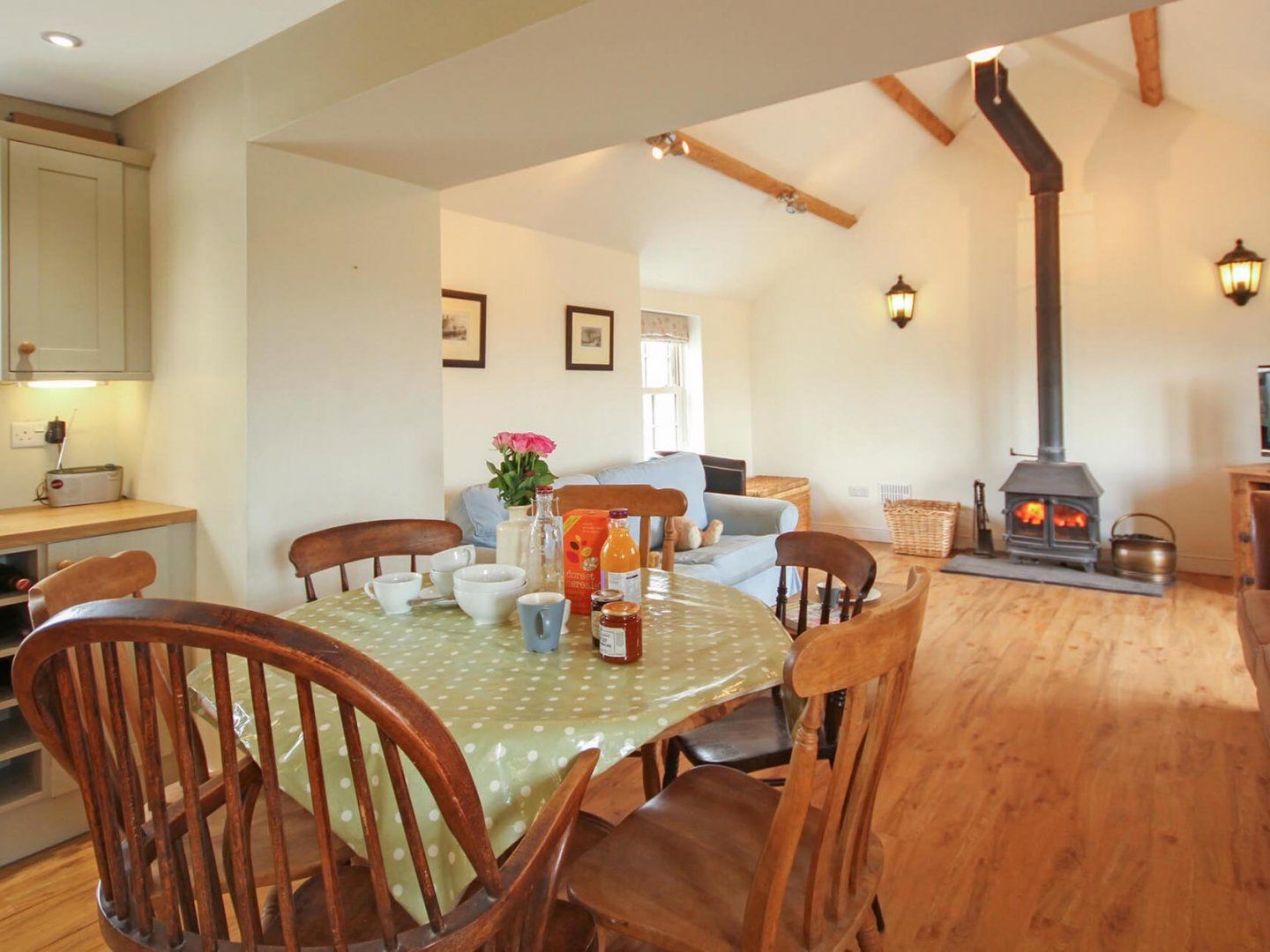 Electric central heating with multi fuel stove and open fire. Electric oven and hob, fridge freezer, dishwasher, washing machine, microwave. TV, WiFi. High chair, travel cot (no linen) and stairgate. Bed linen and towels provided. Initial supply of logs. Sorry, no smoking. Dogs welcome £20 per pet per week. Enclosed courtyard to front and lawned area to the back with outdoor furniture. Ample off road parking. Welcome tray provided. Shops, pubs and restaurants 4 miles.