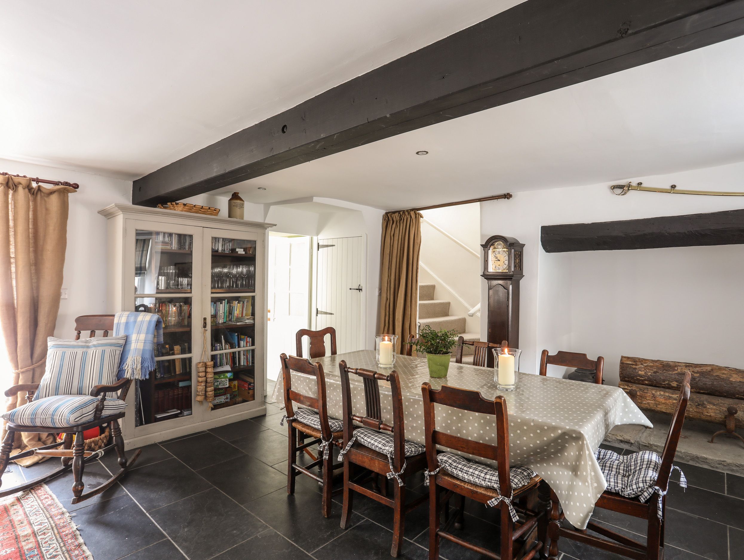 Accomodation Details Four bedrooms: 1 x king, 1 x double, 1 x small double with single bed, 1 x twin. 1 x bathroom with large shower, loo and wash hand basin. 1 x bathroom with bath and hand held shower attachment, loo, wash hand basin. Bed Linen and towels provided, 1 x ground floor WC with wash hand basin and loo. Kitchen with NEFF oven, grill, gas hob, fridge, dishwasher, toaster and dining area. Utility with washing machine, fridge with ice compartment, freezer, microwave. Sitting room with wood burning stove, TV DVD player, dining table and chairs, books and games.