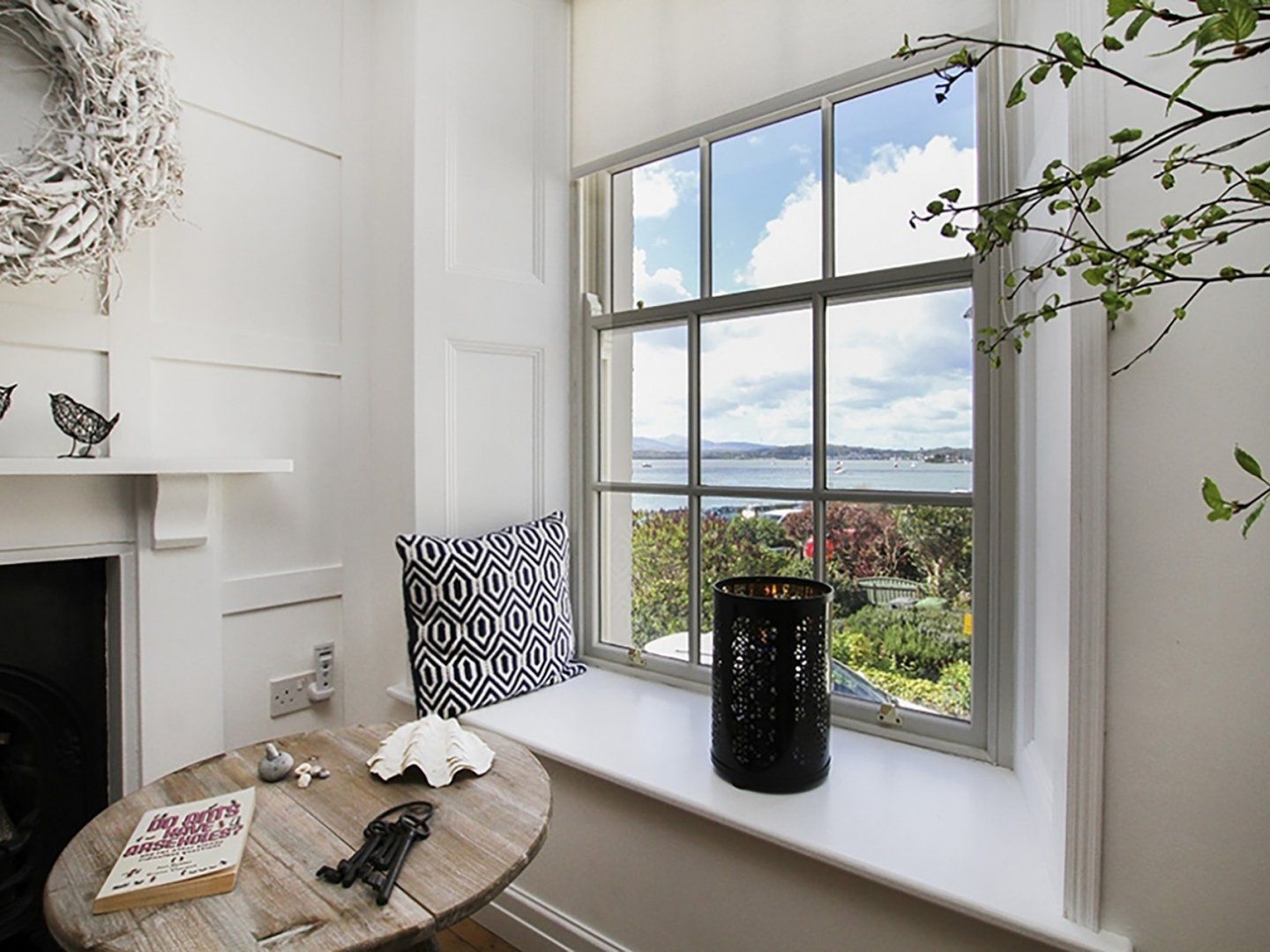 The sitting room has lovely seating areas with window seats in the gorgeous bay windows with views of the Strait. There are comfortable sofas, a wood burning stove and a SMART TV.