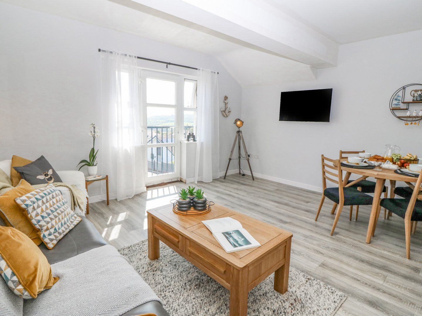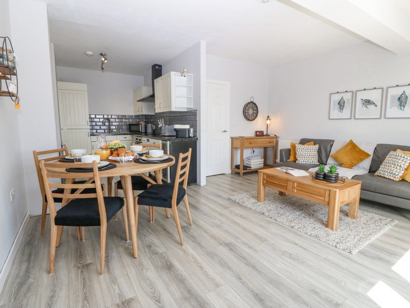 Gas central heating. Electric oven, induction hob, microwave, fridge freezer, washing machine, dishwasher, coffee machine and wine cooler, heated clothes airer. Smart TV with Sky and Netflix, WiFi, Alexa device, Prime video. Fuel and power inc. in rent. Bed linen and towels inc. in rent. Highchair and travel cot available. Designated parking for 1 car. 1 small well behaved dog. Sorry no smoking. Shop and pub 0.1 miles, beach 0.5 miles. Note: The apartment is accessed via a flight of internal stairs, unsuitable for those with limited mobility. Note: Please supervise children near the Juliet balcony. Note: Check-in from 4pm, check-out by 10am. 1 small/medium well-behaved dog is welcome. Please note: this is a first floor apartment with no outside space. Dogs cannot be allowed on furniture, beds or sleep in bedrooms. Dogs must be kept on a leash at all times whilst on the grounds, that is, car park or grass areas and they must not let their dog toilet on the grounds.