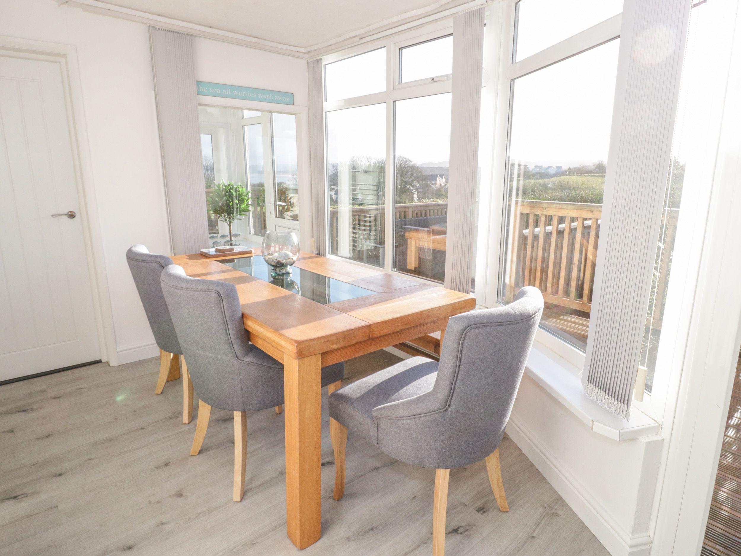 Accomodation Details All-ground-floor. Three bedrooms: 2 x king-size, 1 x bunk room, plus one double sofa bed. Bathroom with bath, separate shower, basin, and WC. Open-plan living space with kitchen, dining area and sitting area with fire