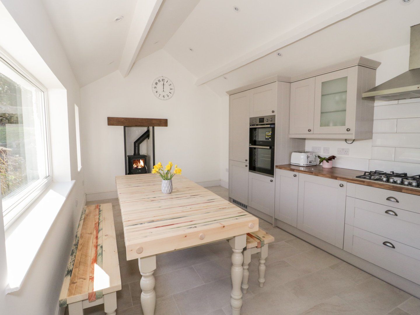 Accomodation Details Over two floors. Four bedrooms: 1 x ground-floor kingsize, 1 x ground-floor twin, 1 x Kingsize, 1 x twin. Ground-floor bathroom with roll top bath, shower over, hand-held shower, basin and separate WC. Shower room with walk-in shower, basin and WC. Kitchen/diner with woodburning stove. Sitting room with woodburning stove. Boot room.