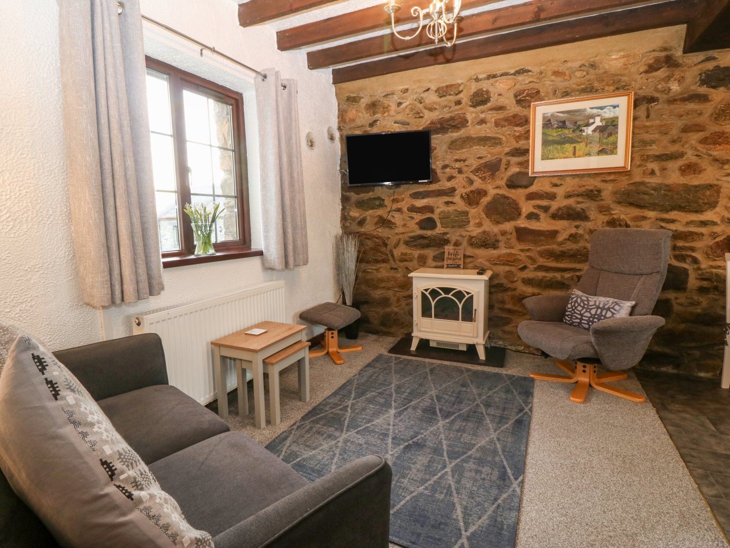 Amenities Oil central heating with electric fire. Electric oven and hob, microwave, fridge/freezer, washing machine, TV with Freeview and WiFi. Fuel and power inc. in rent. Bed linen and towels inc. in rent. Travel cot and highchair available on request. Off-road parking for one car. Rear patio with furniture. Sorry, no pets and no smoking. Shop 1.3 miles, pub 1.4 miles. Note: Patio furniture available on request. Note: Surround rail for toilet available on request