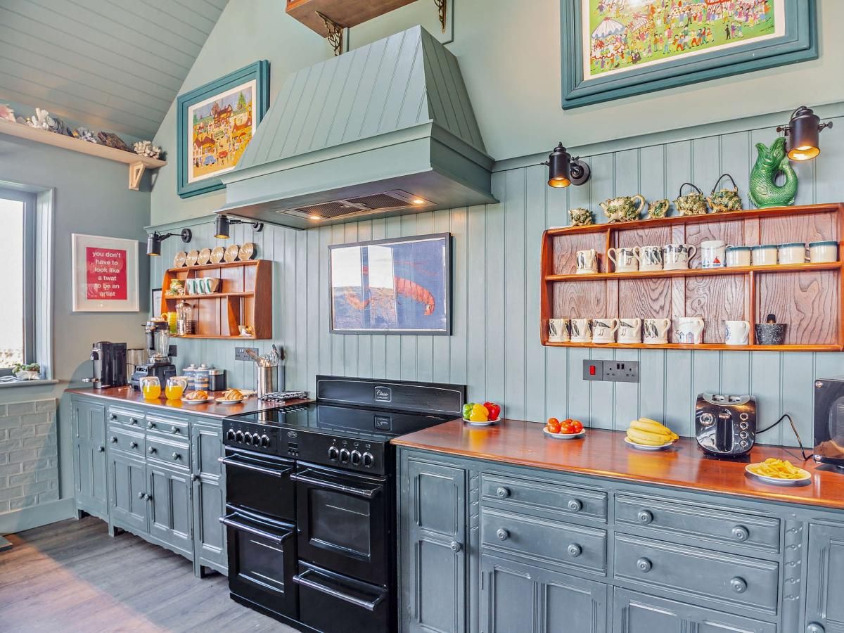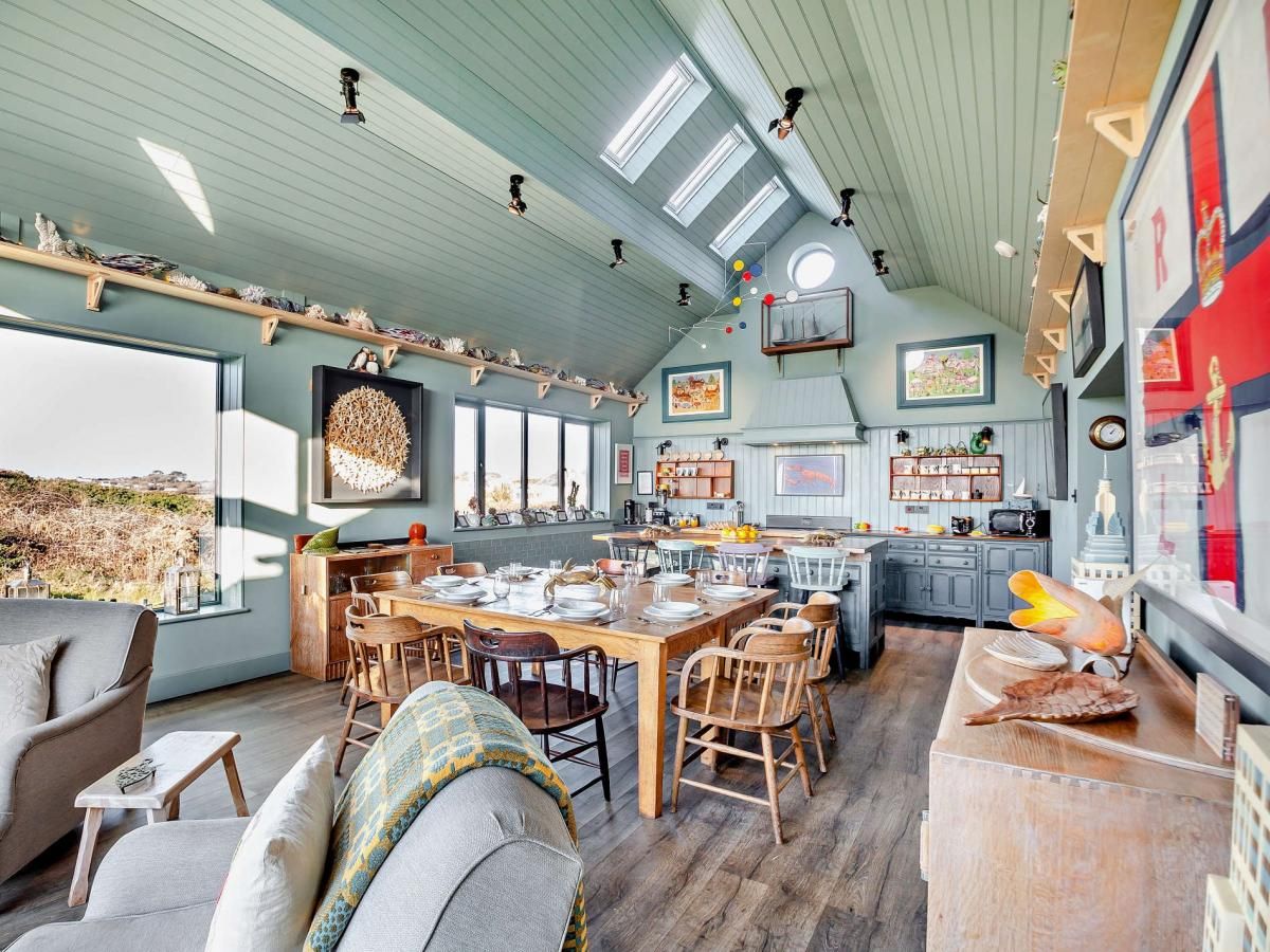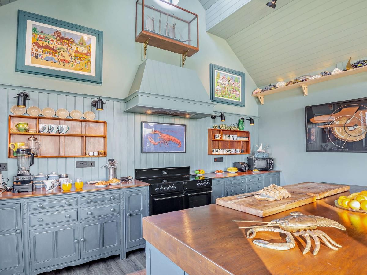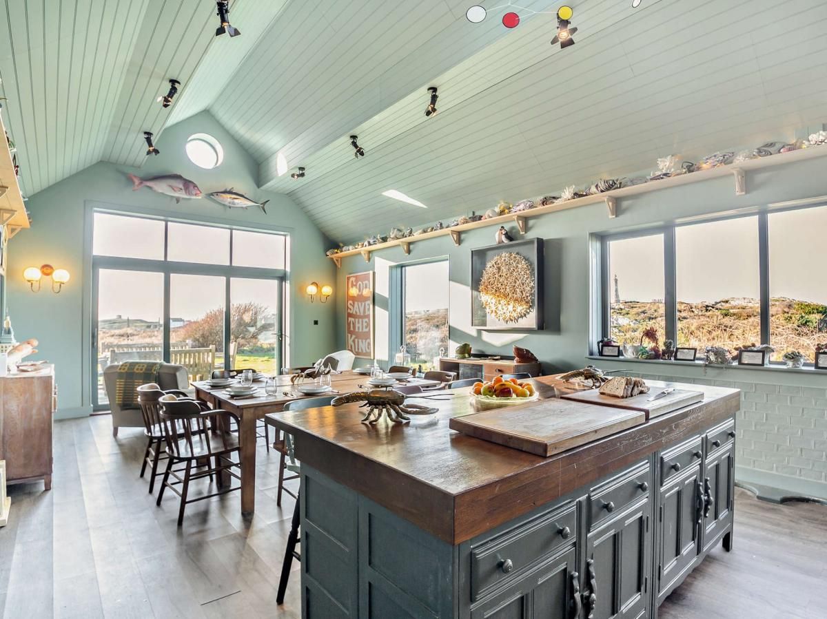 A wooden-panelled foyer leads to panoramic views, while the coastal-themed kitchen/diner steals the show with its vaulted ceilings, expansive windows, and sliding glass doors.