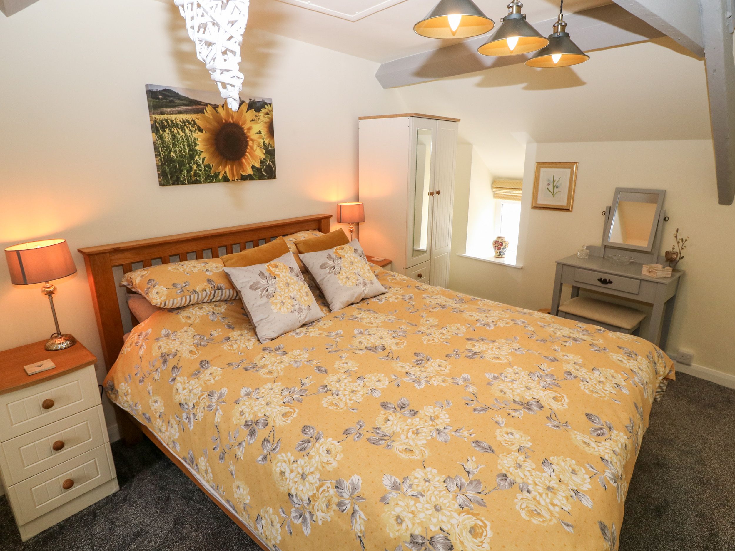 Holiday home Garnedd is a delightful mid-terrace property, situated on the Isle of Anglesey, Wales. The property features one super-king-size bedroom, and an accompanying bathroom with both a bath and a shower over, making the property ideal to sleep up to two people. Within the dwelling there is also a kitchen, and a sitting room with a woodburning stove. To the front of the property is a modest gravelled area, and to the back a lawned area with a patio and furniture. Garnedd makes a wonderful property for a couple to explore this adventure-riddled area of Wales. Please note: this property only accepts check-ins on Thursday or Friday.