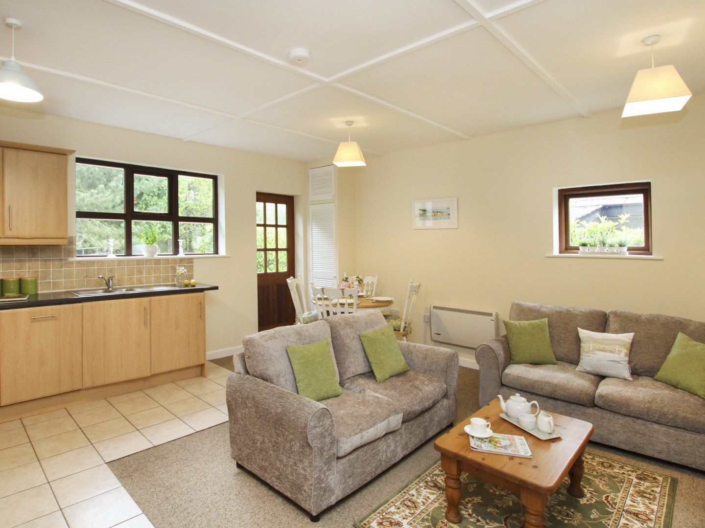 Lovely open plan living/dining/kitchen. The kitchen has an electric oven/hob, a fridge freezer, dishwasher, washing machine, kettle, toaster and microwave. The round dining table seats up to four people.