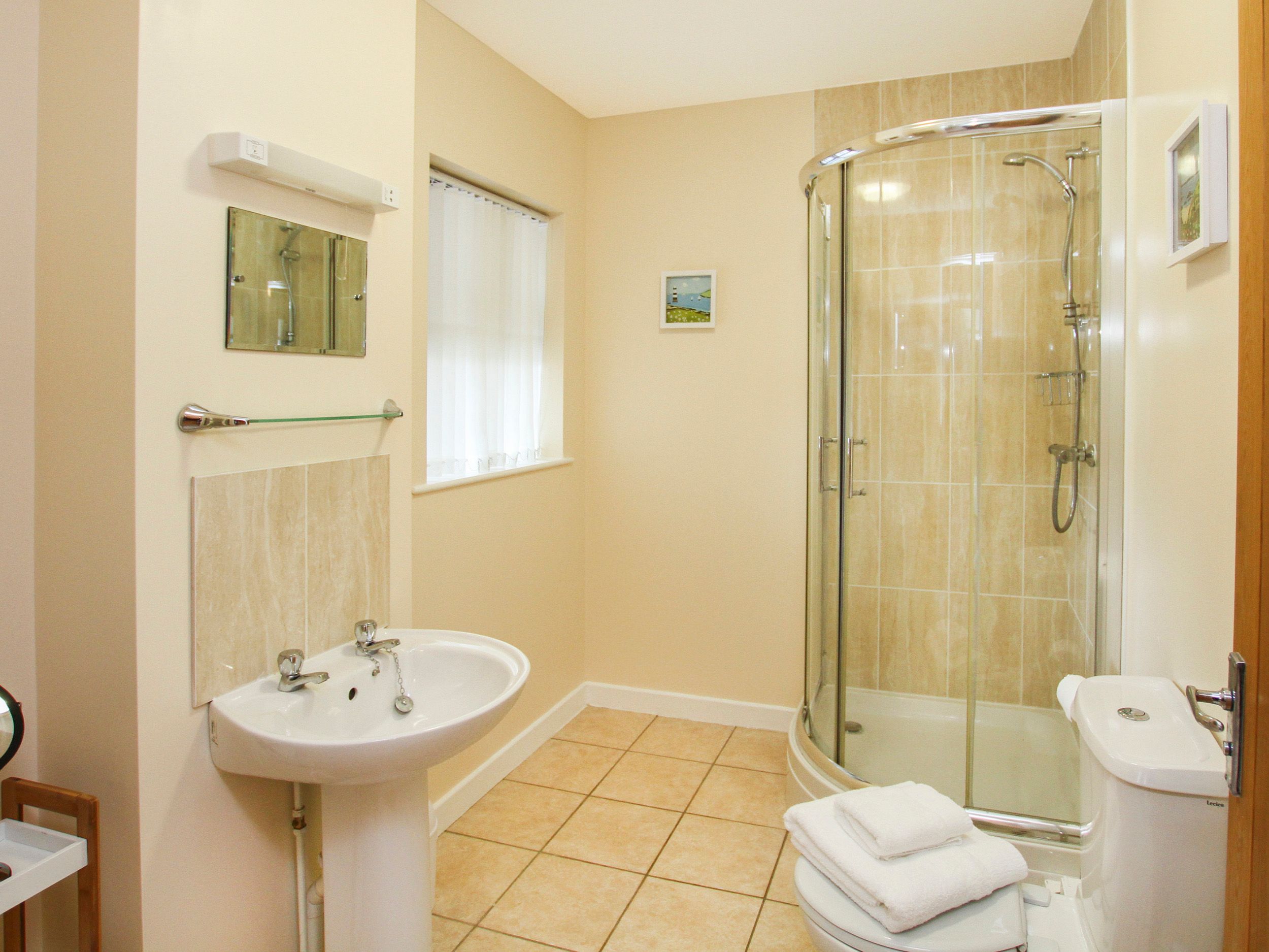 The large bathroom has a shower, basin, loo and towel rail.