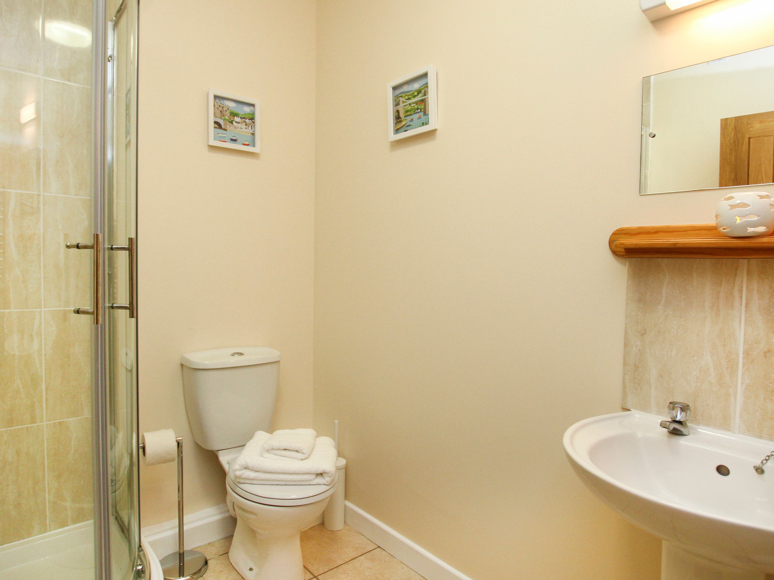 Accomodation Details Two bedrooms: 1 x king, 1 x twin. 1 x ensuite shower room with shower, loo and wash hand basin. 1 x bathroom with shower, basin, loo and towel rail. Kitchen has electric oven/hob, a fridge freezer, dishwasher, washing machine, kettle, toaster and microwave. Sitting room with TV.