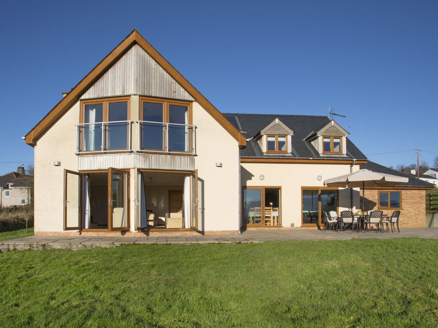 Patio area with garden furniture,gas BBQ and lawned area. Mountain views. Amenities approx 3 miles. Note £250 good house keeping bond