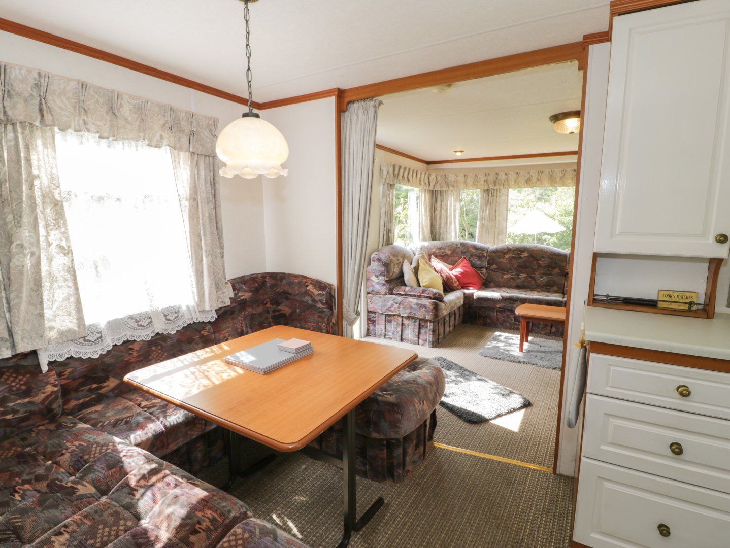 Single-storey. Three 4' double bedrooms. Bathroom with hip bath and shower over. Cloakroom with basin and WC. Open-plan living space with kitchen, dining area and sitting area with gas fire.