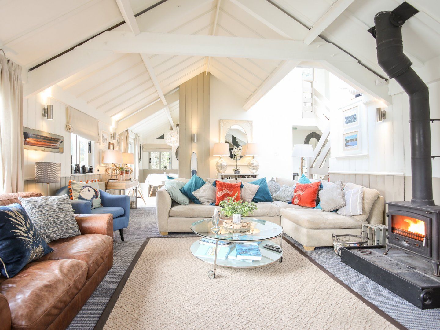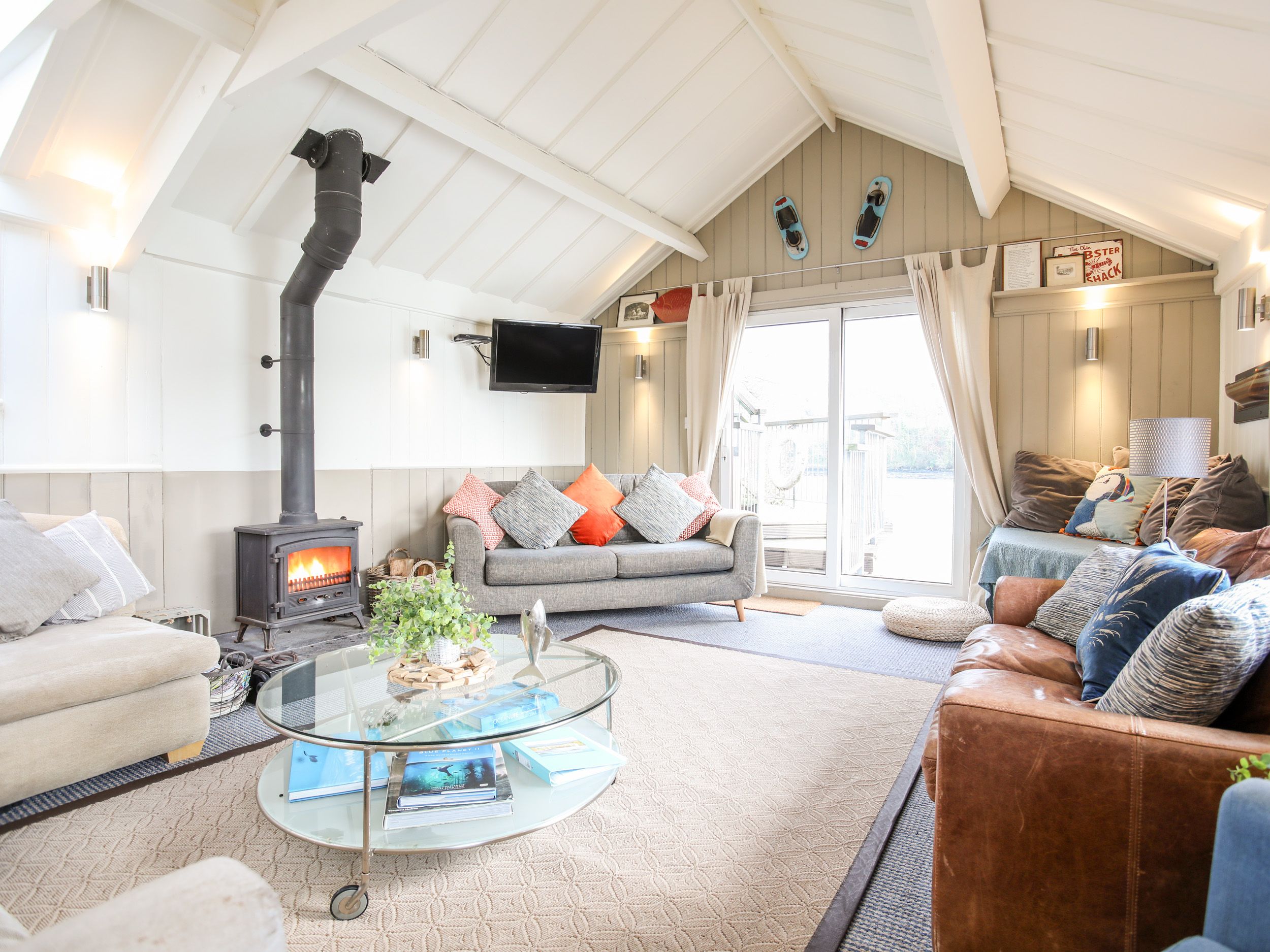 Four bedrooms: 3 x double, 1 x twin with additional bunks suitable for children of 12 and under (Bunks are not made up). Family bathroom with bath and shower over, WC and handwash basin. Compact shower room with microbath and shower over, WC and handwash basin. Kitchen is to the side of the sitting room with dining area and breakfast bar, fridge freezer, washing machine, tumble dryer, double oven, microwave, toaster. Sitting room with sofas and chairs, log burner, freeview TV. Outside the sitting room and master bedroom is a balcony with bench seating. A staircase leads up to a roof terrace with table and chairs. Parking for one car.