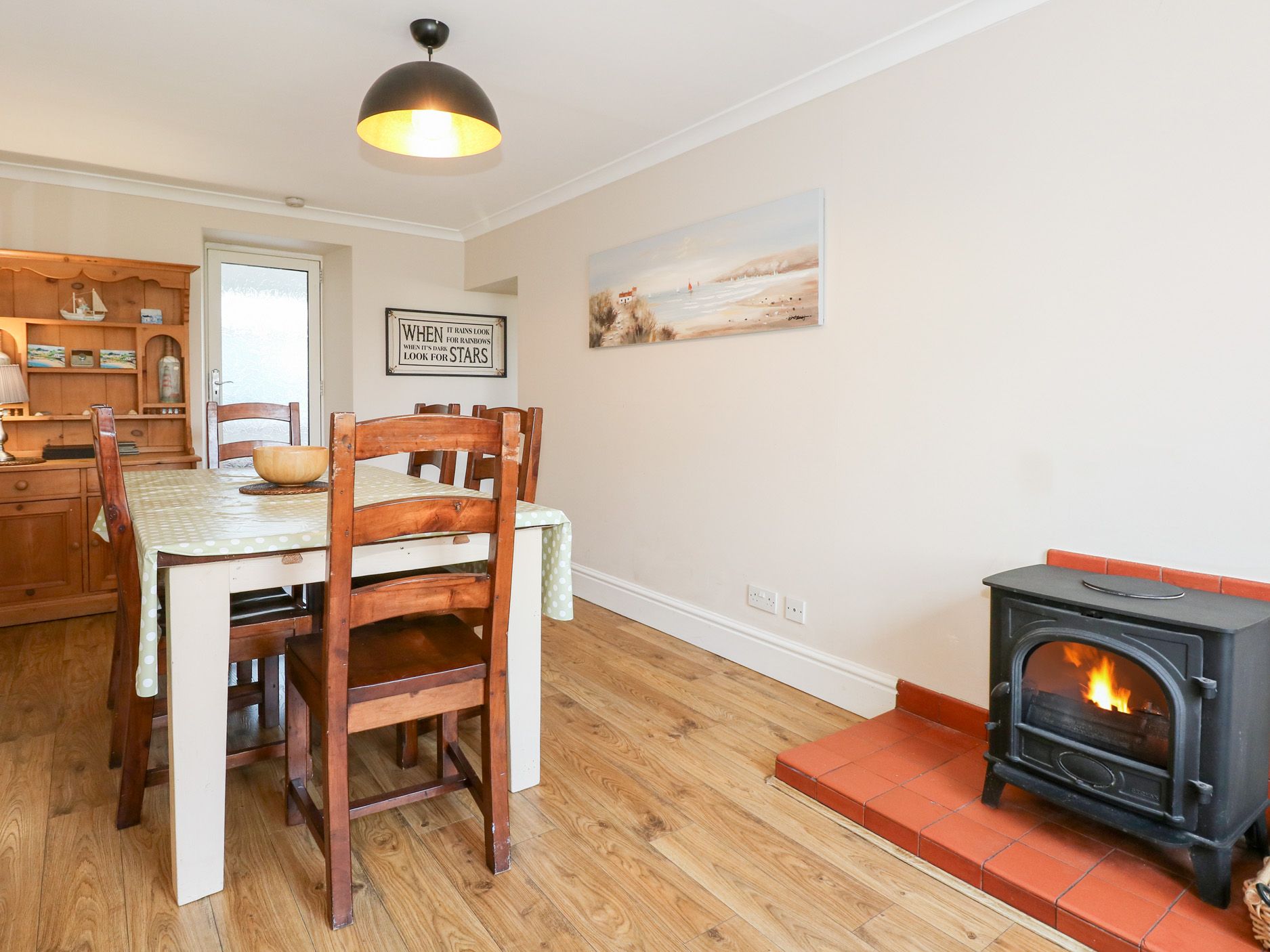 Amenities Oil central heating with x2 woodburning stove. Double electric ovens and low hob, microwave, larder fridge with ice box, washing machine, dishwasher. TV with Sky, DVD player, Fibre Optic WiFi, selection of books, games and DVDs. Fuel, power and starter pack for woodburning stove inc. in rent. Bed linen inc. in rent. Highchair and stairgate available. Off-road parking for 4 cars. Fully enclosed garden with decking and furniture. Two well-behaved dogs welcome. Sorry, no smoking. Shop 0.1 miles, pub and beach 0.2 miles. Note: Initial supply of kindling and logs, further supplies available locally. Note: The kitchen is low and easily reached by little ones, please ensure they are supervised at all times. Note: Check-in from 4pm, check-out by 10am. Note: Towels are not provided. Note: The games room is housed in a separate outbuilding Note: Minimum of 4 night bookings.
