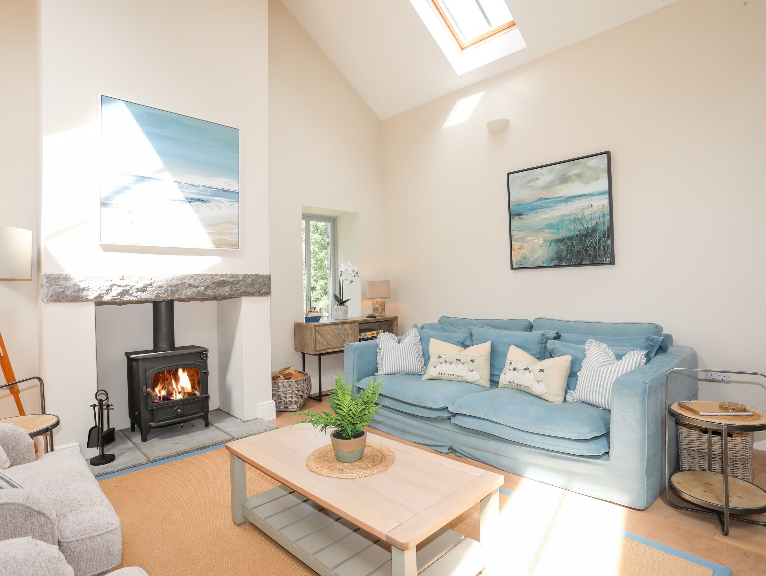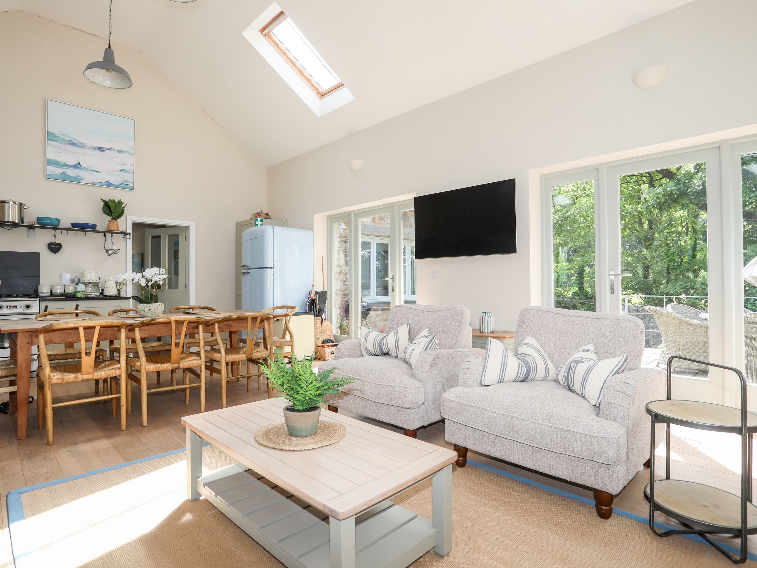 Amenities Underfloor heating. Falcon range cooker with oven and gas hob, microwave, fridge/freezer, kettle, toaster and Smeg coffee machine, dishwasher, washer/dryer. Smart TV, Sonos speaker and Full Fibre WiFi. 3 x Smart HD TV's, BluRay/DVD player, selection of DVD's, Sonos speaker, collection of games. Fuel and power inc. in rent. Bed linen and towels inc. in rent. Highchair, travel cot are available on request. Integrated stairgates. Ample off-road parking for up to 3 cars. Wrap-around enclosed garden with lawn, patio area, patio furniture with parasol, charcoal kettle BBQ, outside shower, shared use of drying room for outdoor equipment with shared bike storage.. One small dog welcome £20 per stay. Sorry, no smoking. Shop 4 miles, pub 1.6 miles, Traeth Ora Beach 130 m. Note: There is a good housekeeping bond of £150. Welcome pack for week stays only. Note: Starter pack of logs and kindling supplied (Autumn and Winter). Parking with electric car charging point available on site next to the carpark at the Barn. part of the Lligwy Estate group of properties Traeth Ora can be booked with Penrhyn Farm (1008955) & Penrhyn Barn (1008954) adjacent for larger holiday gatherings