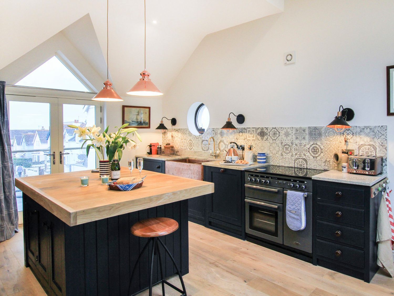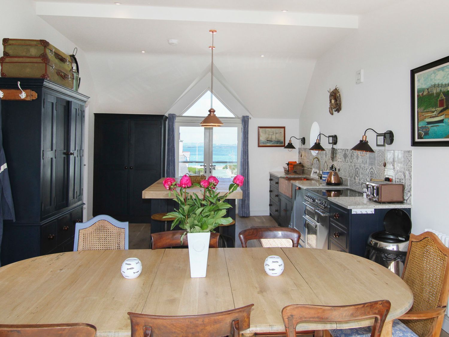 Holiday home Chapel House is a reverse-level property with four ground-floor bedrooms: one king-size, one double, one twin (zip/link to double on request), and one triple bunk (double queen-size below, single above). The ground floor features a bathroom, plus two en-suite shower rooms. The first floor includes a cloakroom, a kitchen/diner with a balcony, and a sitting room with a dual-aspect woodburning stove. An external utility room offers an additional shower. Amenities include oil central heating, a range cooker, fridge, freezer, washing machine, dishwasher, and Nespresso coffee machine, WiFi, Smart TV, bed linen, towels, off-road parking for 3 cars, EV charging, and a terraced area with a hot tub and furniture. Two well-behaved dogs are welcome. Shop and pub 0.1 miles, beach 0.2 miles. Note: 200GBP weekly hot tub charge; 45GBP pet charge; steps lead to the front door. Book your stay at Chapel House for a relaxing getaway by the coast, where comfort and beautiful surroundings await you.