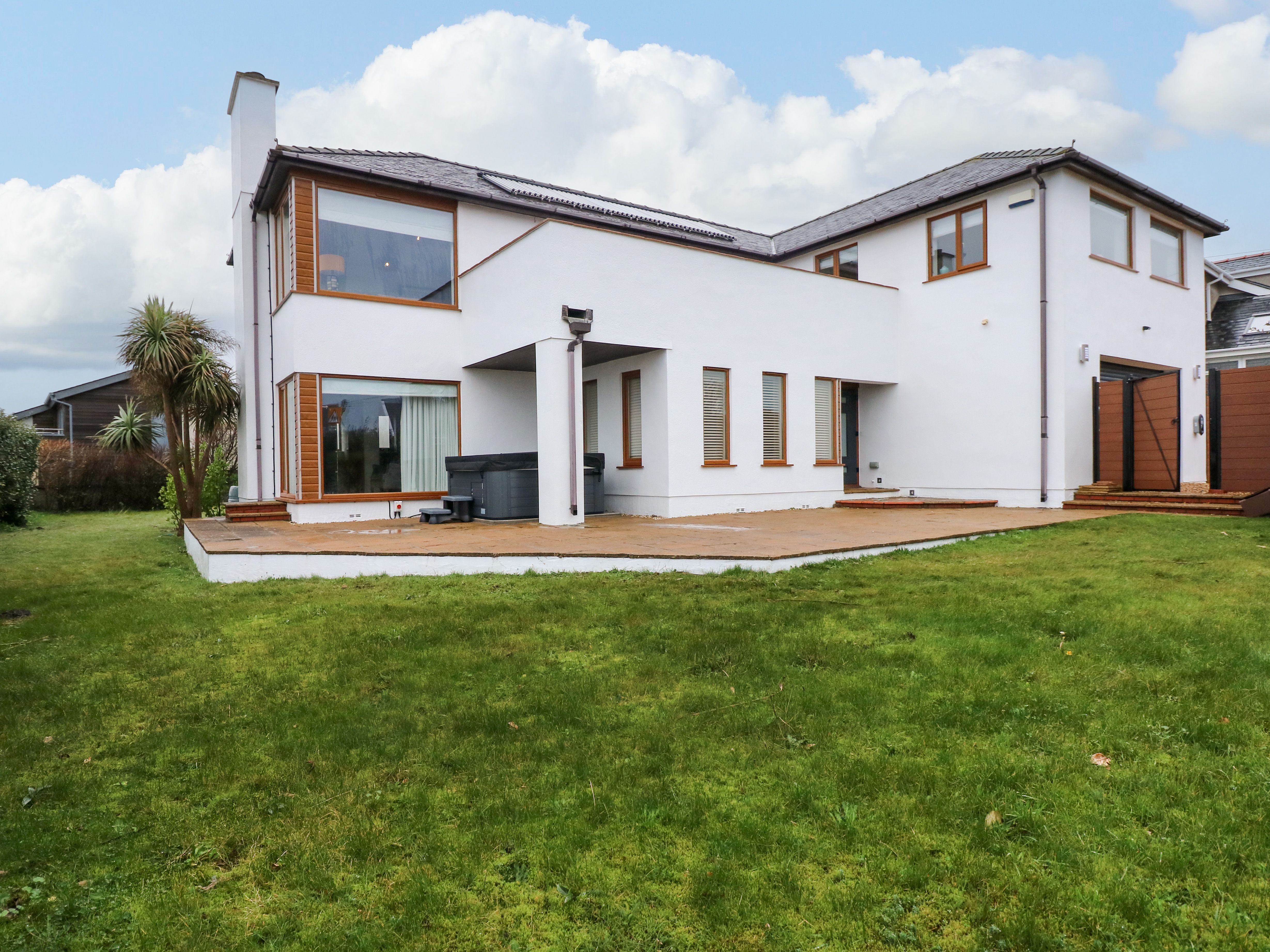 Holiday home Swyn Llyr is reverse-level, consisting of a kitchen with oven, hob, fridge/freezer, dishwasher, a dining area seating twelve people, a sitting area with woodburning stove and Smart TV, a utility with a washing machine, tumble, dryer, two games rooms, and a cinema room. The bedrooms consist of a twin room, a twin (zip/link, can be king-size on request) with Jack-and-Jill access to shower room, a king-size with Smart TV and en-suite, a king-size with en-suite, a first-floor king-size with en-suite, a first-floor king-size with Smart TV and en-suite, serviced by a ground-floor shower room and cloakroom. Outside, there is an enclosed rear and side patio and lawn garden with furniture, hot tub, and off-road parking for 4 cars. Within 0.3 miles you will find a pub and a beach. Two well-behaved pets welcome, but please note that this is a non-smoking property. WiFi, fuel, power, bed linen and towels are all included in the price. Swyn Llyr is a stunning home with sea views in Anglesey.