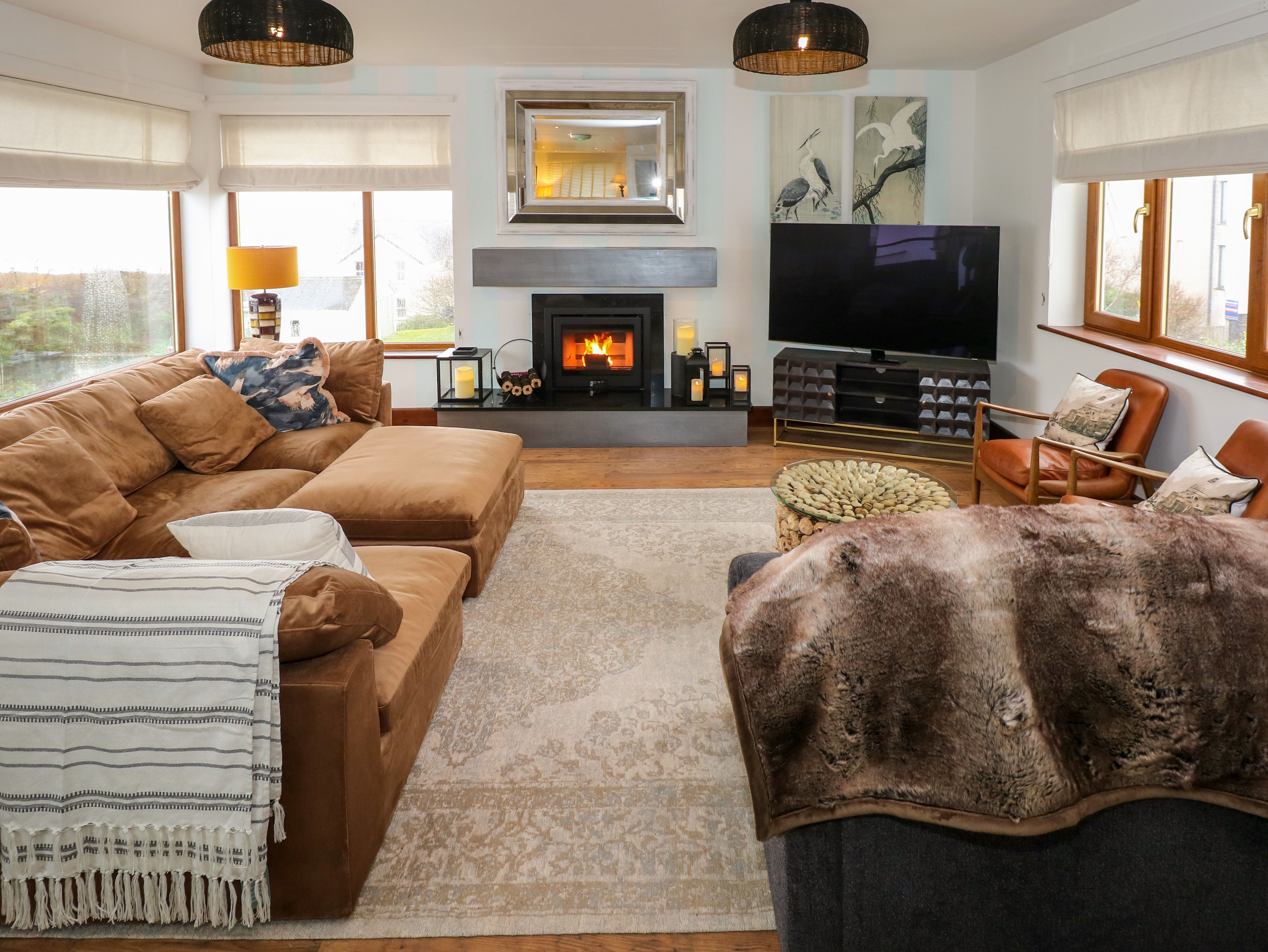 Amenities Oil central heating and underfloor oil central heating. Oven, hob, fridge/freezer, washing machine, tumble, dryer, dishwasher. 5x Smart TV, games room activities, air hockey machine, WiFi. Fuel, power, and starter pack for woodburning stove inc. in rent. Bed linen and towels inc. in rent. Highchair and travel cot available on request. Off-road parking for 4 cars. EV charging for 1 car available on the owner's drive. Enclosed side and rear garden with lawn, patio, furniture, and hot tub. Two well-behaved pet welcome. Sorry, no smoking. Shop 0.2 miles, pub 0.3 miles, beach 0.3 miles