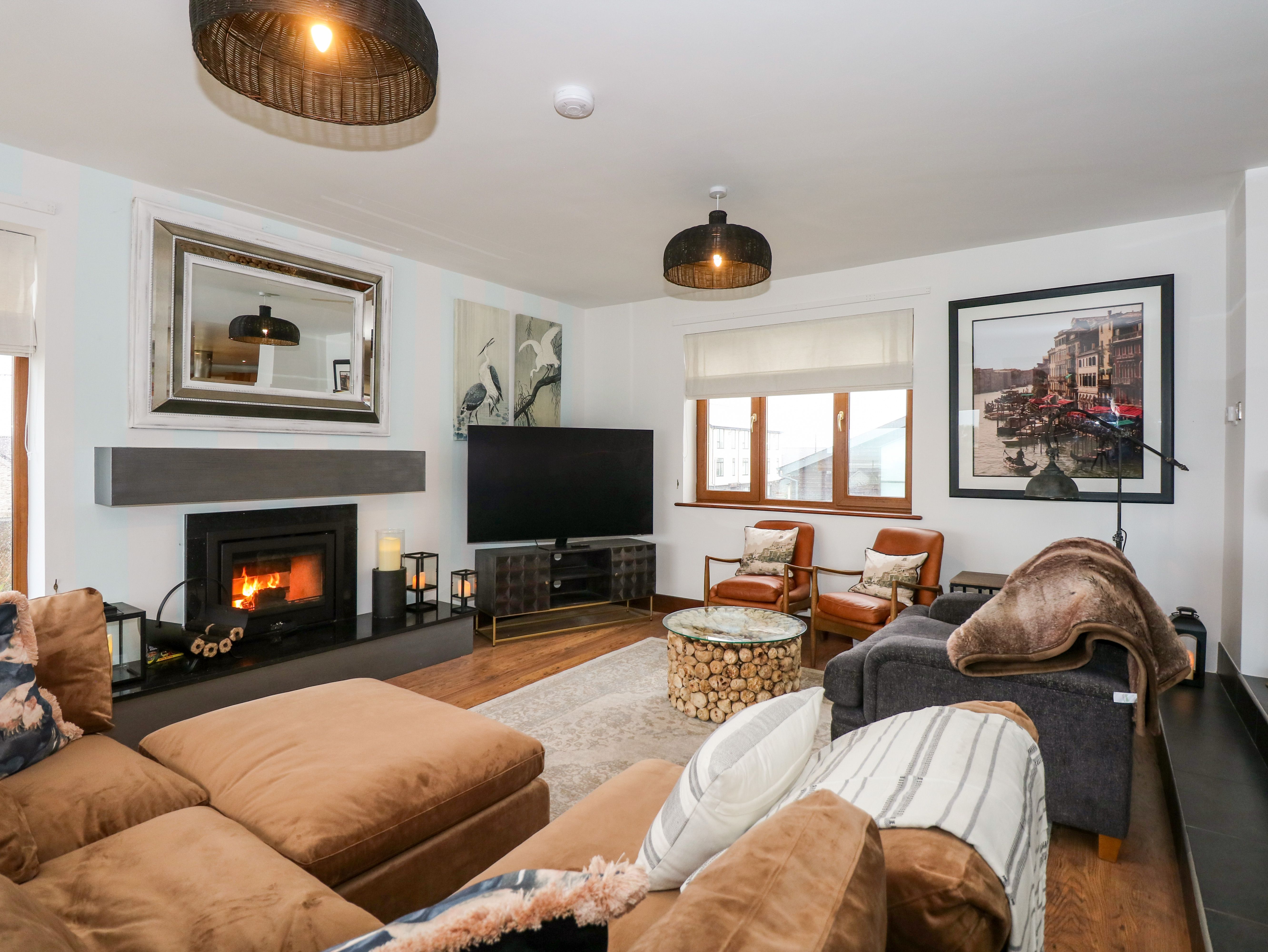 Open-plan living space - kitchen, dining area and lounge with 4K Smart TV, wood burner and balcony. 2 x games room with air hockey table, pin ball machines & 4K Smart TV. Cinema room with 75” 8K Smart TV. Cloakroom with basin and WC. Utility room with washing machine and tumble dryer. Wet room.