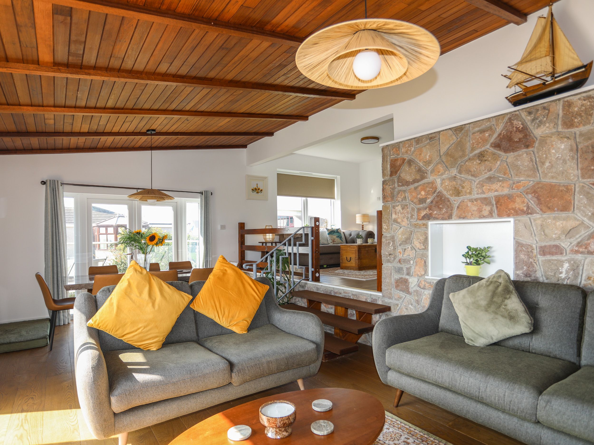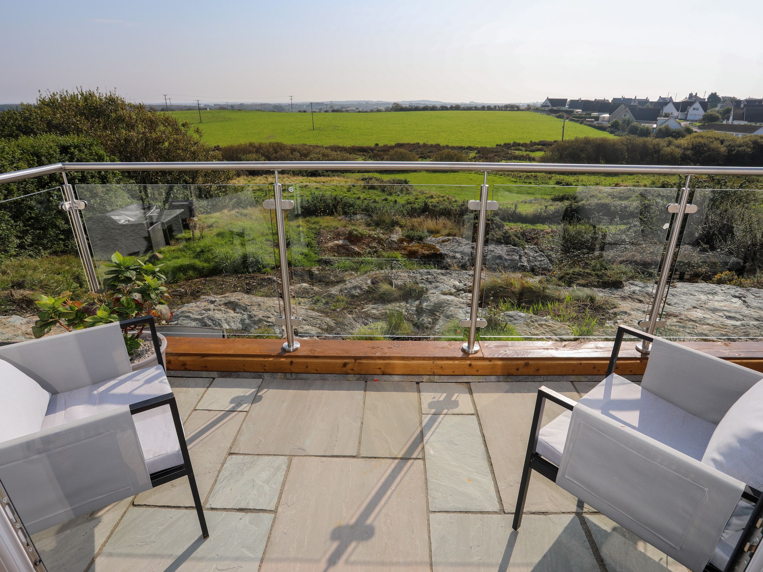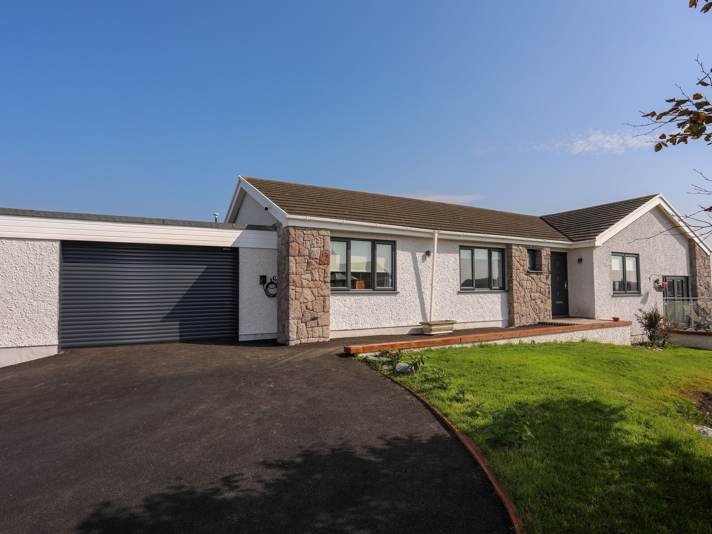 Amenities Electric central heating. 2 x ovens, hob, microwave, fridge/freezer, washing machine, dishwasher. Smart TV, 4 x TVs, WiFi. Fuel and power inc. in rent. Bed linen and towels inc. in rent. Electric car charging point. Highchair and travel cot available. Off-road parking for 4 cars. Wrap-around glass balcony with furniture. Enclosed wrap-around garden. Three well-behaved pets welcome. Sorry, no smoking. Shop 0.8 miles, pub 1 mile, beach 0.9 miles, golf course 0.2 miles. Note: Check-in from 4pm, check-out by 10am. Note: Three steps down from kitchen to living/dining area