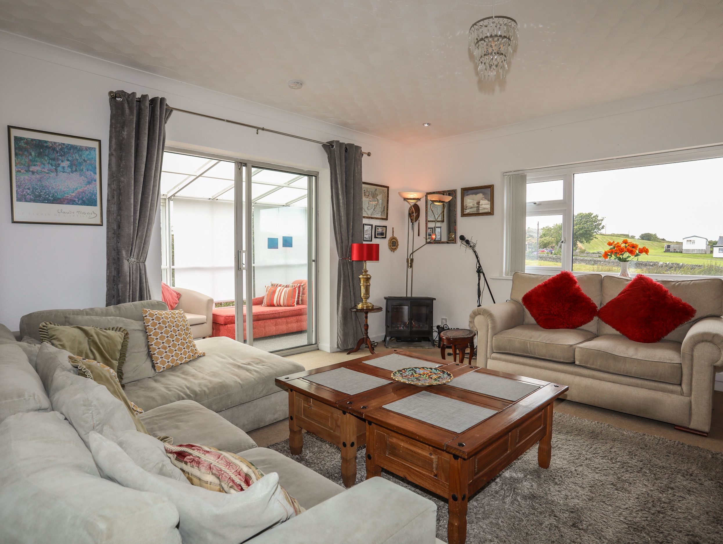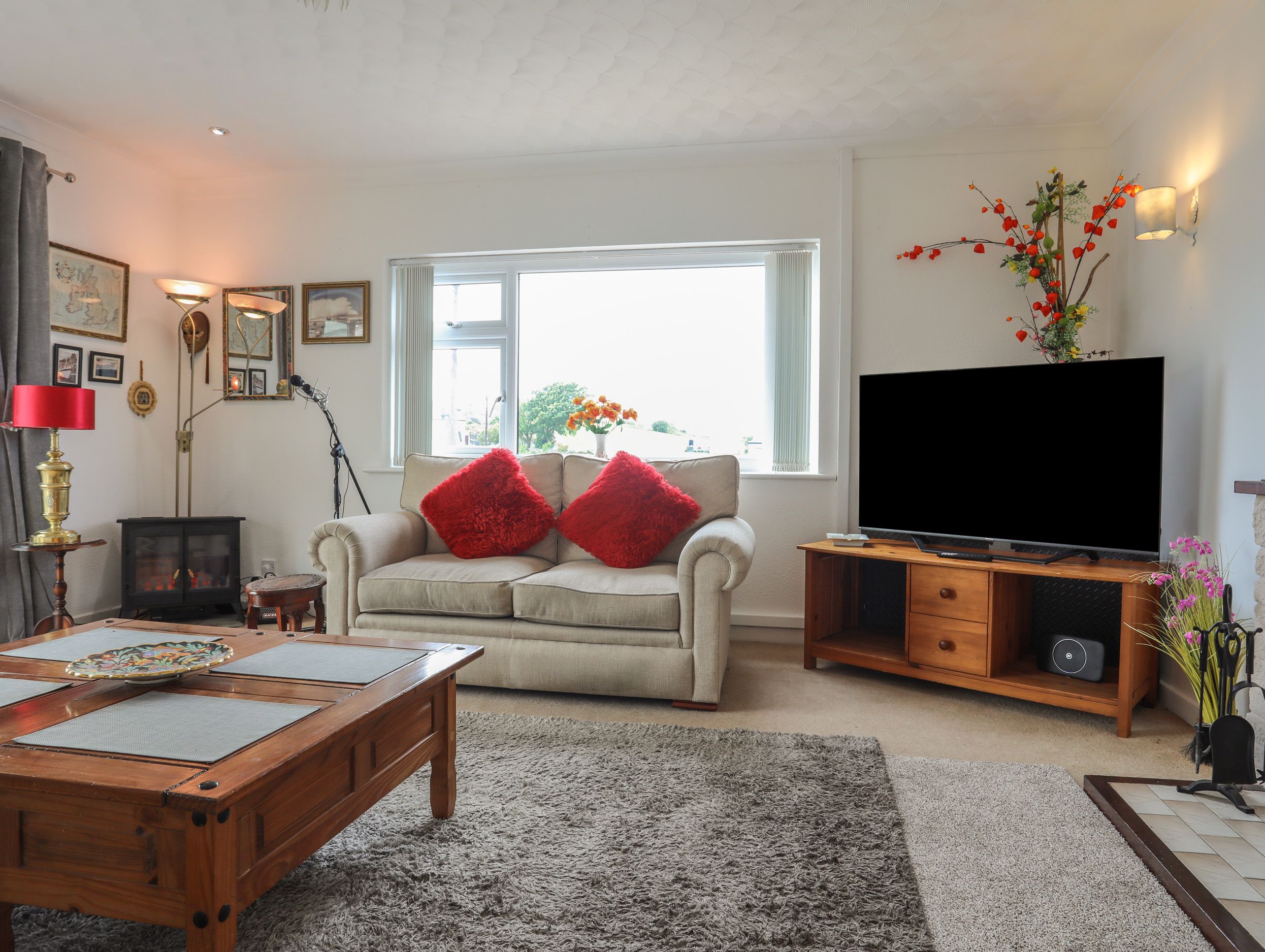 Air source heating with open fire. Solar Panelled Roof. Electric oven and hob, microwave, fridge/freezer, washing machine, dishwasher. Smart TV, WiFi. Fuel and power inc. in rent. Bed linen and towels inc. in rent. Travel cot and highchair available on request. Washing machine and an oven have a childlock. Ample Off-road parking for 3 cars. Front garden with lawns and patio area with patio furniture. Enclosed side garden area. Two well-behaved dogs welcome. Sorry, no smoking. Shop 1.1 miles, pub 0.4 miles. Note: There are both steps and a ramp leading to the patio area. Note: Sitting room includes an electric log-effect fireplace. Please note: This property accommodates bookings with a duration of 3 nights minimum.