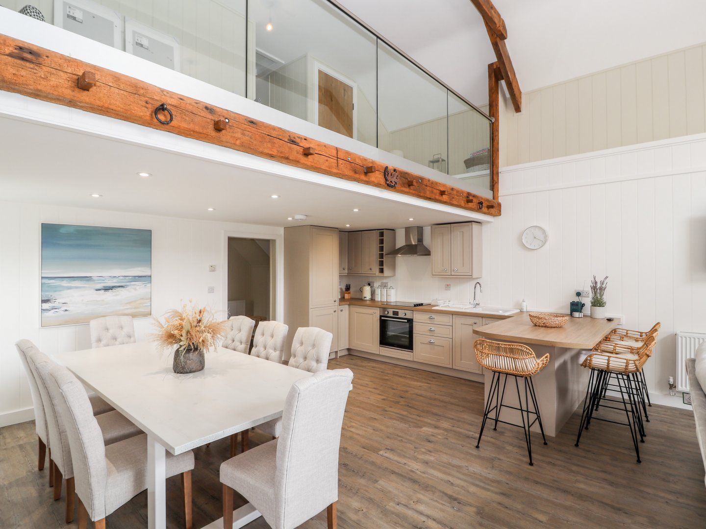 Accomodation Details Four bedrooms: 1 x super-king-size with TV and en-suite walk-in shower, basin and WC, 1 x king-size with TV, 1 x ground-floor king-size with TV, 1 x ground-floor bunk room. Ground-floor bathroom with bath, shower over, basin, heated towel rail and WC. Open-plan living space with kitchen, dining area and sitting area with woodburning stove