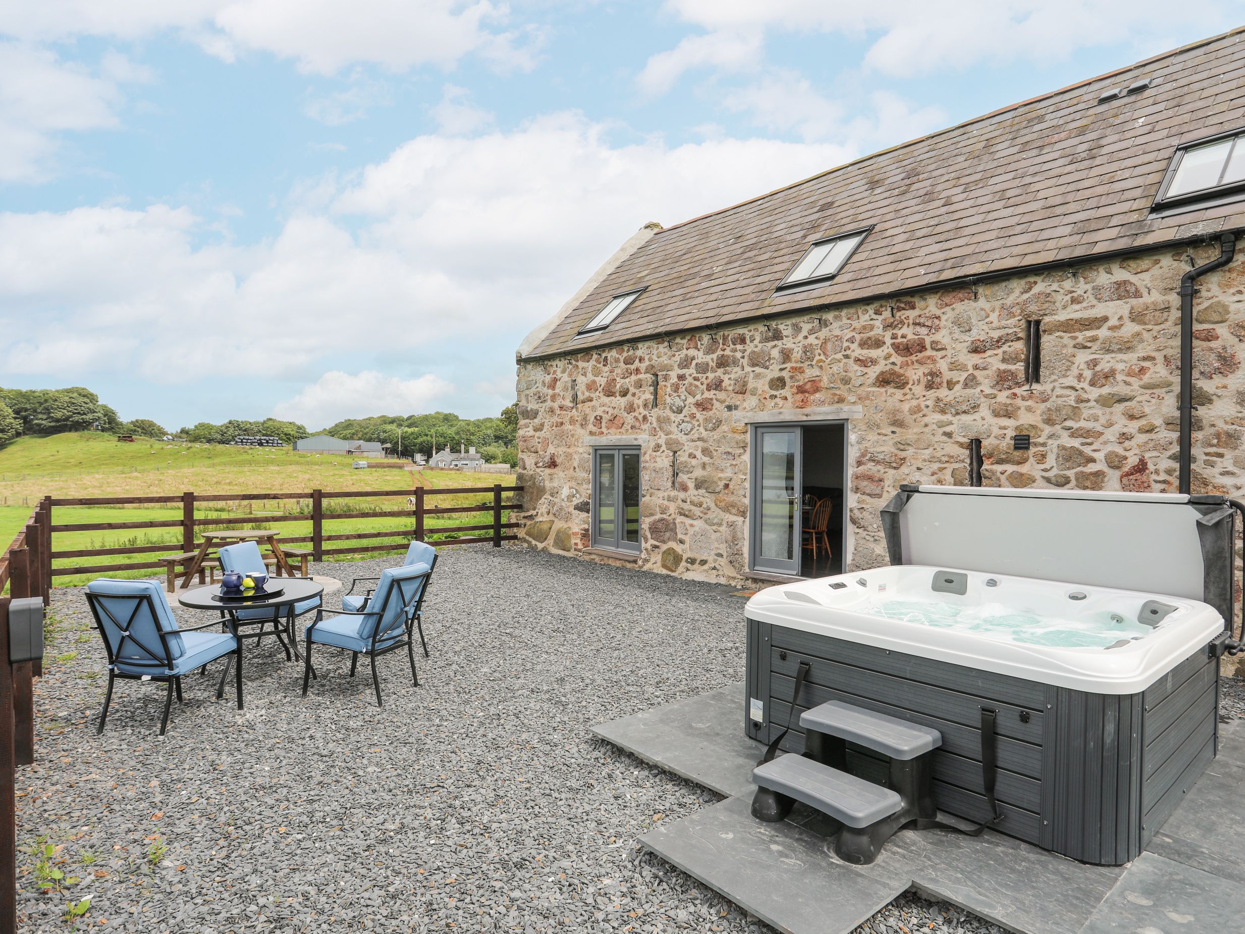 Amenities Ground source heating. Oven, hob, microwave, fridge, freezer, washing machine, dishwasher, kettle, toaster. Smart TV and WiFi. Fuel and power inc. in rent. Bed linen and towels inc. in rent. Travel cot and stairgate, high chair available on request. Off-road parking for 2 cars. Enclosed rear garden with gravel, hot tub and picnic bench. Two well-behaved pets welcome. Sorry, no smoking. Shop 1.5 miles, pub 1.6 miles. beach pavilion 1.1 miles