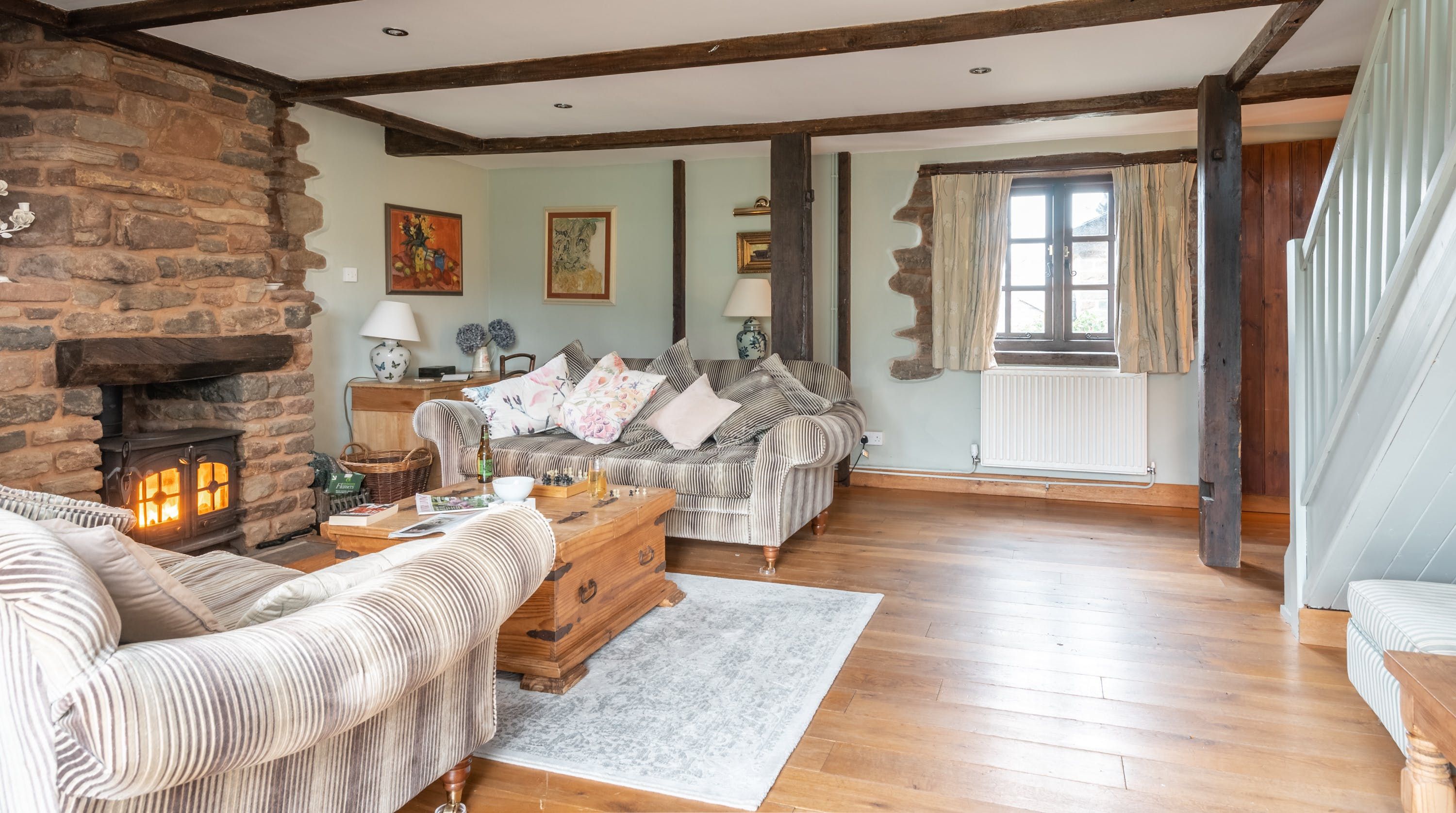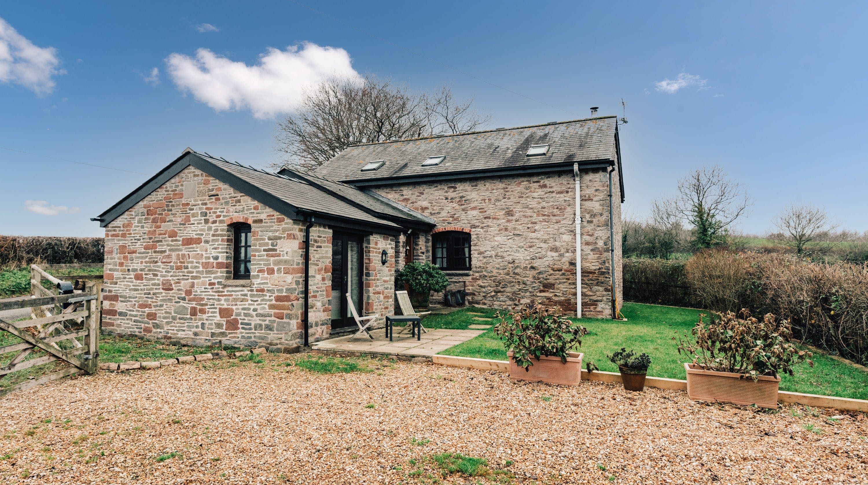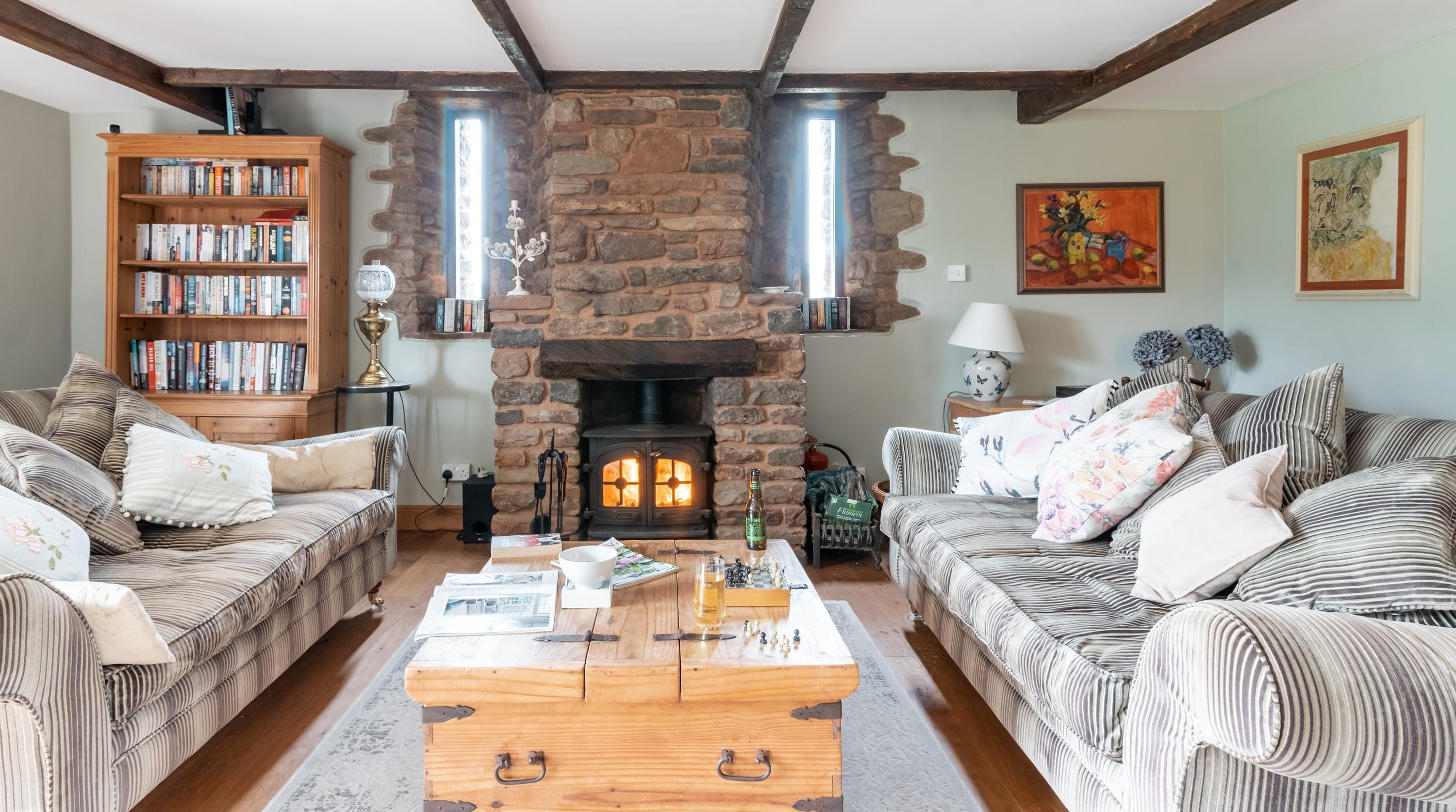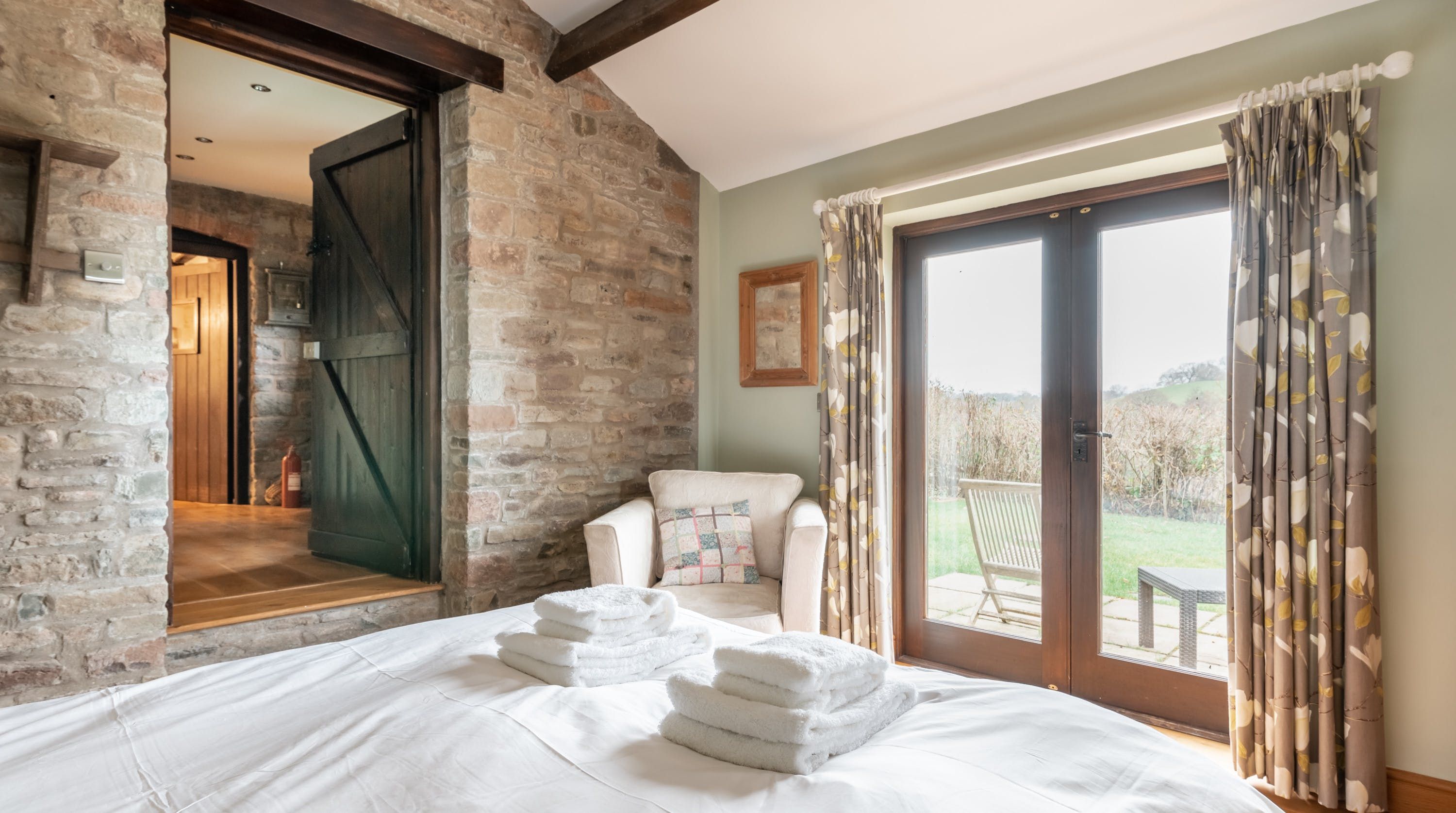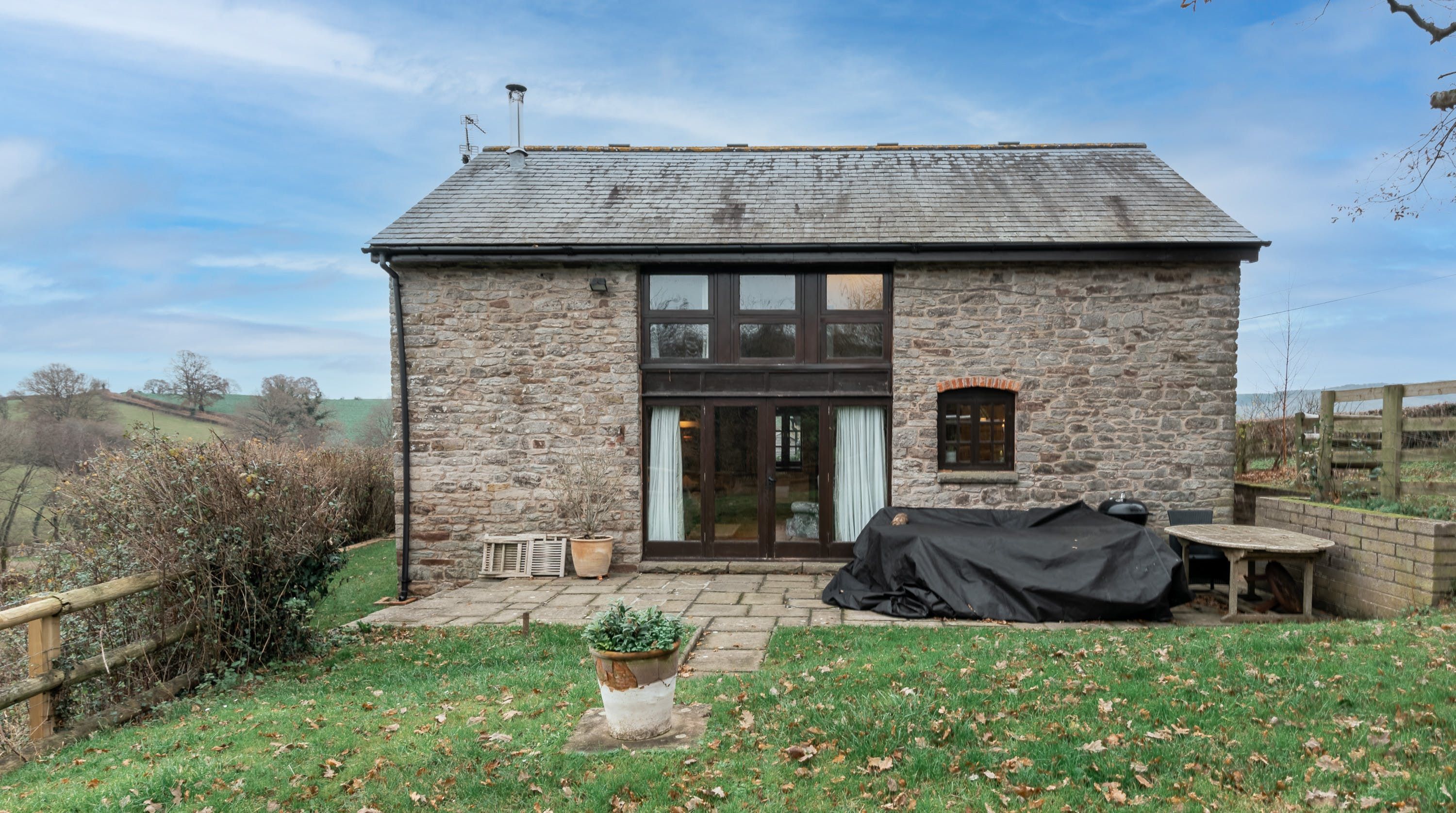 Rolling countryside as far as the eye can see and quaint villages tucked into the valleys of Monmouthshire on your doorstep – this converted stone barn is an idyllic getaway. It’s a six-minute drive to the centre of Raglan where you can explore castle ruins, pop in to one of the cosy pubs or stock up at the traditional butcher and the local village shop. Further afield you’ll find the charming market town of Monmouth a fifteen-minute drive away. The home is blissfully quiet, with nothing but the occasional bleat of sheep or whinny of a horse in the surrounding fields. Out here, away from it all, you can see the canopy of stars from the private garden. During the day, this spot is perfect for a family barbecue, with dining on the patio. Inside, it’s open-plan living made cosy with a wood-burning stove set in the old stone wall of the living room. Period features like the old timber frame and arrow-slit windows have been retained, showing off the age of the building. The Aga and Belfast sink in the kitchen keep that farmhouse feel, perfect when paired with farm-fresh produce from the hole-in-the-wall farm shop just down the road.