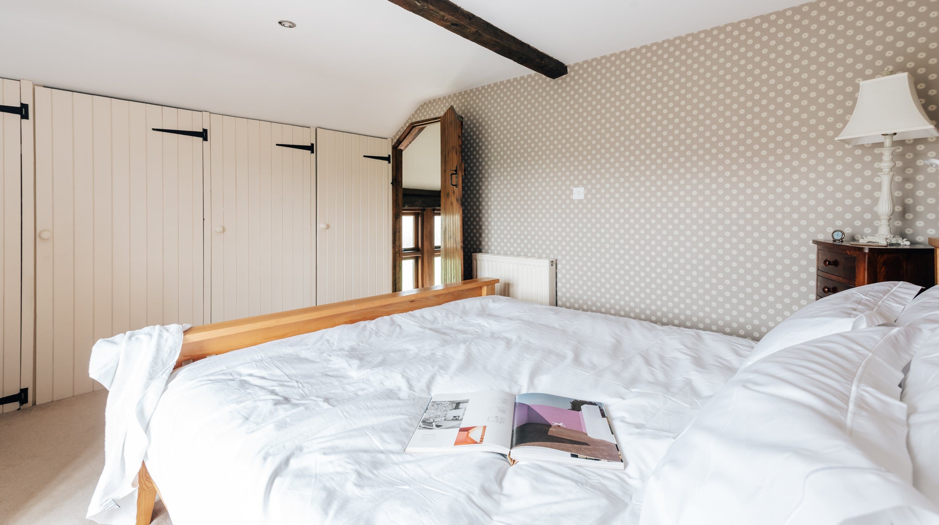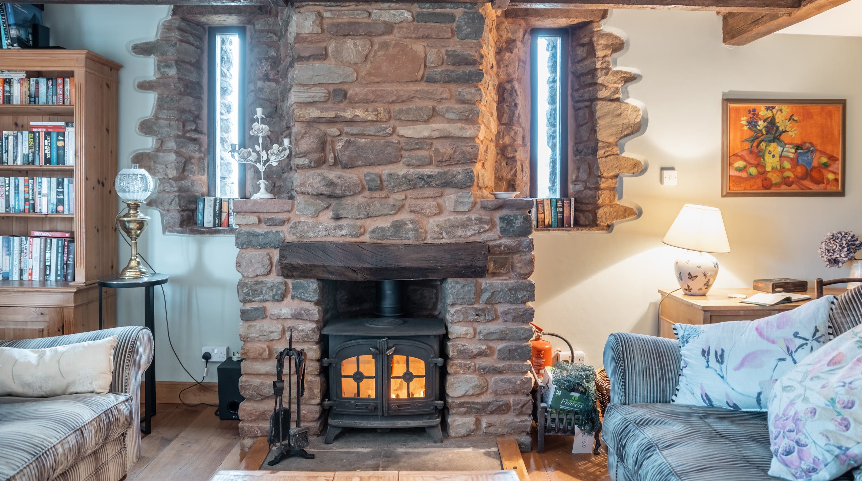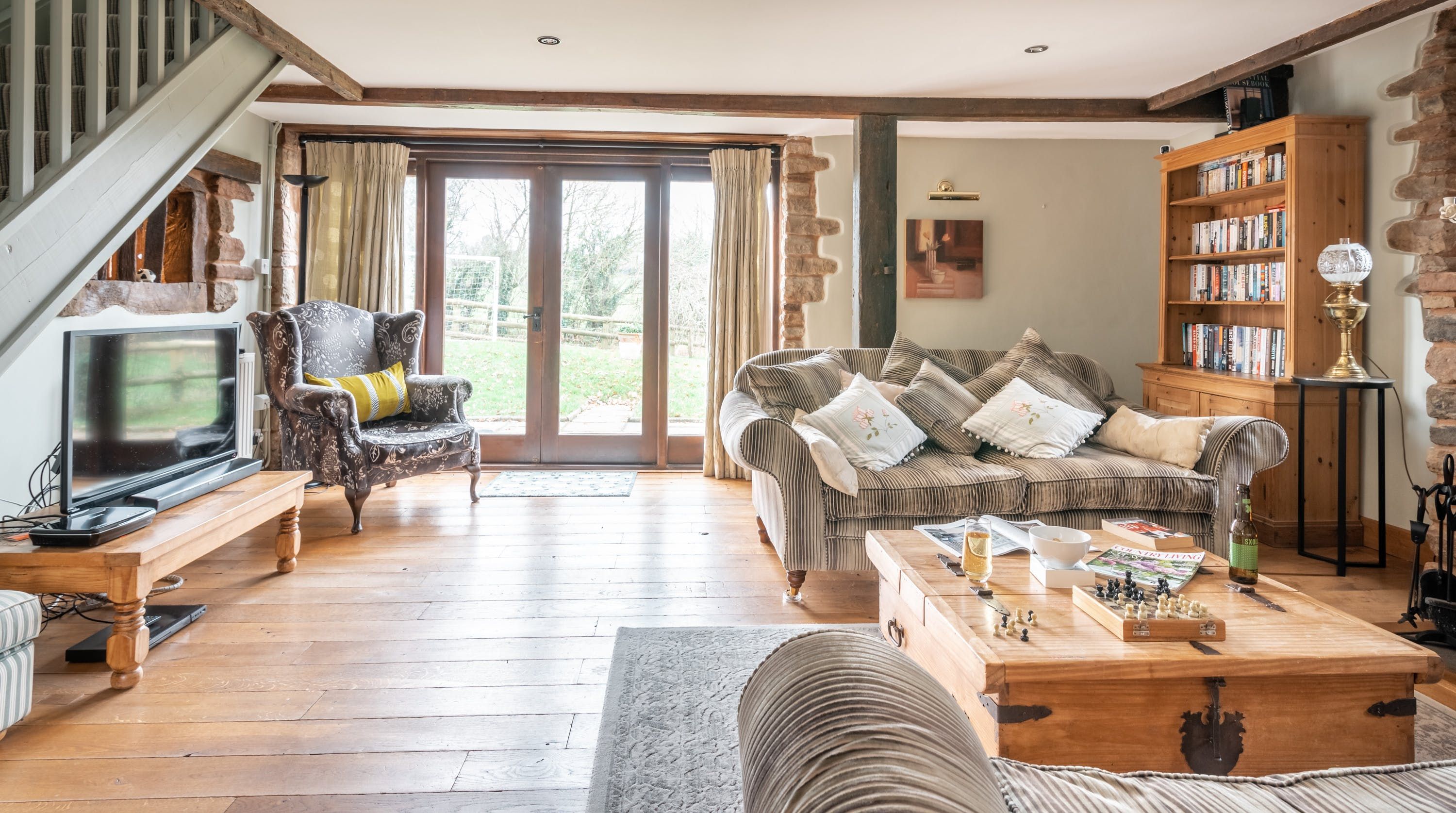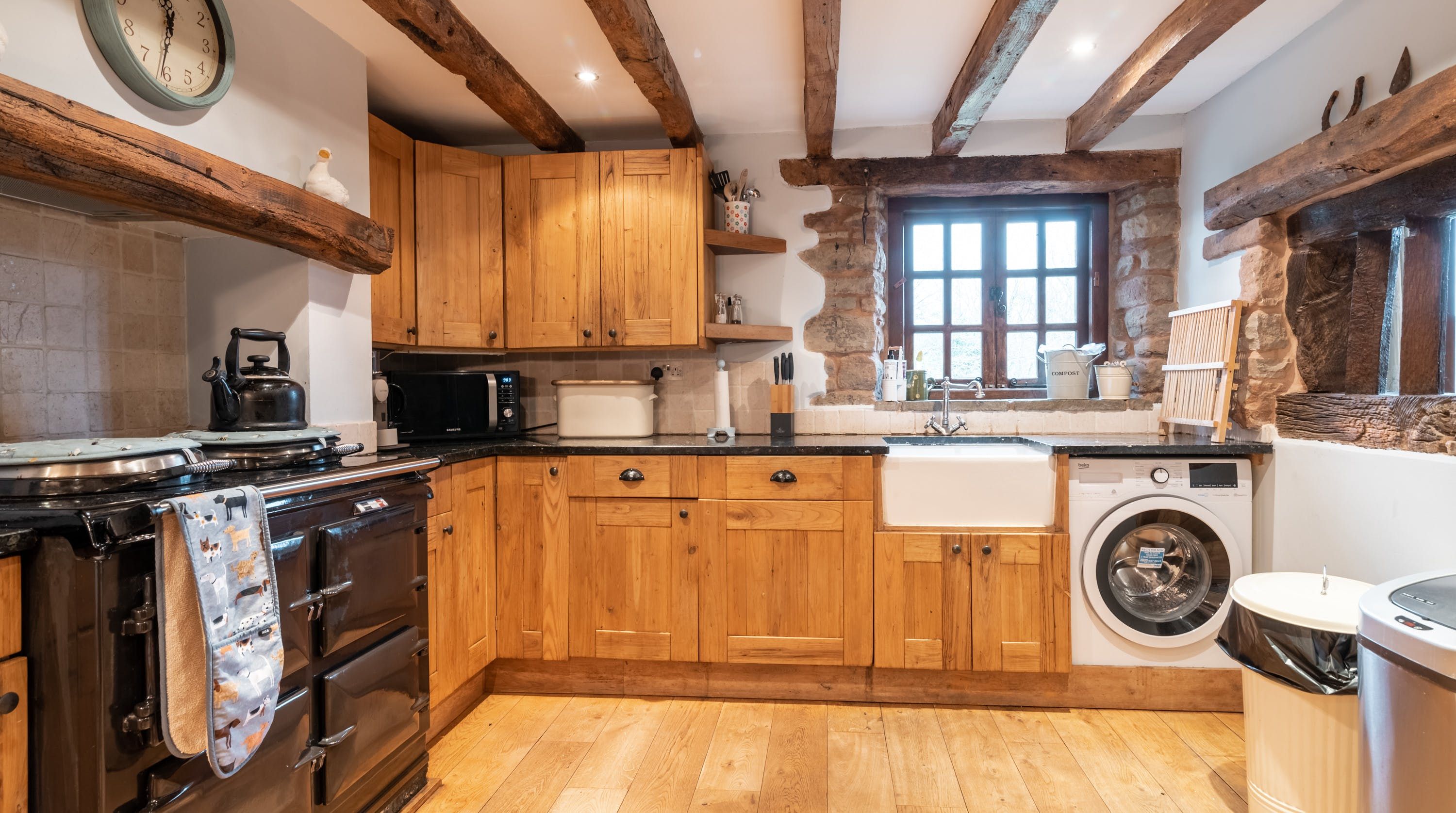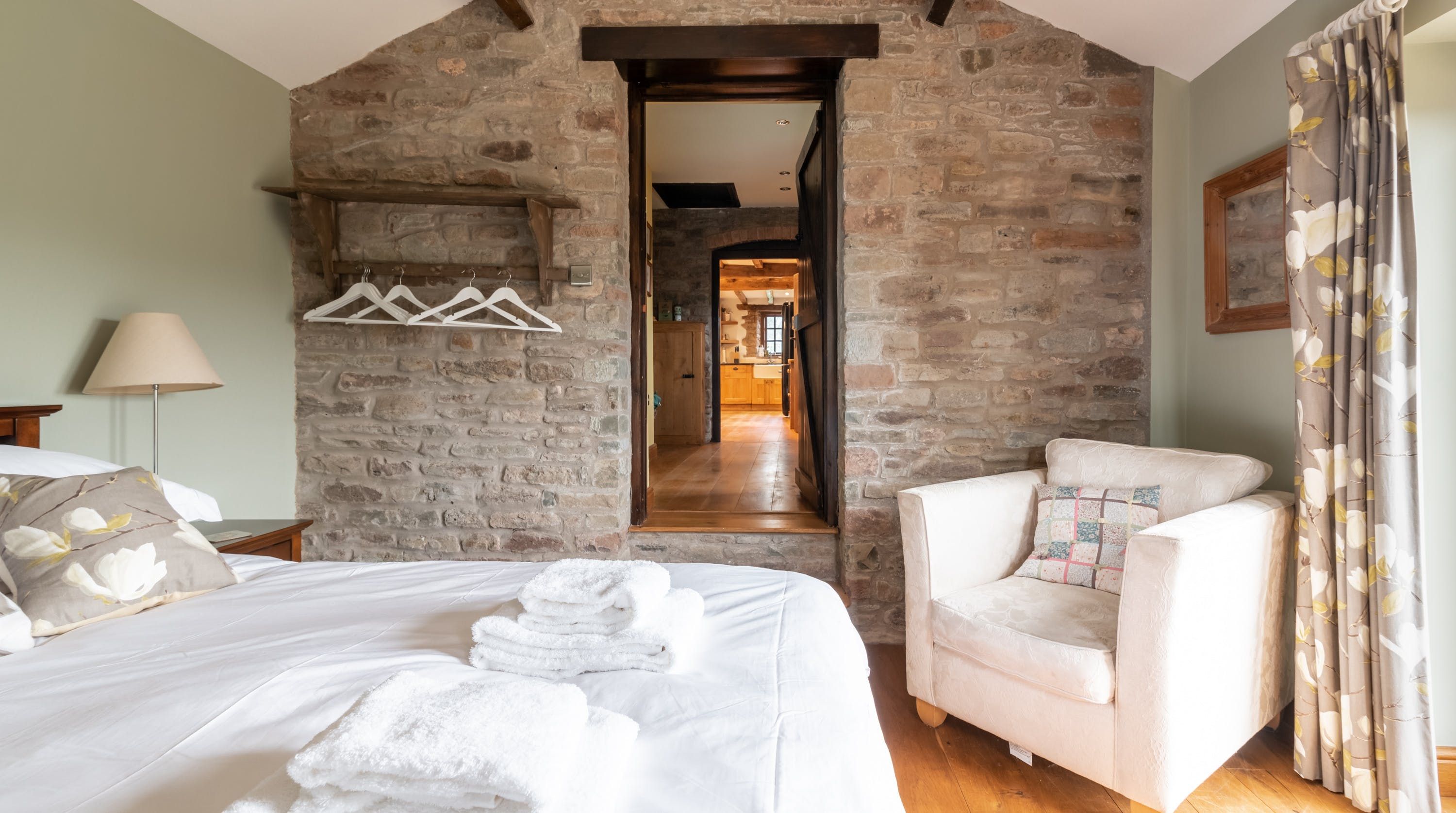 Rolling countryside as far as the eye can see and quaint villages tucked into the valleys of Monmouthshire on your doorstep – this converted stone barn is an idyllic getaway. It’s a six-minute drive to the centre of Raglan where you can explore castle ruins, pop in to one of the cosy pubs or stock up at the traditional butcher and the local village shop. Further afield you’ll find the charming market town of Monmouth a fifteen-minute drive away. The home is blissfully quiet, with nothing but the occasional bleat of sheep or whinny of a horse in the surrounding fields. Out here, away from it all, you can see the canopy of stars from the private garden. During the day, this spot is perfect for a family barbecue, with dining on the patio. Inside, it’s open-plan living made cosy with a wood-burning stove set in the old stone wall of the living room. Period features like the old timber frame and arrow-slit windows have been retained, showing off the age of the building. The Aga and Belfast sink in the kitchen keep that farmhouse feel, perfect when paired with farm-fresh produce from the hole-in-the-wall farm shop just down the road.